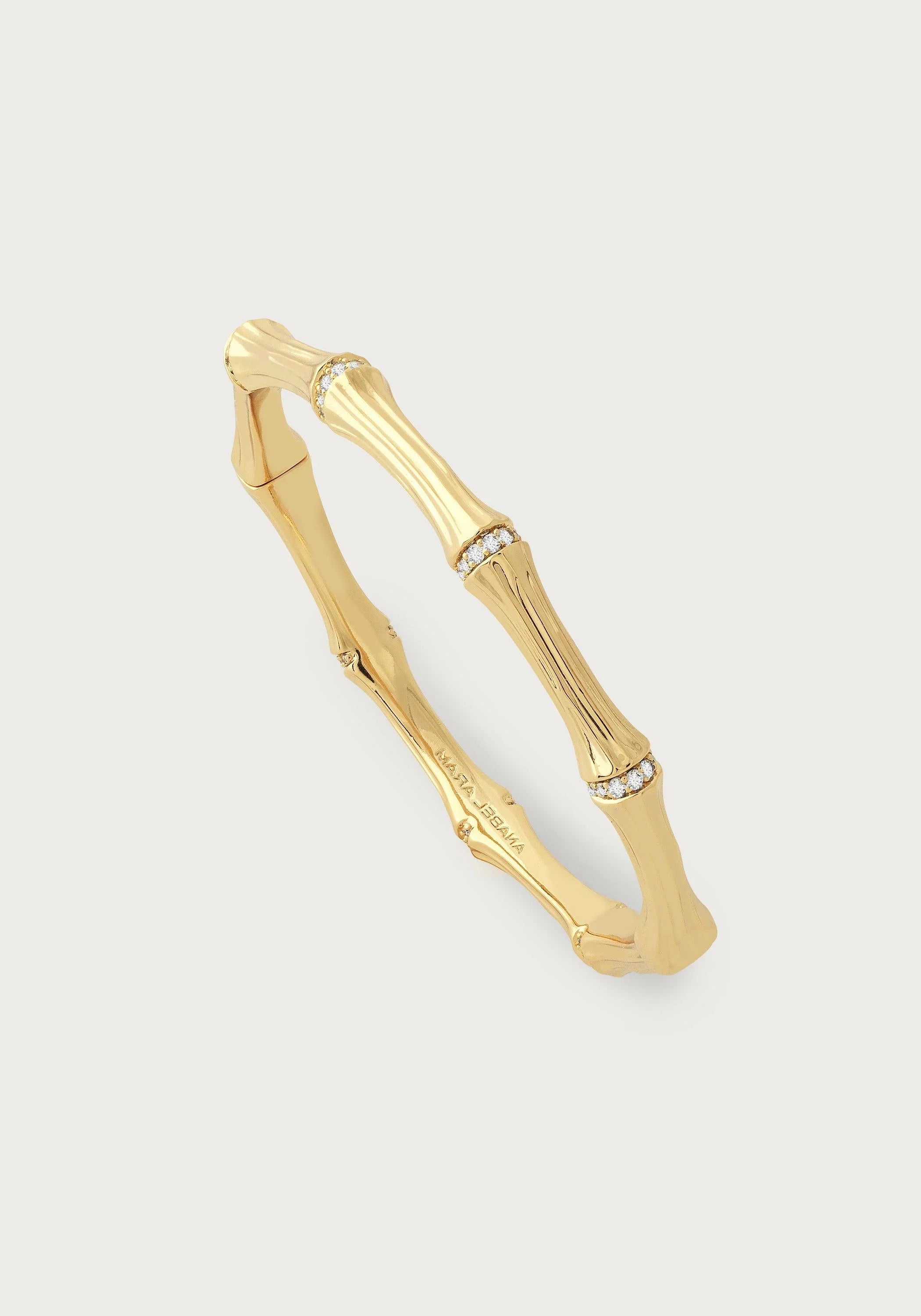 Elevate your everyday looks with the radiant allure of this bamboo hinged bangle, a testament to timeless sophistication. Crafted from sumptuous 18k gold-dipped brass, the bangle is sculpted to perfection, adorned with sparkling crystals that catch the light with every movement. Its secure hidden clasp, reminiscent of the finest jewelry craftsmanship, ensures both elegance and ease of wear, making it a refined accessory for any occasion. In the realm of accessories, this bamboo hinged bangle stands out as an exceptional piece of artistry. The intricacy of the sculpted design and the shimmering crystals culminate in a perfect union of glamour and versatility. The hidden clasp adds an element of mystery and refinement, making this bangle a stunning addition to your collection. Whether paired with casual or formal attire, it promises to be the perfect touch of sophistication, adding a radiant sparkle to your daily ensembles.