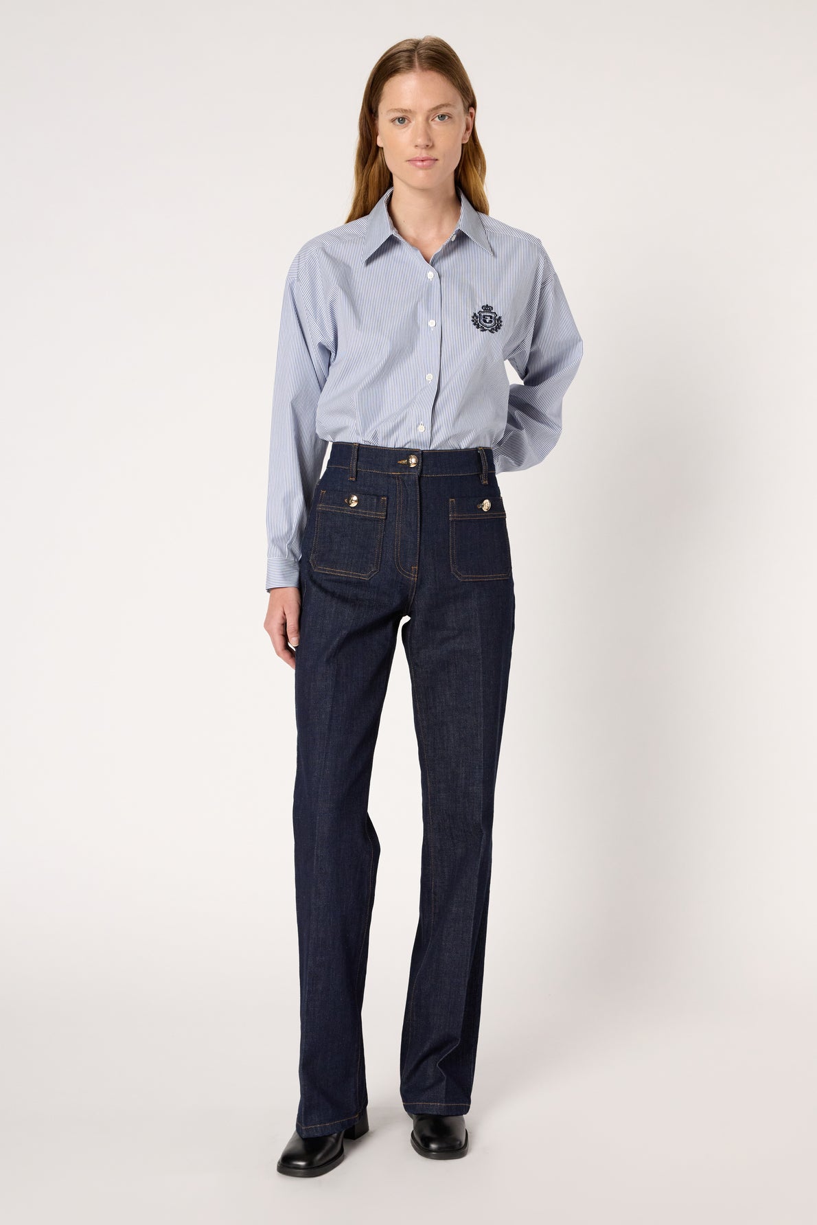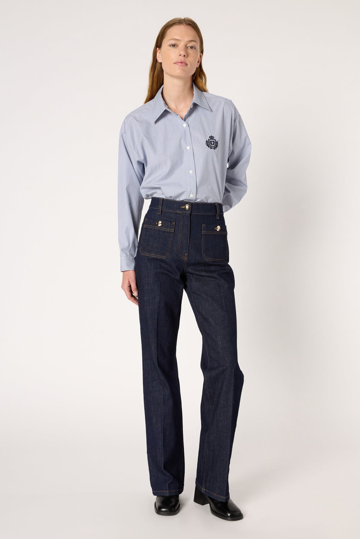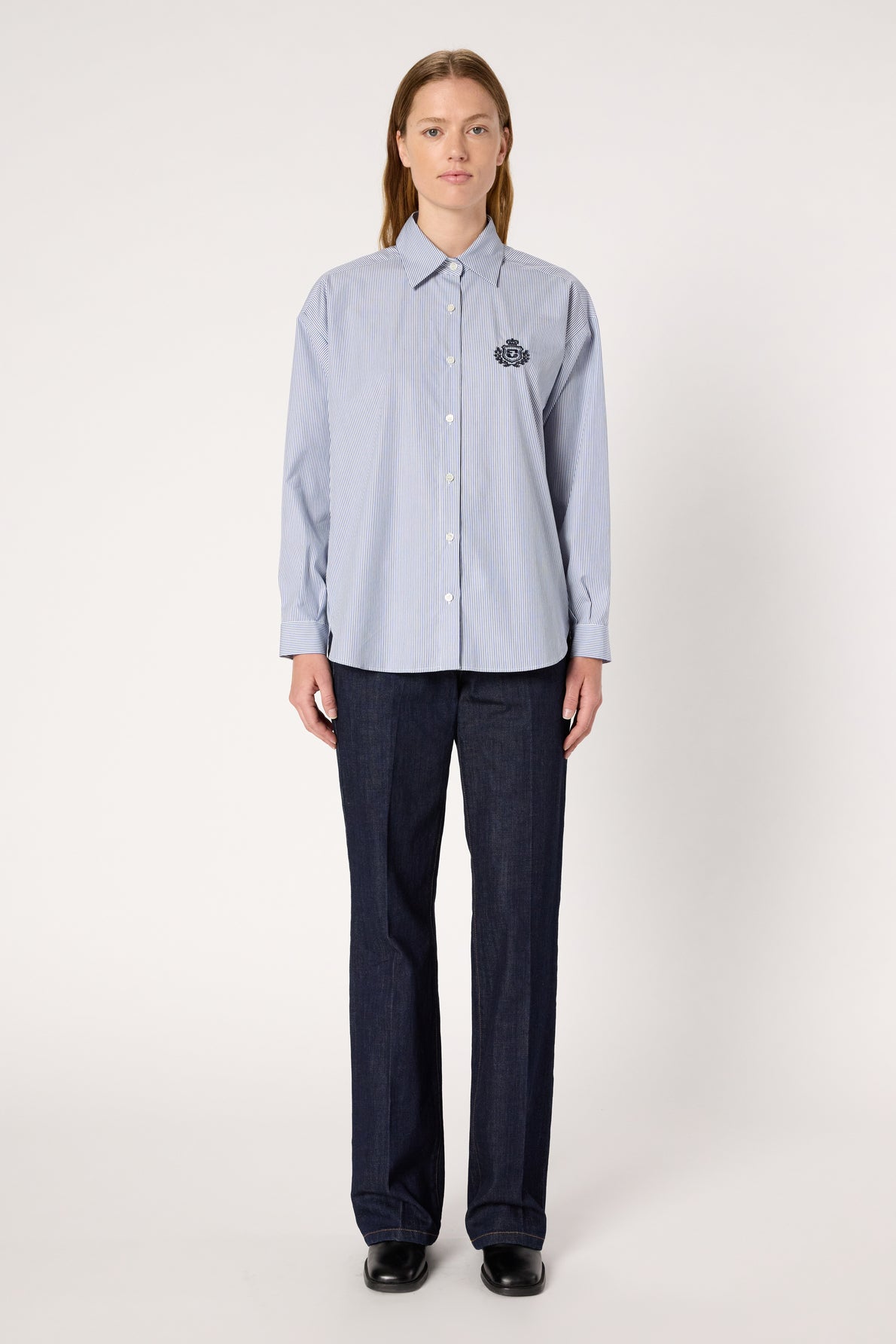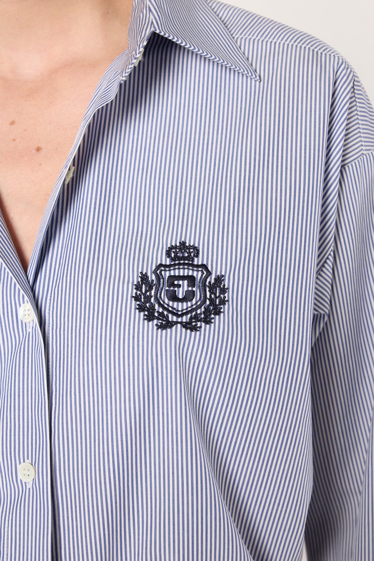 BLUE AND WHITE STRIPED POPLIN SHIRT WITH EMBROIDERED COAT-OF-ARMS ON CHEST POCKET FOR A SOPHISTICATED PREPPY LOOK. 100% COTTON.