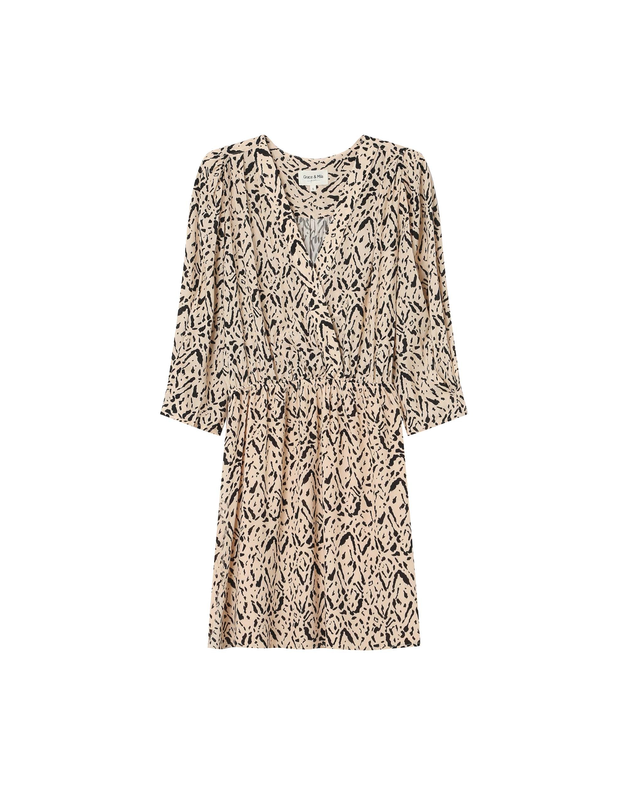 The short Suzie dress is made in a fabric with abstract patterns for a graphic and feminine look.The straight cut, the cross -neck and the details of folds to the shoulders and the sleeves add refinement and elegance to the model.The Suzie patterned dress has 3/4 sleeves and an elasticated size that draw a structured and chic silhouette.