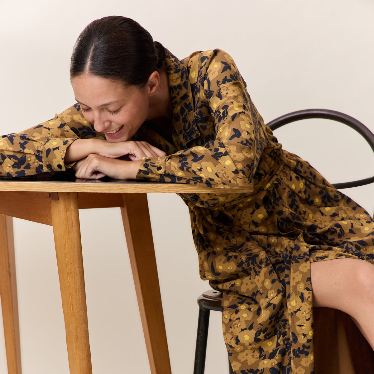 The Reda Flower dress offers a retro-chic interpretation of the feminine silhouette with a midi cut and floral print. The shirt collar, structured by a buttoned wrap closure, highlights the precise craftsmanship of the finishing touches