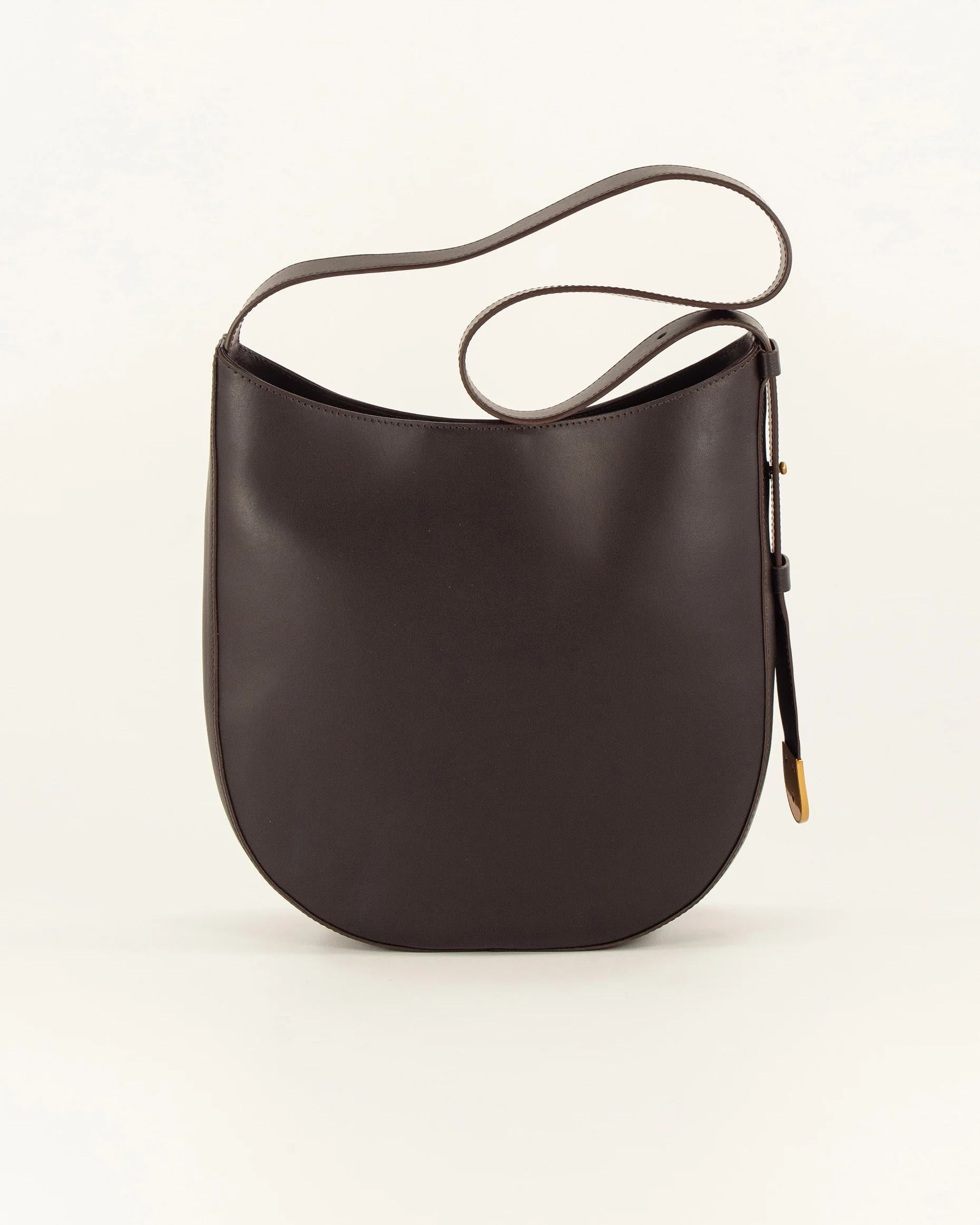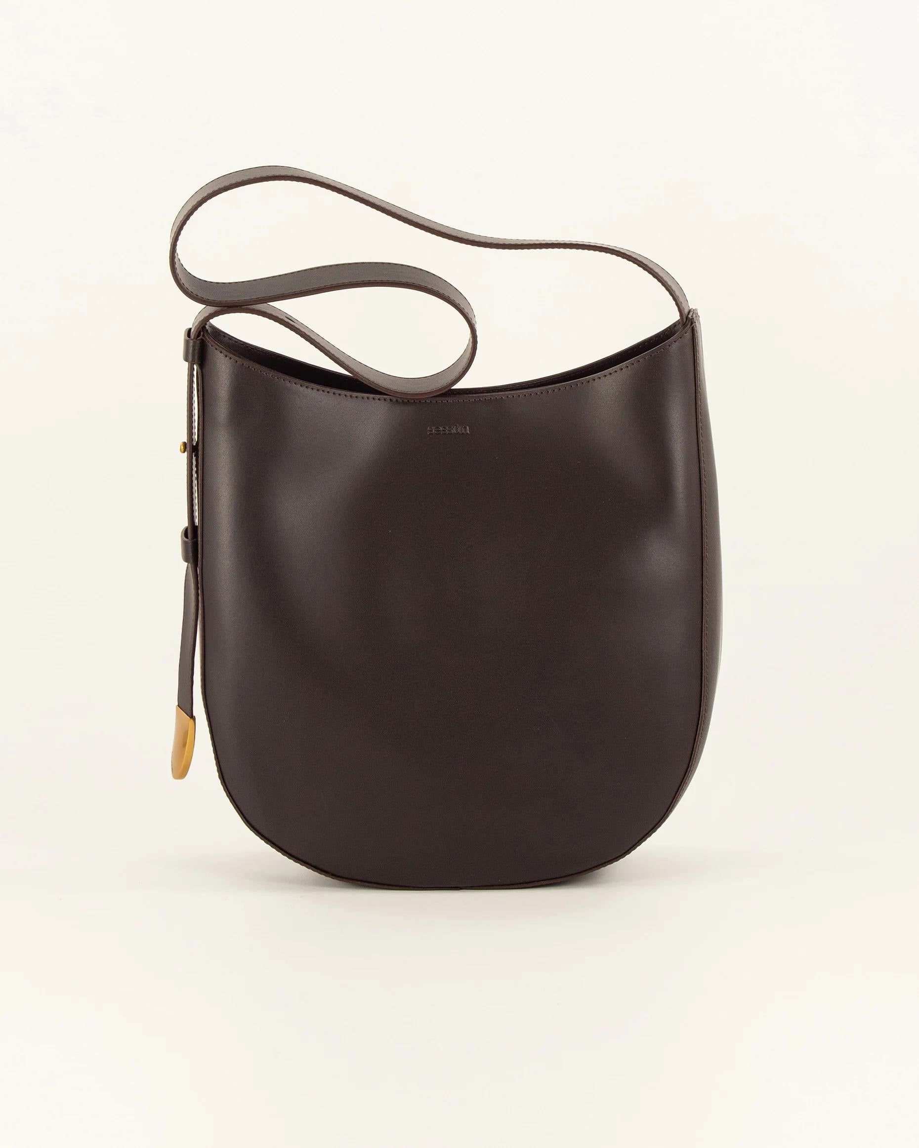 Cow leather hobo bag featuring an adjustable shoulder strap with a collar stud system. Sessn engraved metal tip, developed exclusively by Sessn.