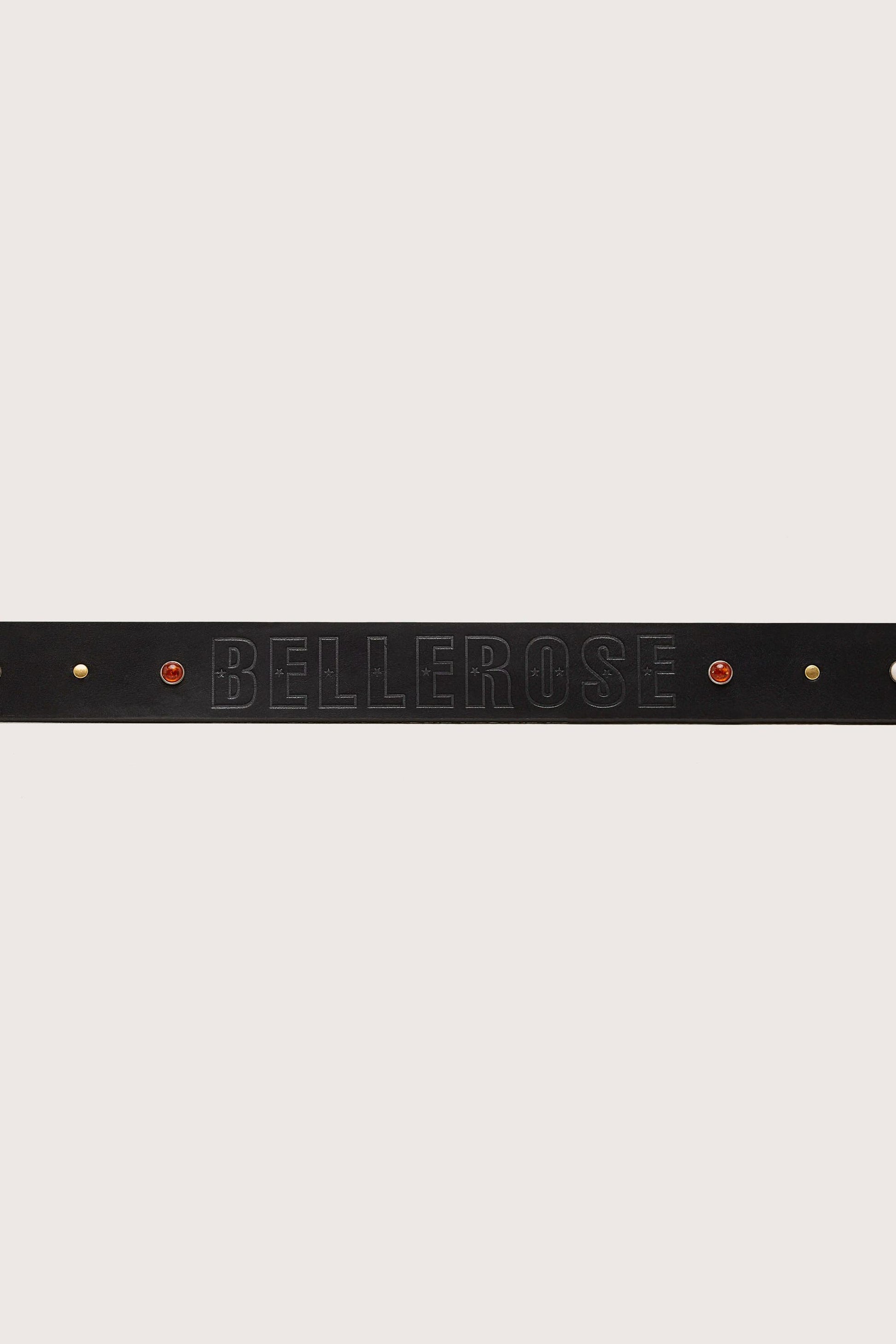 Classic belt made from black leather with a silver 8-shaped buckle, Bellerose embossed logo in the back and stone-incrusted studs.