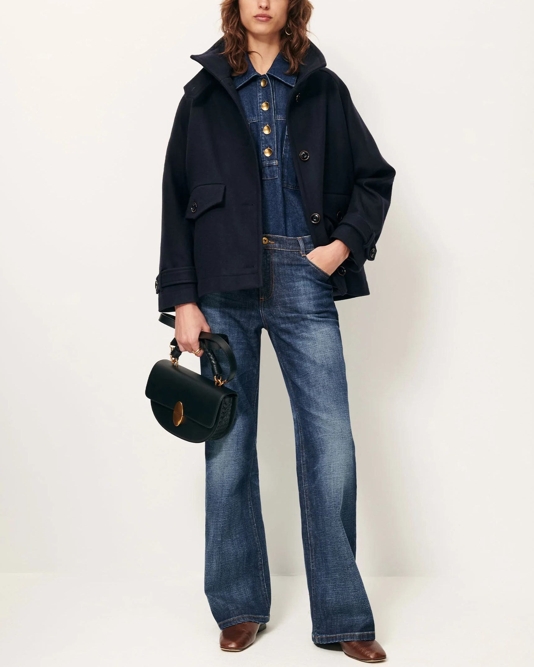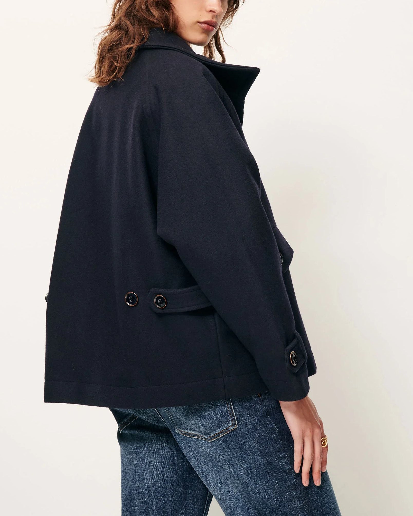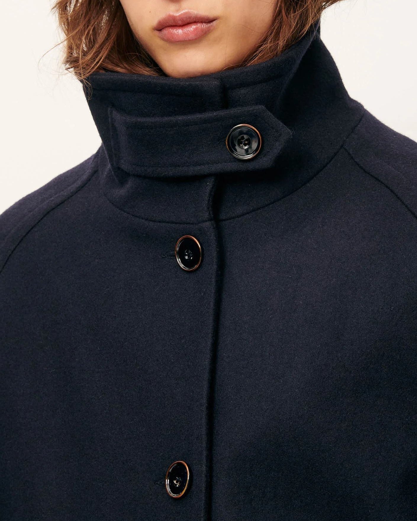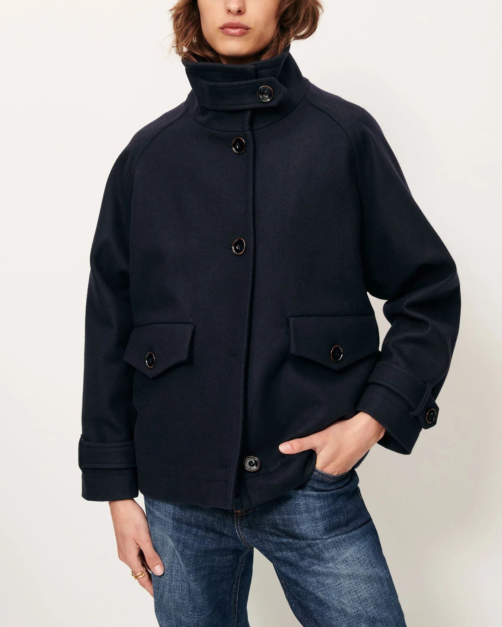 Blouson-style coat with a high collar and raglan sleeves in a wool fabric, woven in Italy.