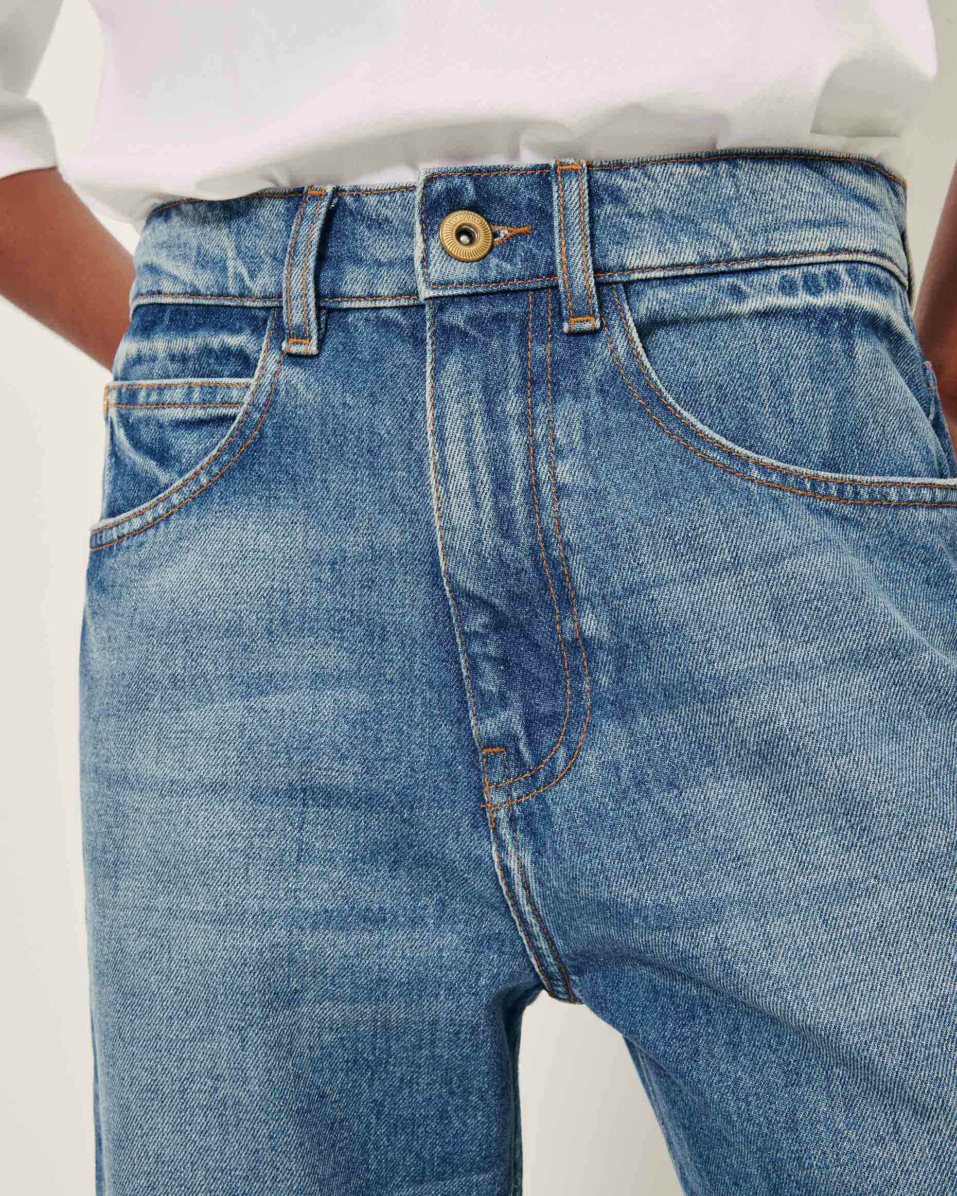 Mid-rise straight-leg jeans, relaxed fit, in authentic-look stonewash denim.