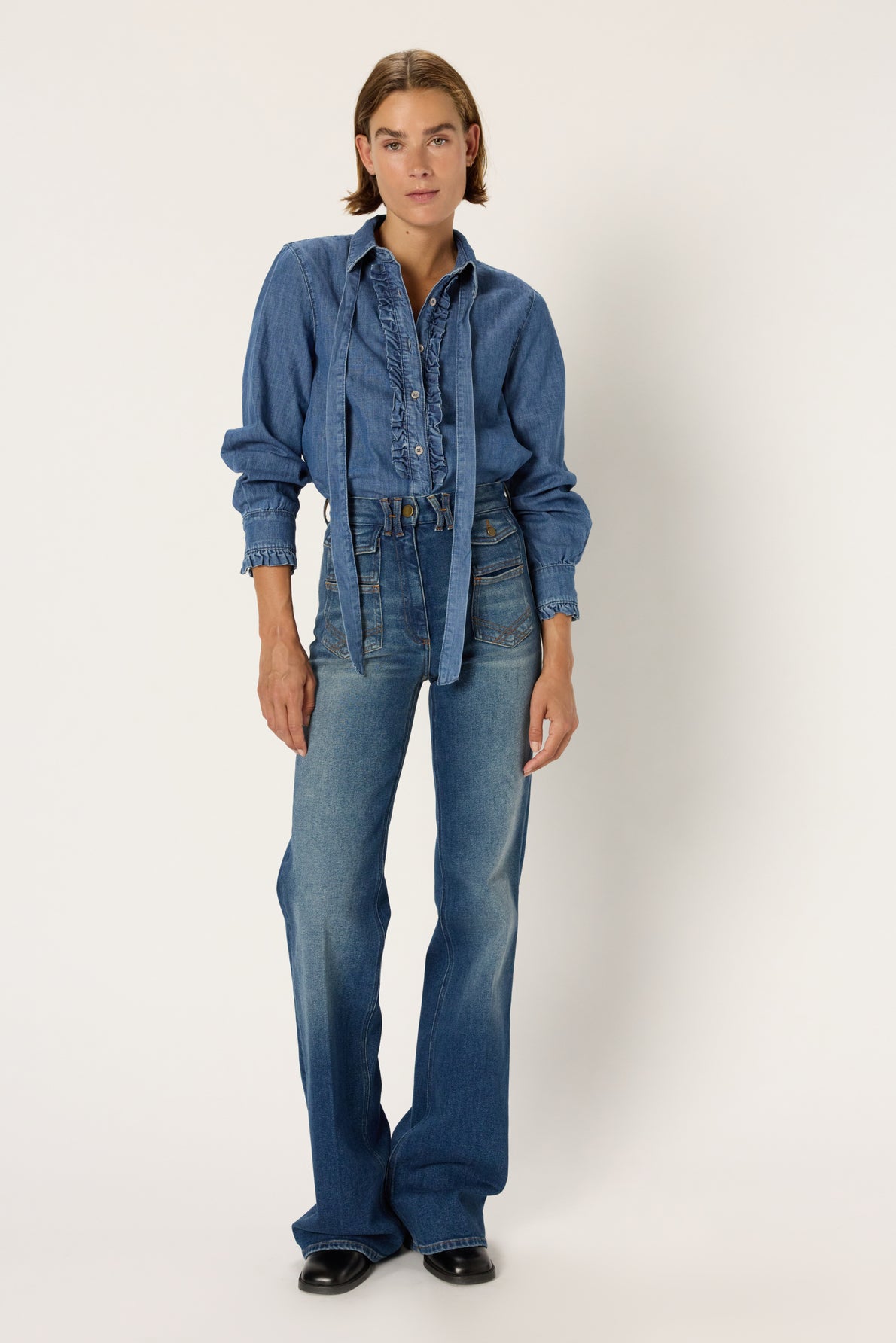 DENIM SHIRT WITH JABOTS AND NECK BOW THAT GIVE THIS CASUAL GARMENT A ROMANTIC, CHIC TWIST 100% COTTON.
