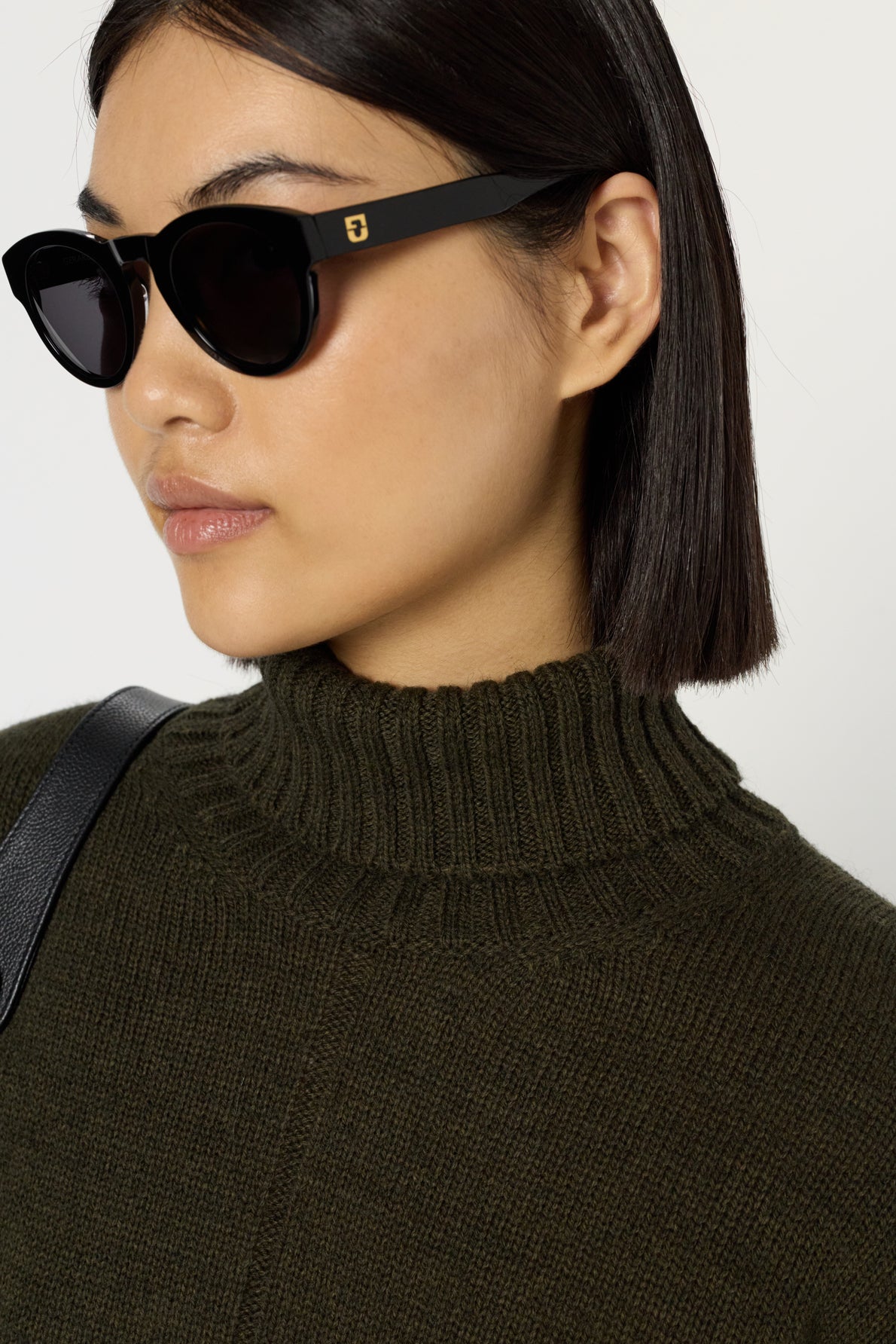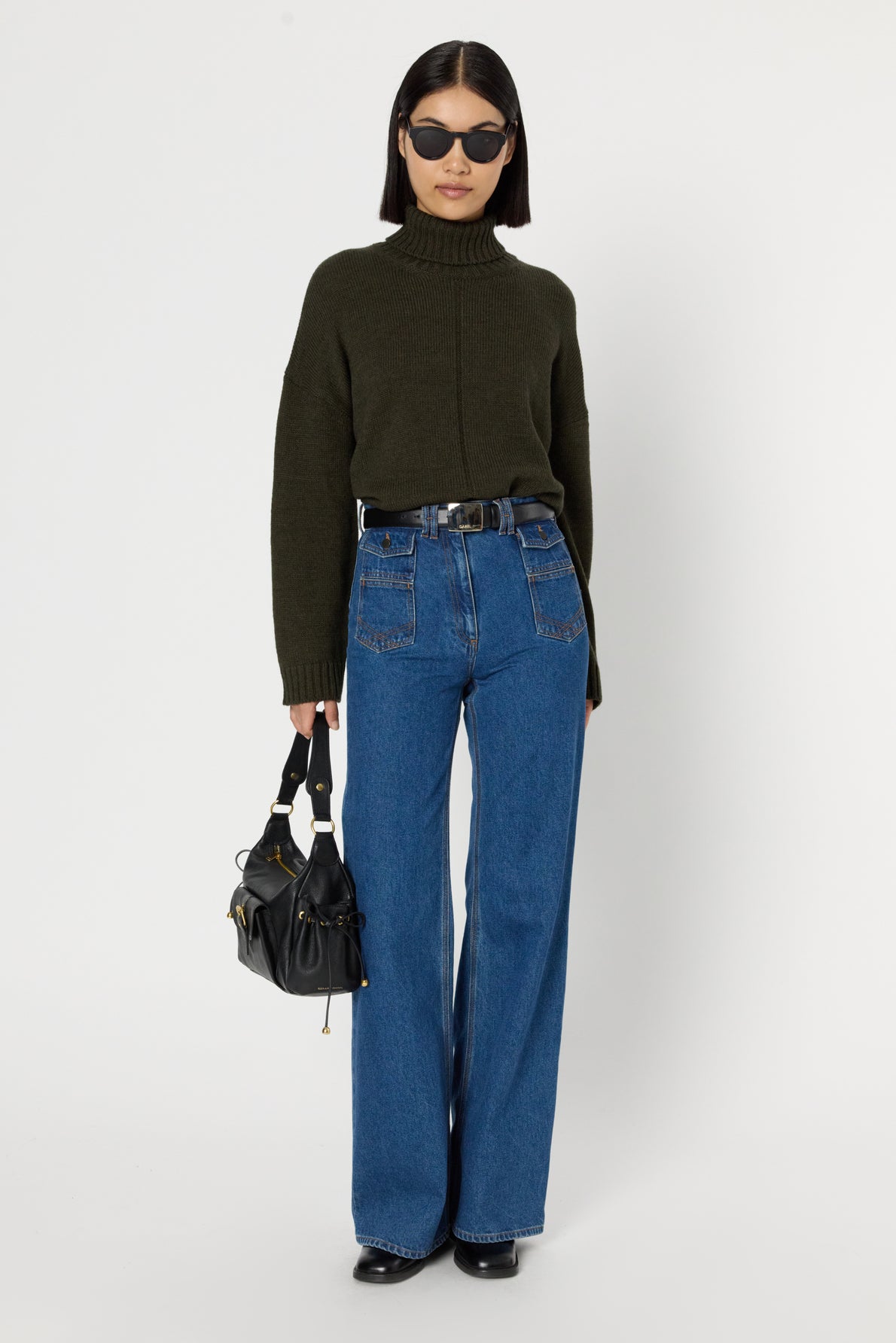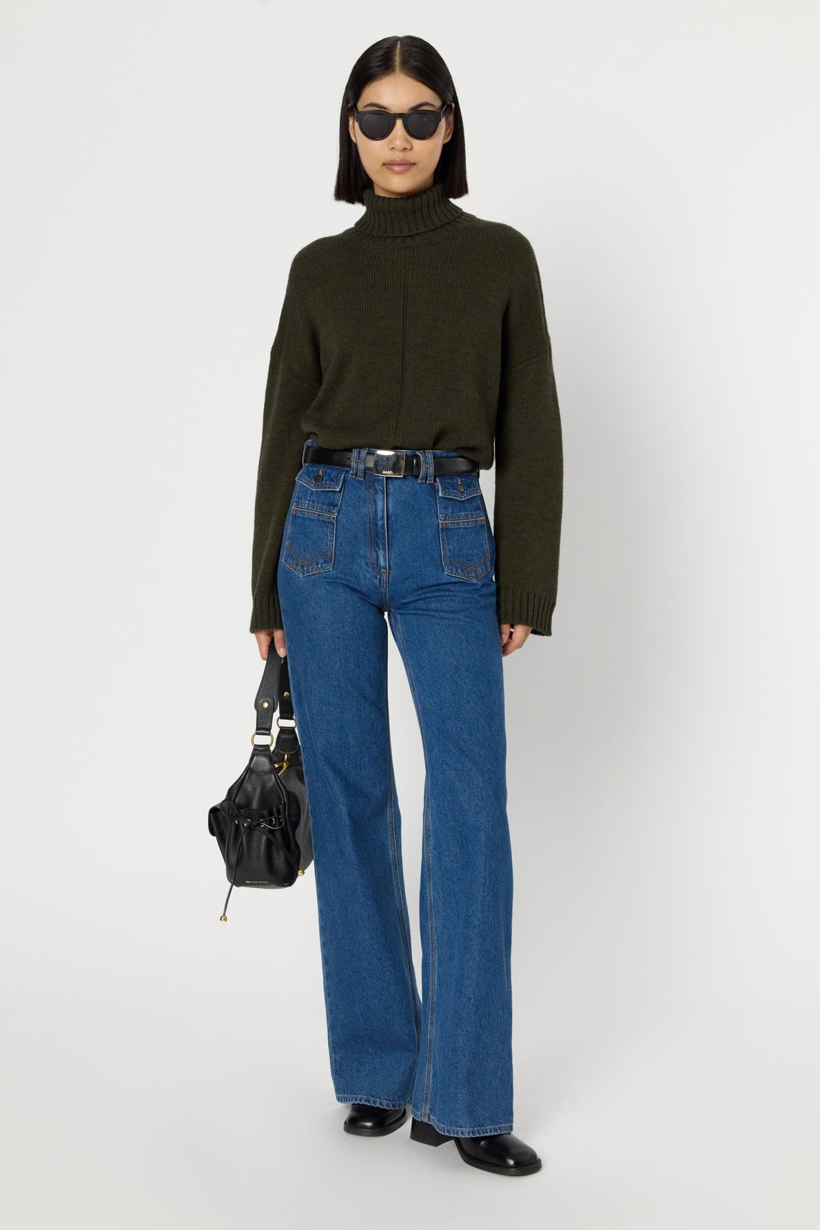 COCOONING SPIRIT FOR THE ENID SWEATER, WITH A LOOSE FIT AND A TURTLENECK. IT IS CRAFTED FROM A BLEND CONTAINING MERINO WOOL AND ALPACA WOOL. OFFERED IN DARK BLUE, IT WILL PAIR PERFECTLY WITH BLACK OR NAVY. IT CAN BE WORN EQUALLY WELL WITH WIDE SUIT PAN