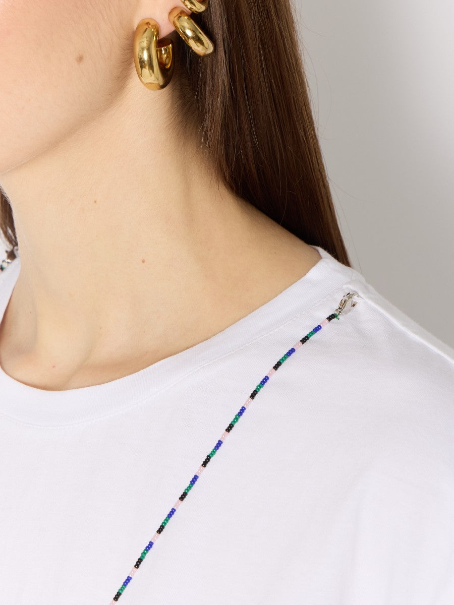 The TELAMORE t-shirt is an elegant piece that combines comfort and sophistication. Crafted from 100% cotton, it offers unparalleled softness and a delightful feel, perfect for summer days. This style is distinguished by its removable pearl necklace, which bears a message of love and life with the inscription "AMORE VIDA". This precious detail transforms a basic into an exceptional piece, adding a touch of fashion to your everyday look.