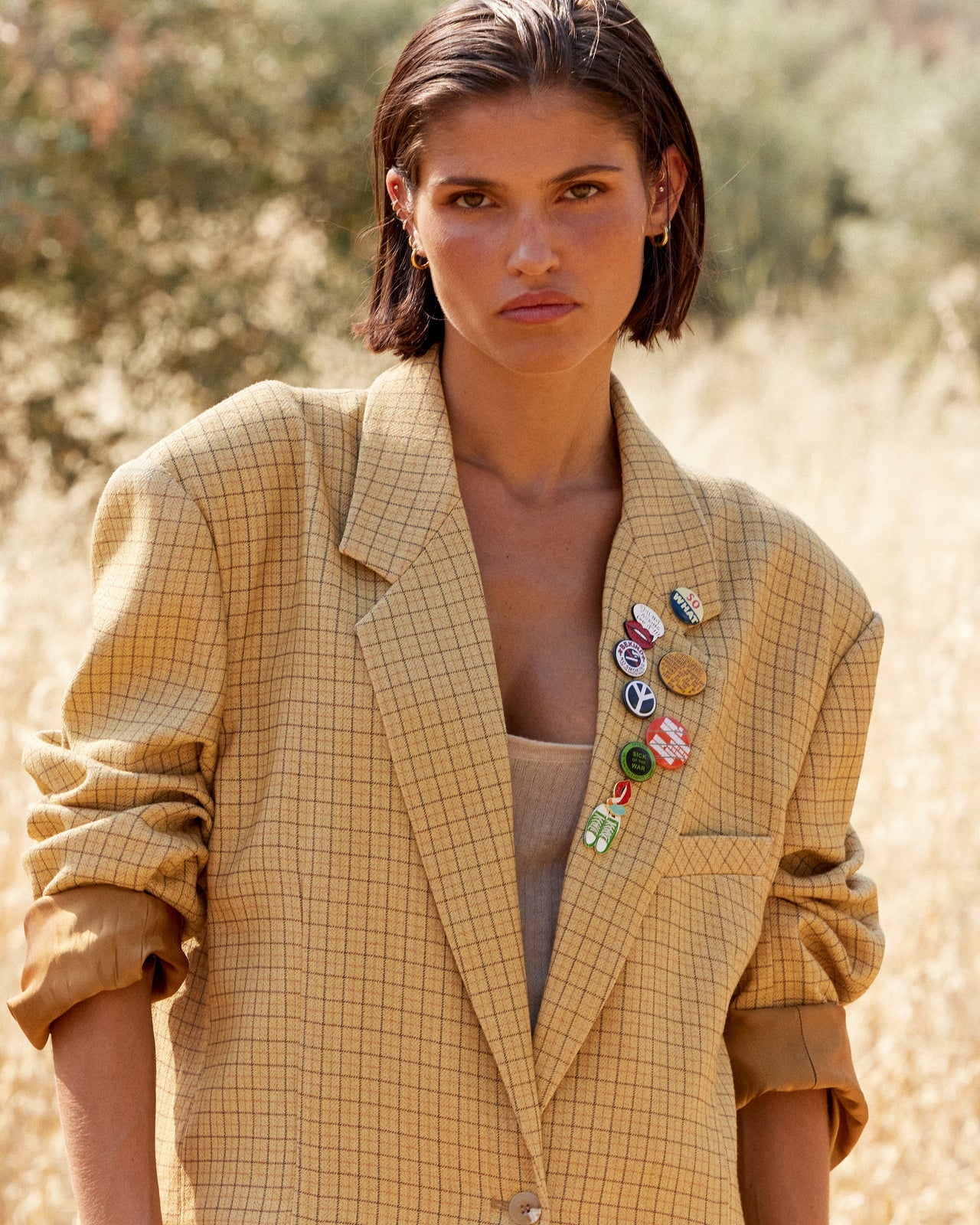 Suit jacket in rustic-effect fabric with straw-yellow English check print. Wide and relaxed cut, for a silhouette that is structured yet nonchalant. Interior lining crafted with a subtle changing effect. A series of rocknroll English pins adorn the lapel, a bold nod to a free and offbeat attitude.
