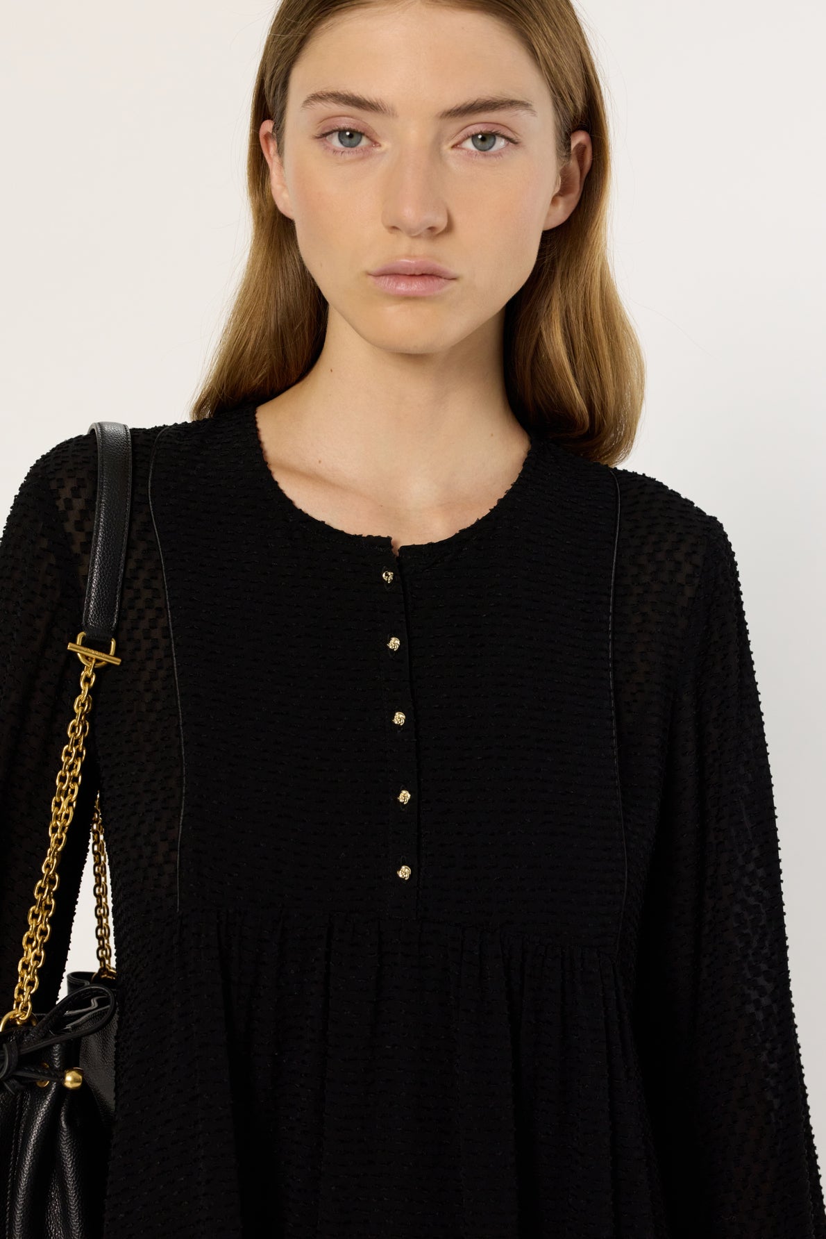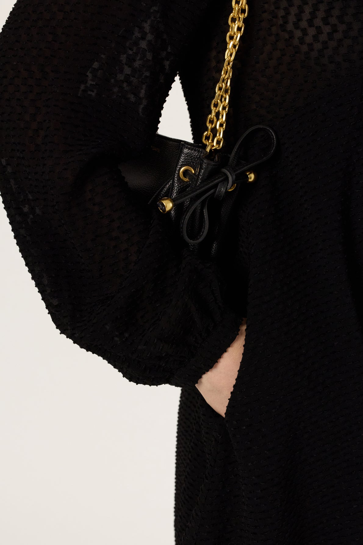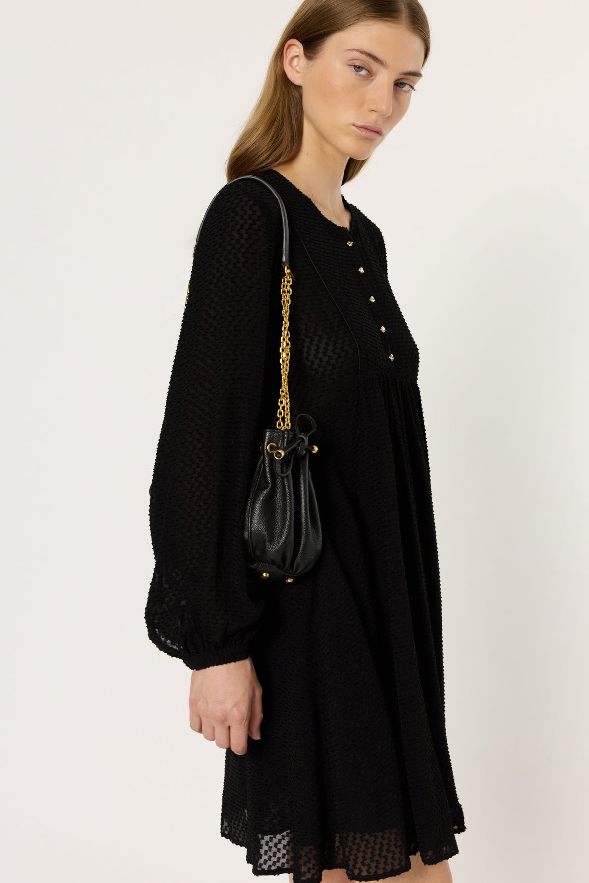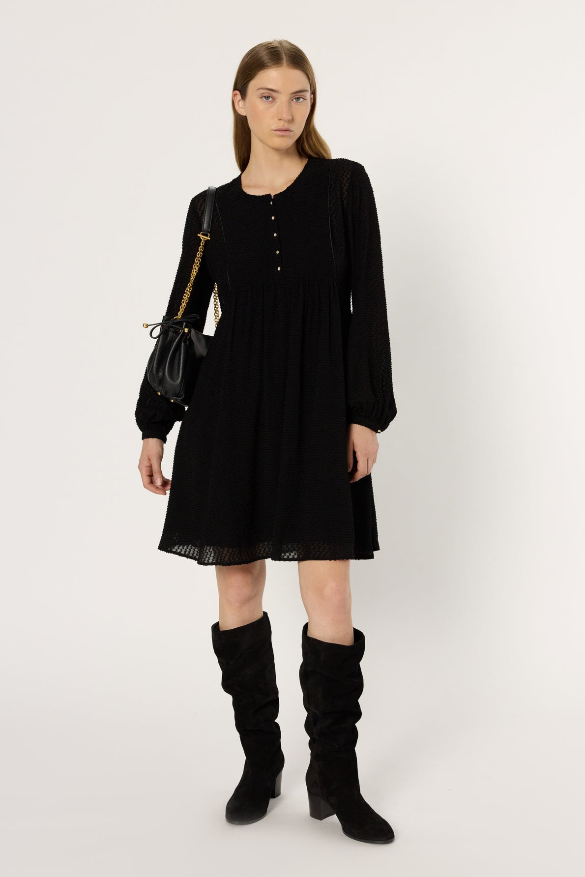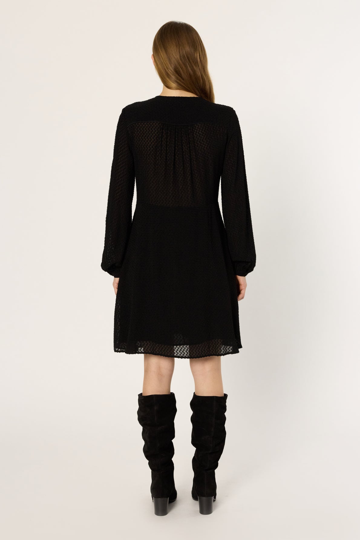 THE LAETITIA DRESS STANDS OUT WITH ITS CHECKERBOARD PATTERN IN JACQUARD IN SHADES OF BLACK. IT IS CRAFTED FROM A FLUID FABRIC THAT HOLDS ITS SHAPE FOR A PERFECT DRAPE.