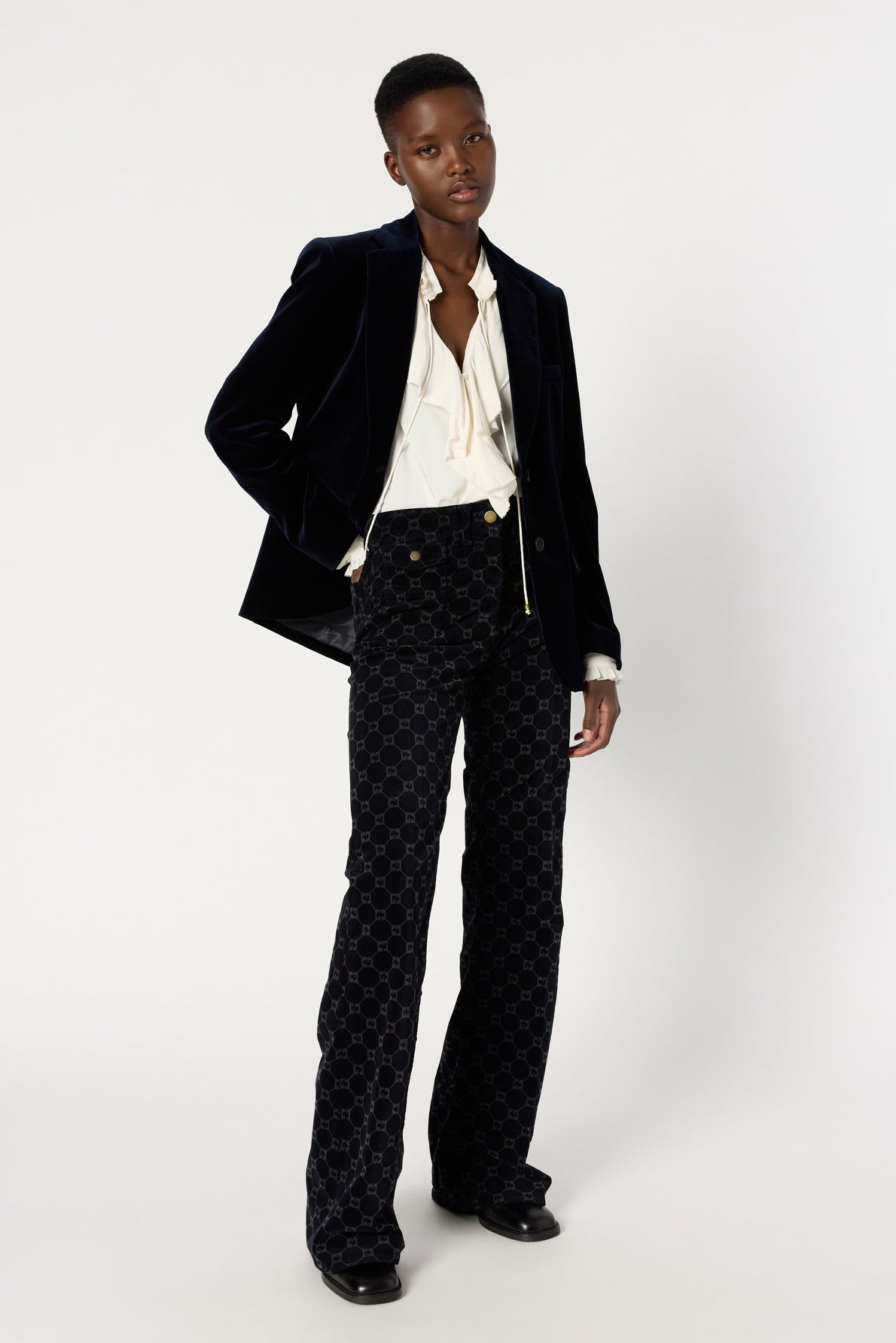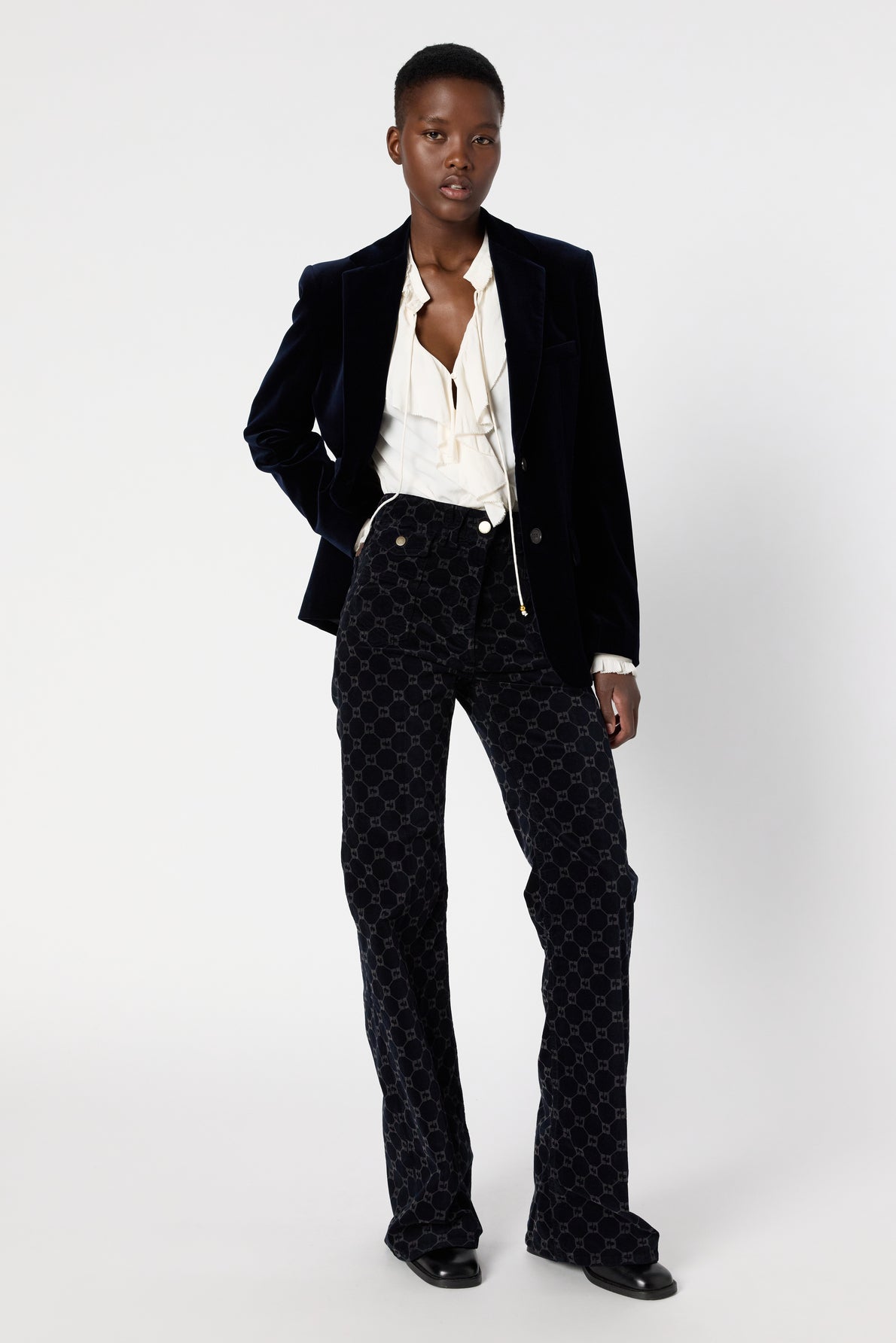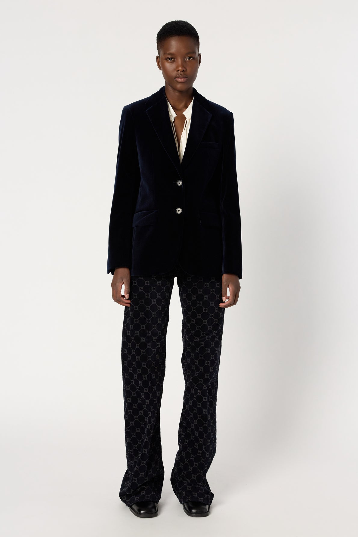 A TAILORED JACKET IN BROWN-BLUE SHORT-PILE VELVET, AN ESSENTIAL AND TIMELESS PIECE. TO BE WORN WITH THE SLEEVELESS VEST AND MATCHING TROUSERS FOR AN ULTRA-CHIC LOOK.