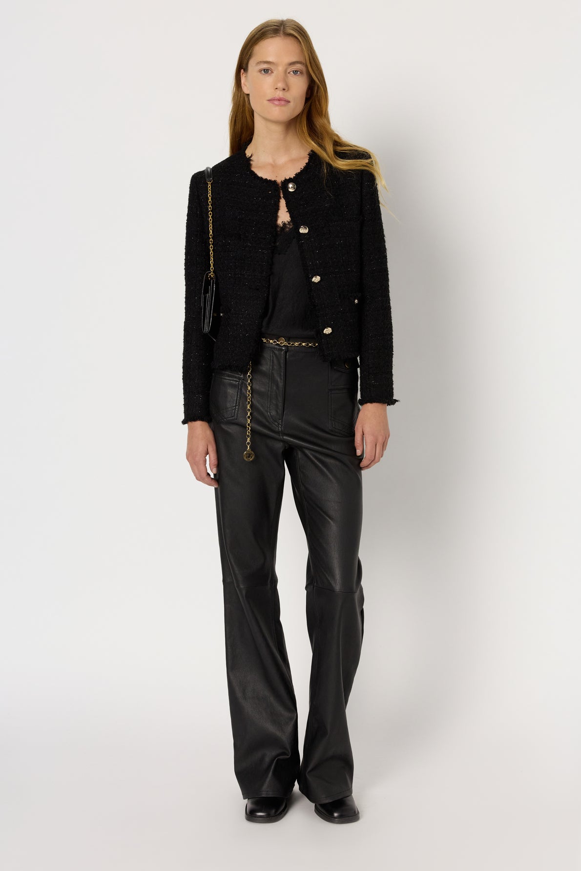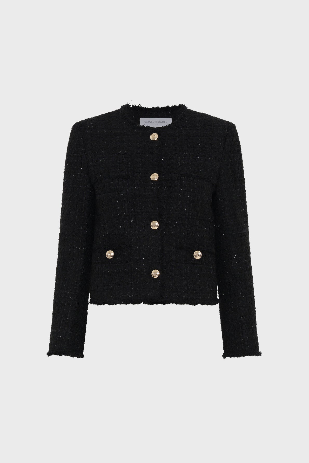 RENDERED IN BLACK ENHANCED WITH A HINT OF LUREX AND ADORNED WITH FRAYED FINISHES, THE NESSA TWEED JACKET COMBINES CLASSIC ELEGANCE WITH A CONTEMPORARY LOOK.