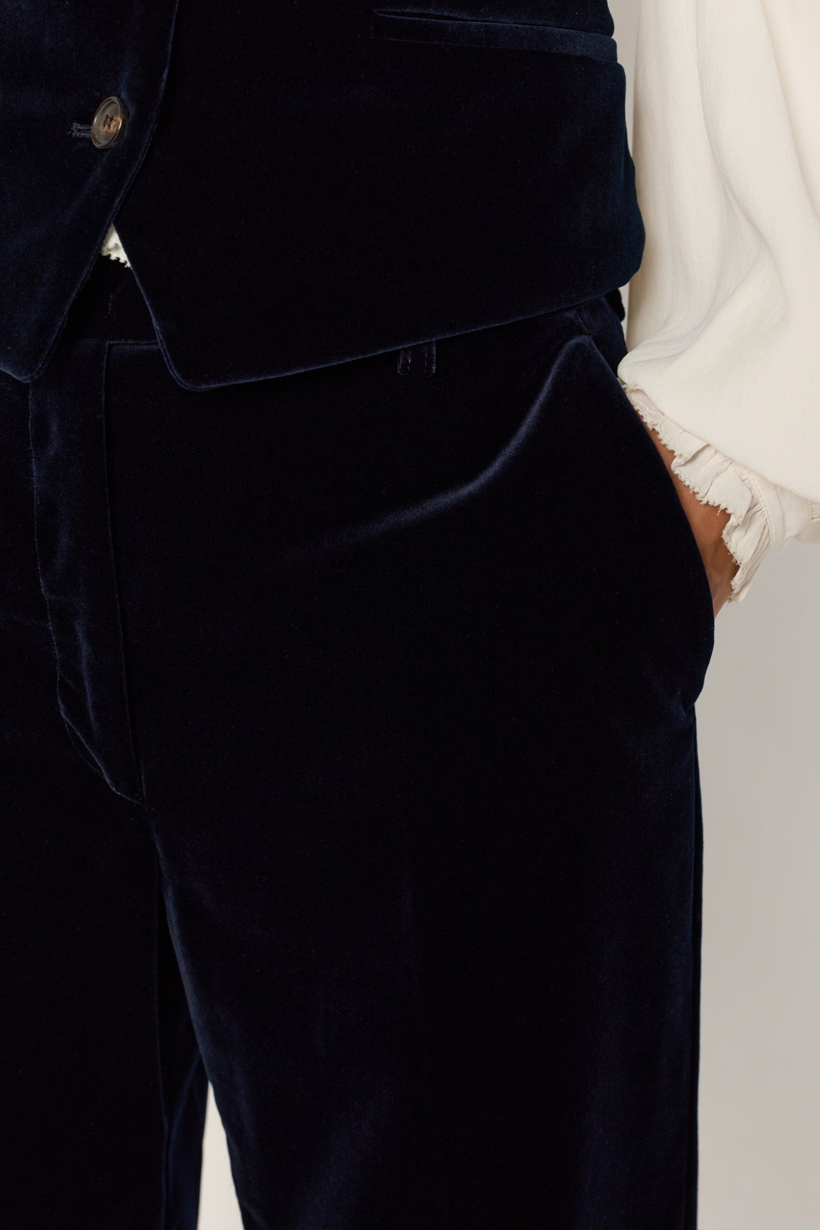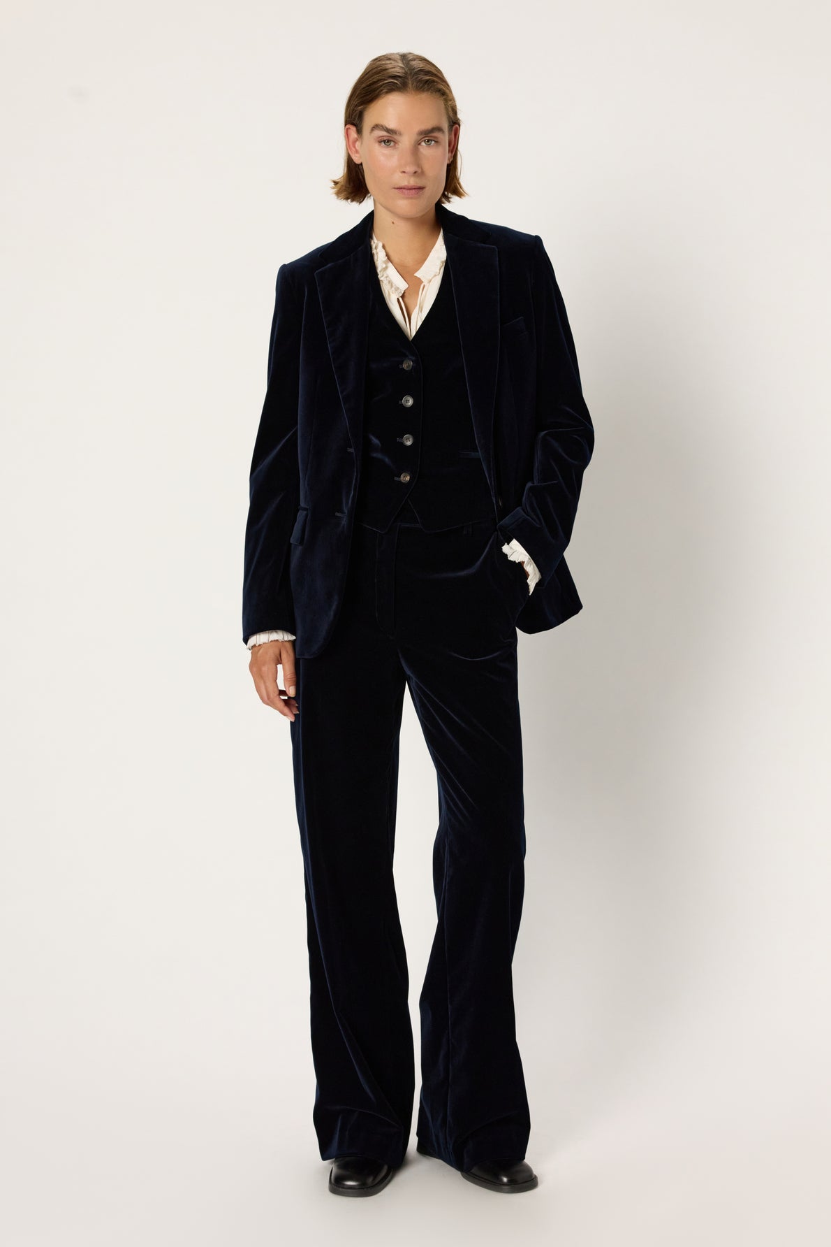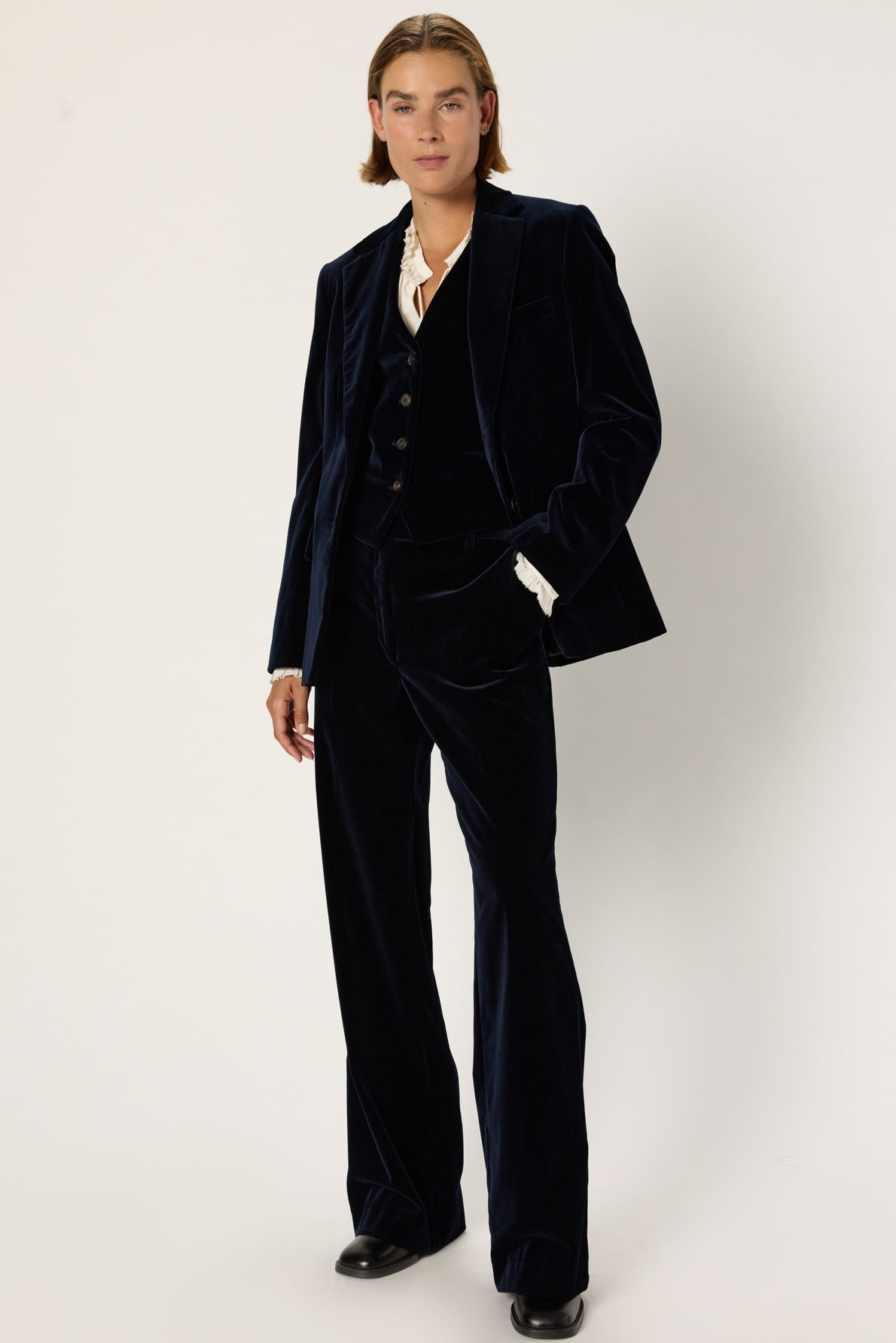 THE VELVET PANTS ARE THE KEY PIECE FOR CHIC WARDROBES. PRESENTED IN AN INTENSE MIDNIGHT BLUE, THEY CAN BE WORN AS A SUIT WITH THE MATCHING JACKET AND VEST.