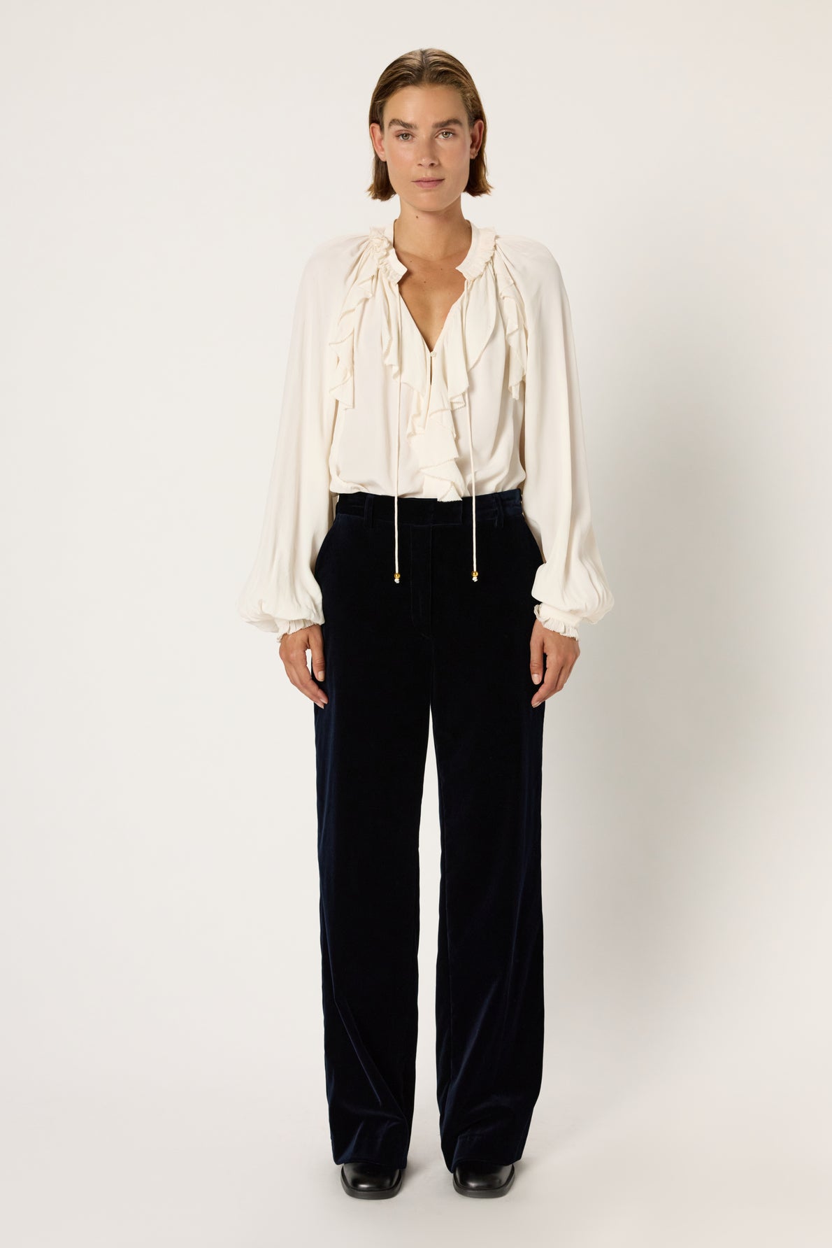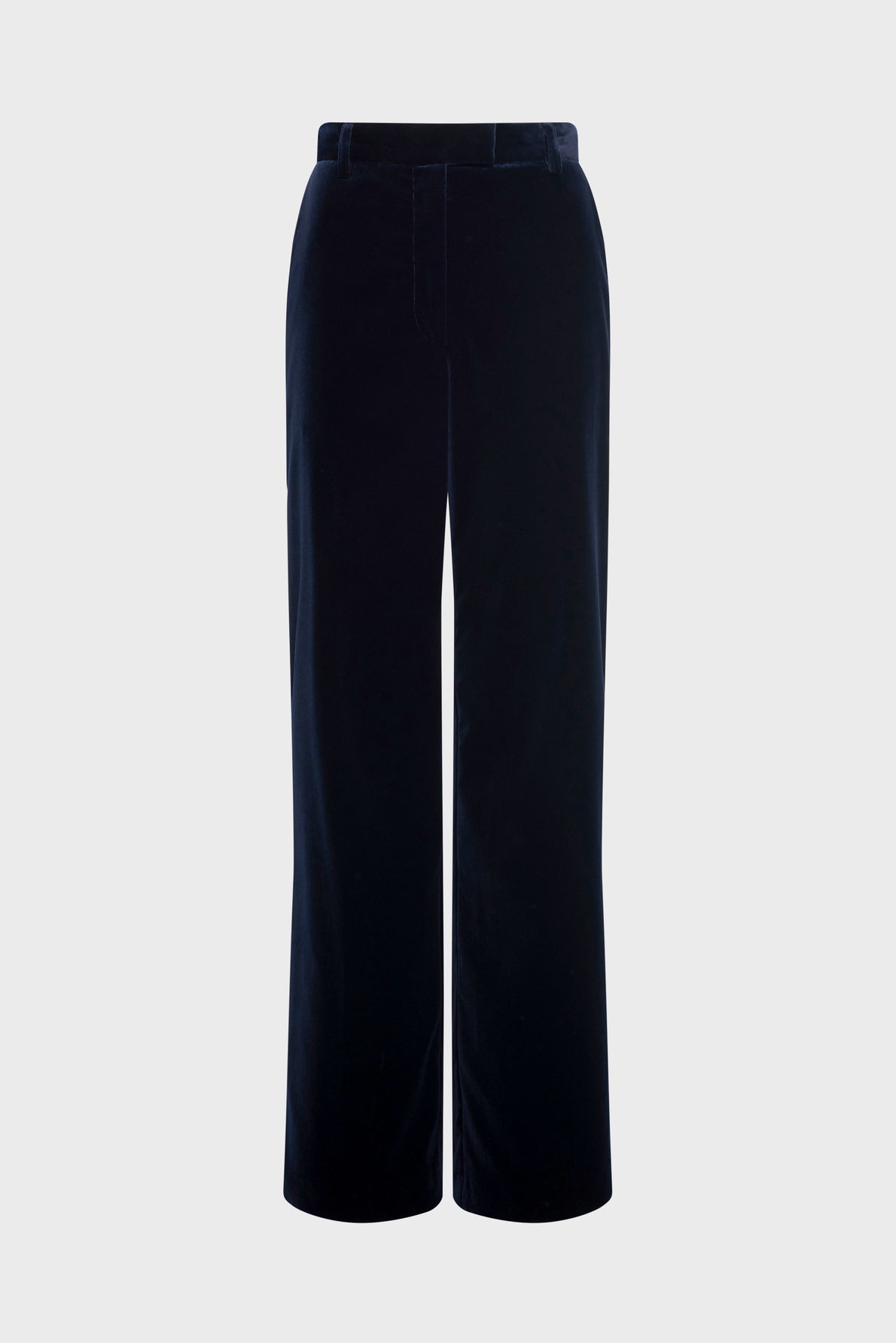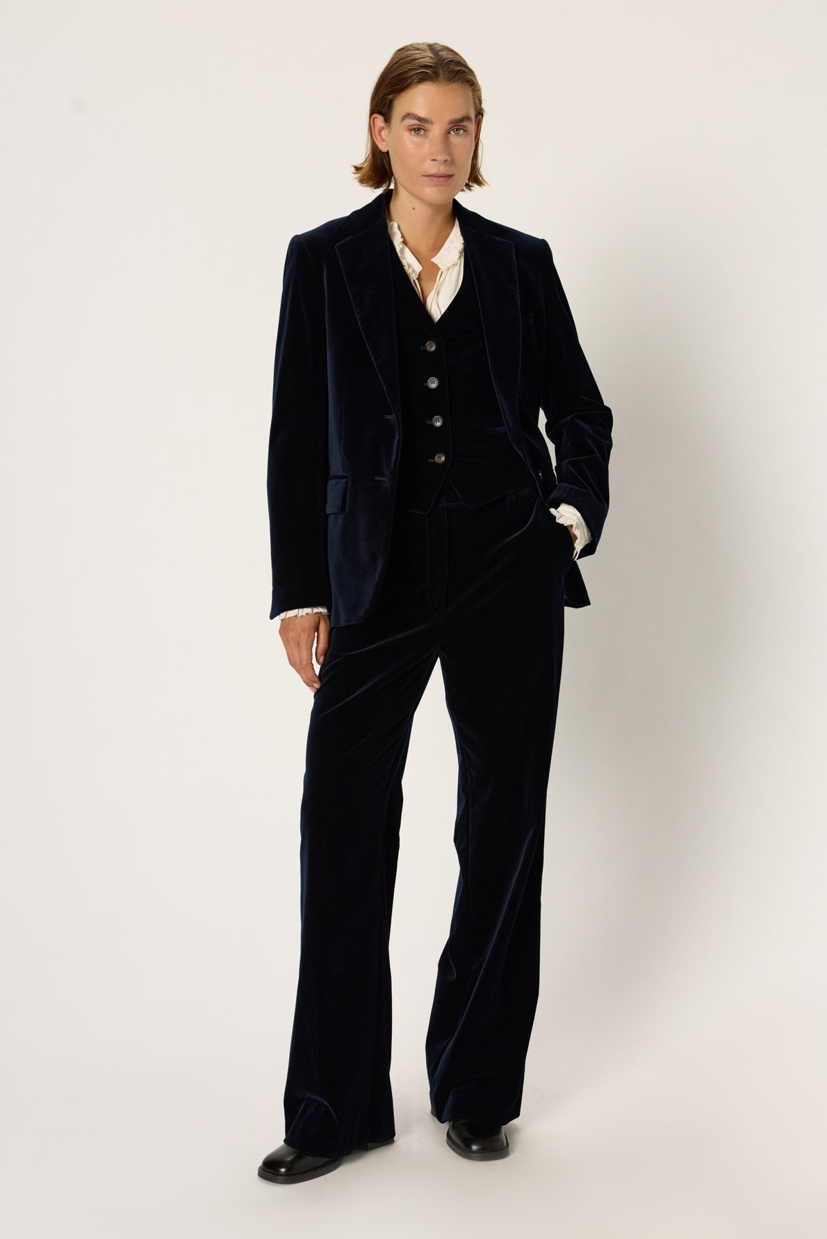 THE VELVET PANTS ARE THE KEY PIECE FOR CHIC WARDROBES. PRESENTED IN AN INTENSE MIDNIGHT BLUE, THEY CAN BE WORN AS A SUIT WITH THE MATCHING JACKET AND VEST.