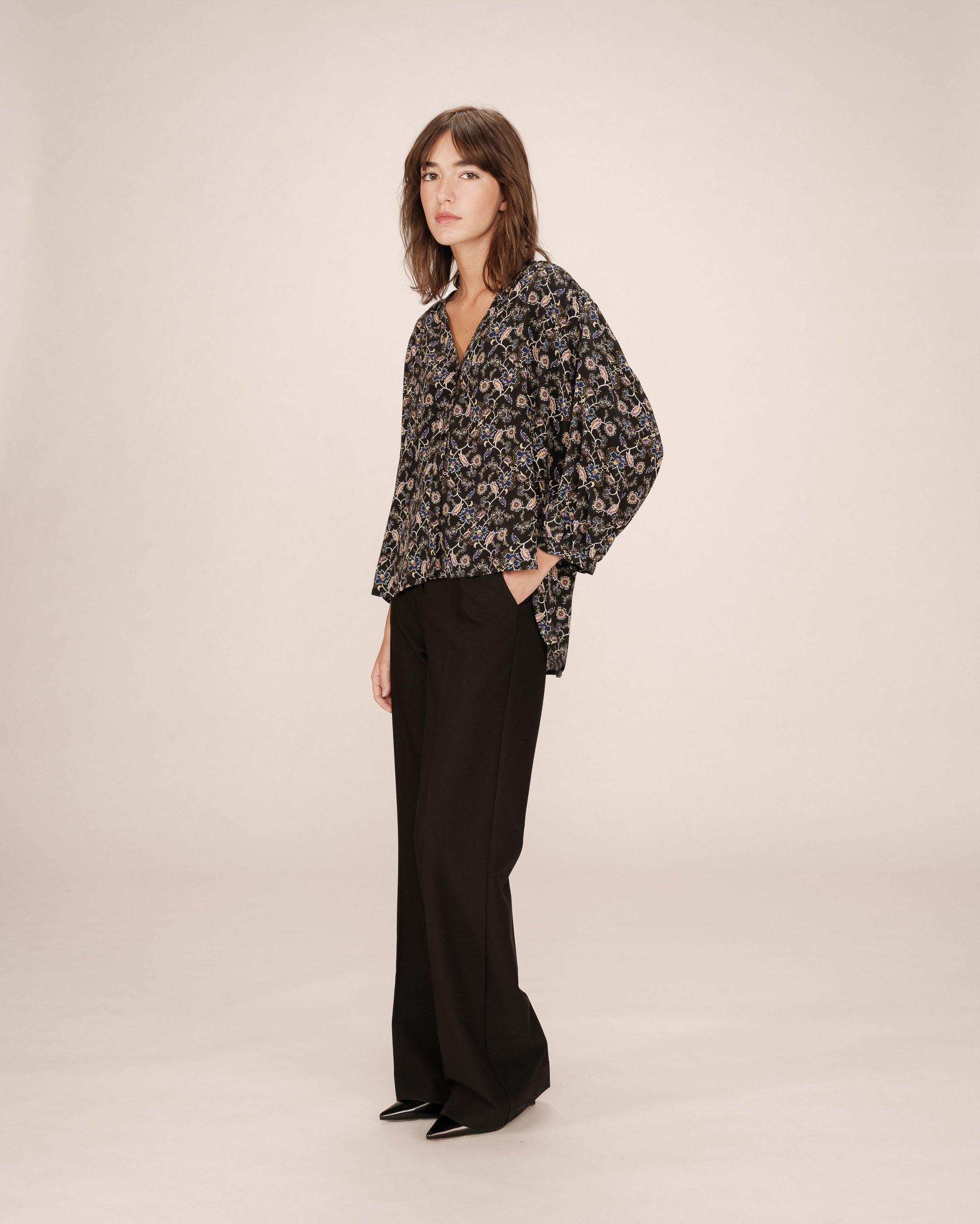 The Secrete printed blouse is a light and relaxed piece that draws a feminine and refined look.Sublimated by a print with floral patterns, the blouse presents a V -neck and frowstones on the shoulders and in the back, which make it a room with timeless elegance.The secret patterned blouse has a buttoned opening on the front.