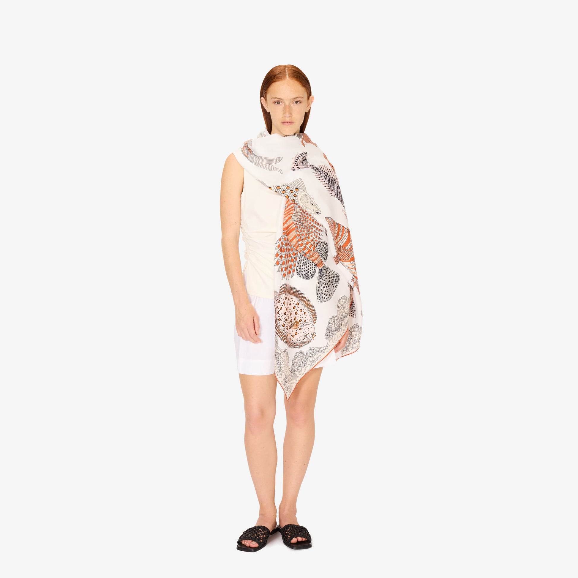 This line of screen-printed scarves comes in several sizes, depending on the design. The airy material allows for great color finesse.