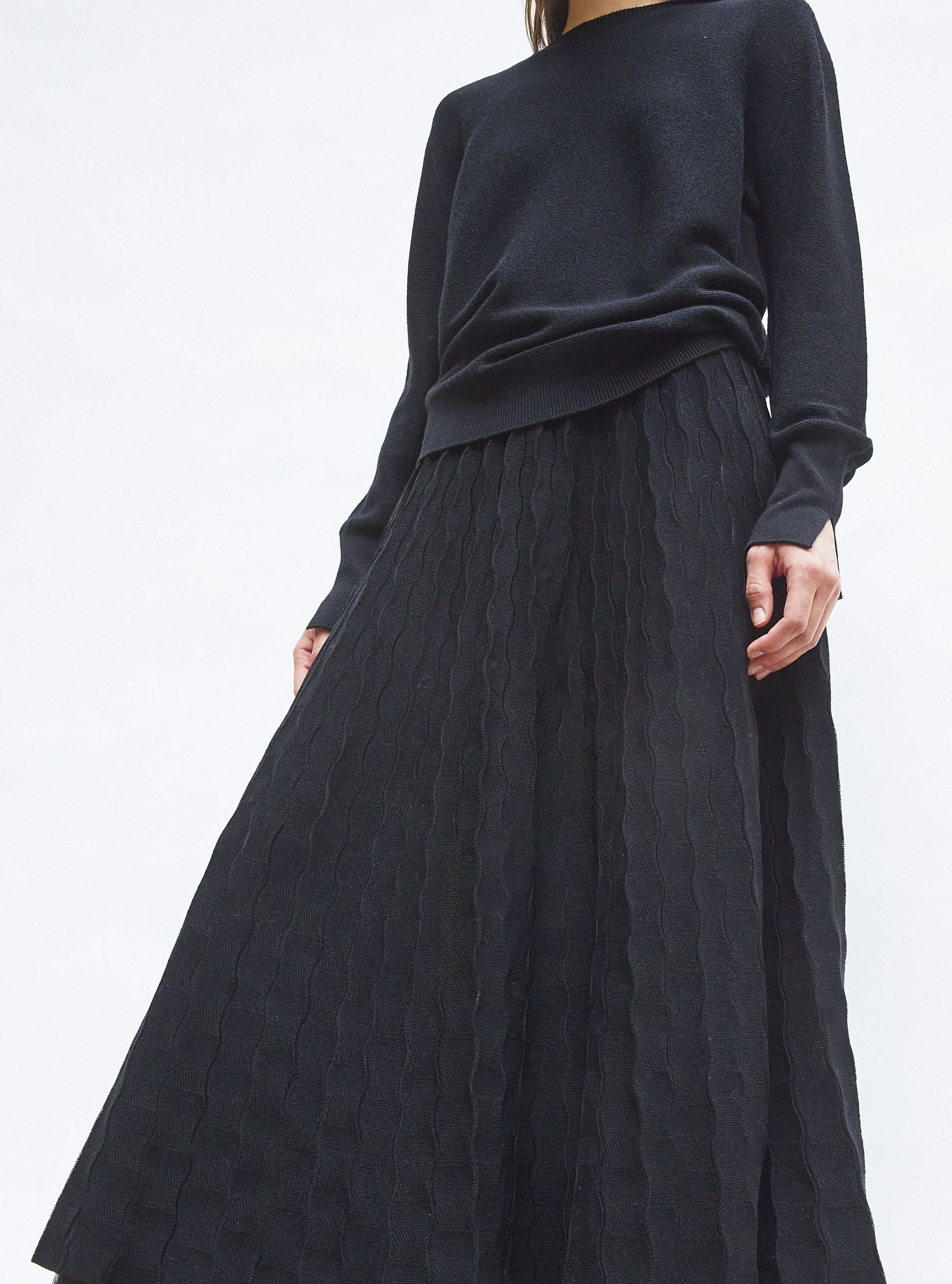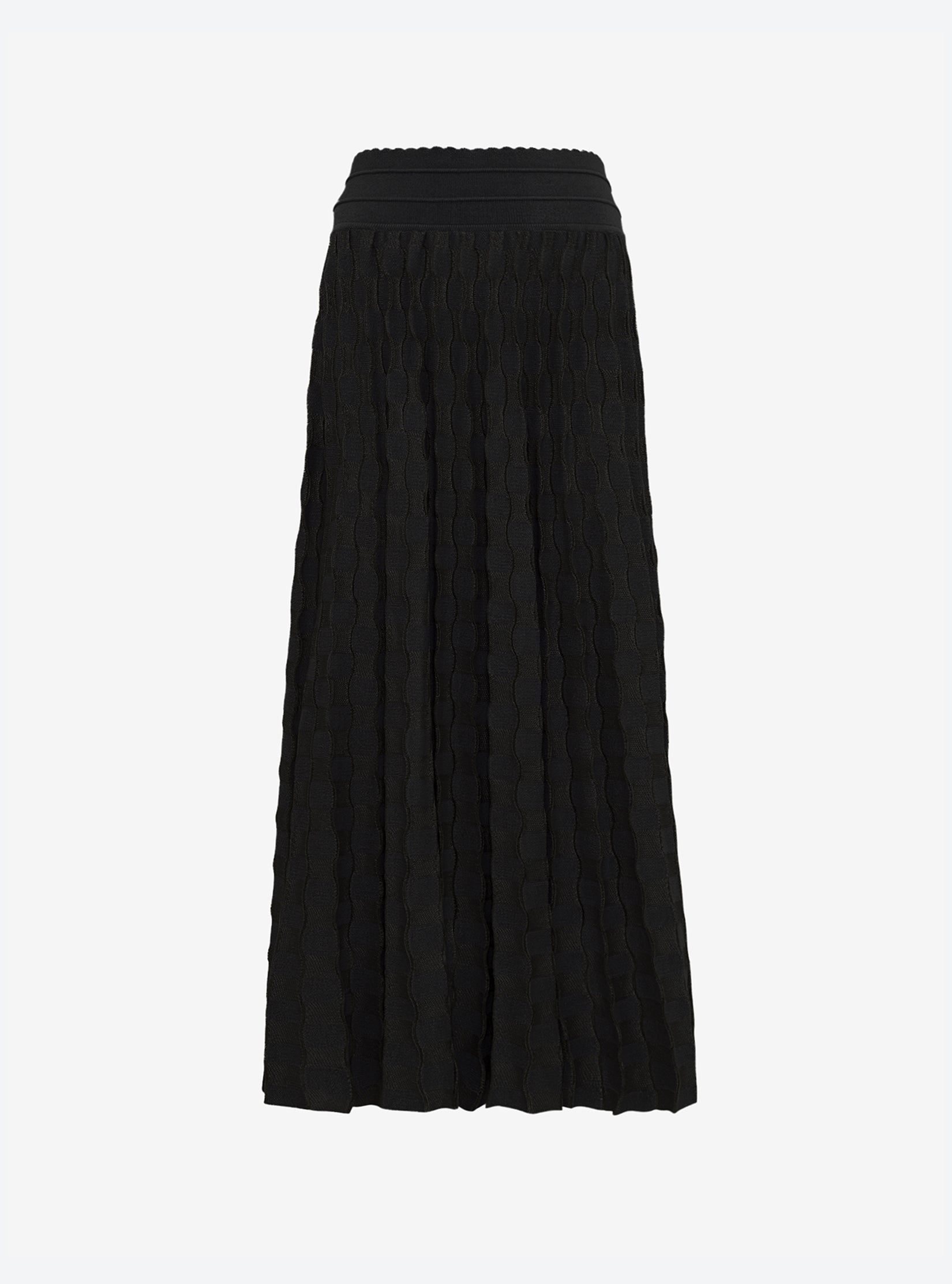 This Molli jacquard long knit skirt stands out thanks to its wavy mat-shiny pattern, the result of a mix of soft, high-quality cotton and rayon yarns. Made in France, it features a wide tone-on-tone elasticized waistband for support and comfort. Its flared cut unfurls in a lovely movement for a feminine, elegant silhouette.