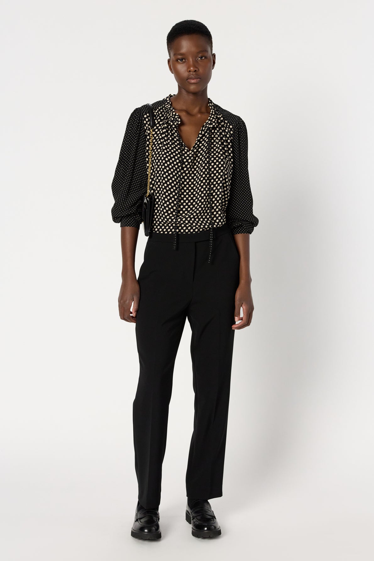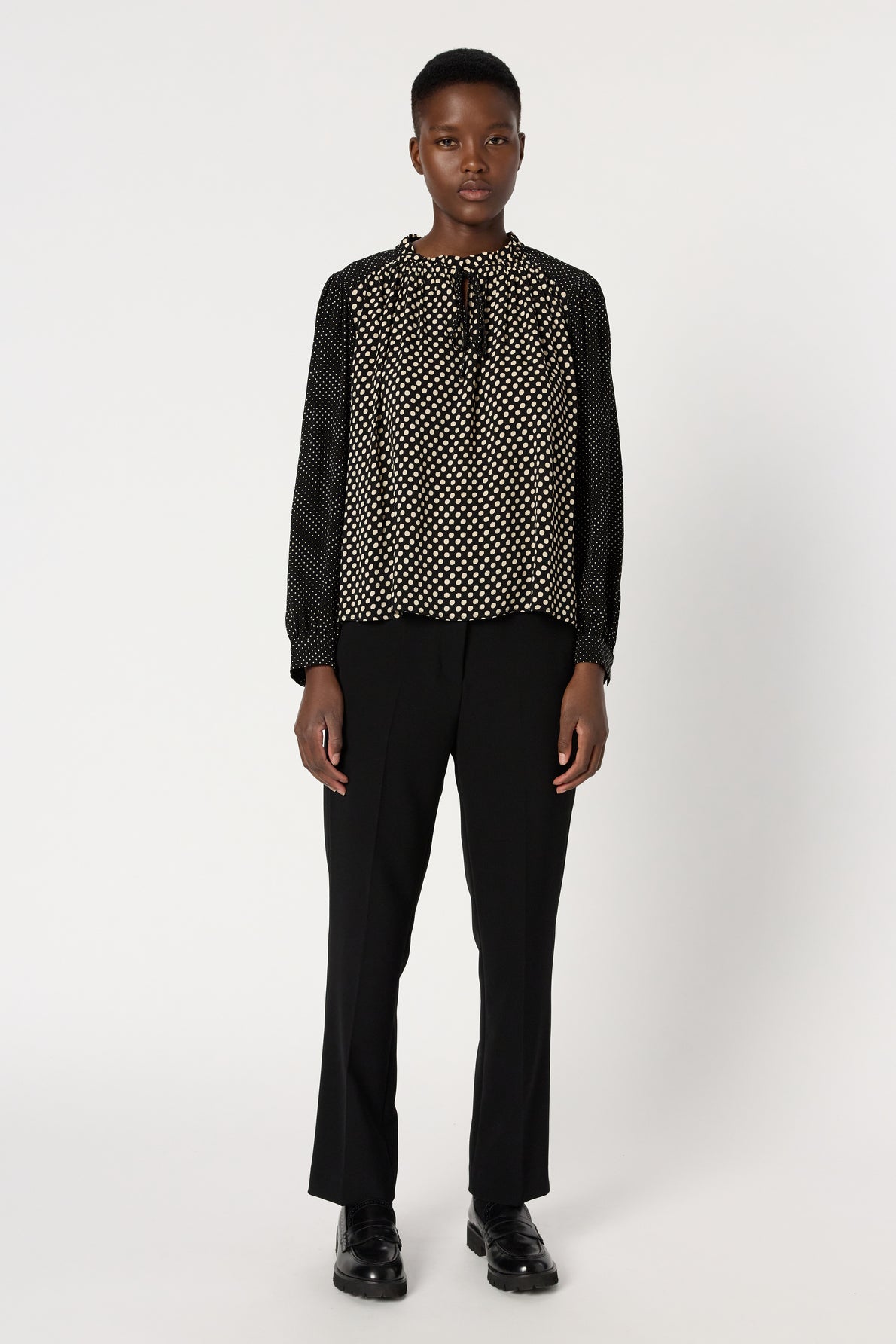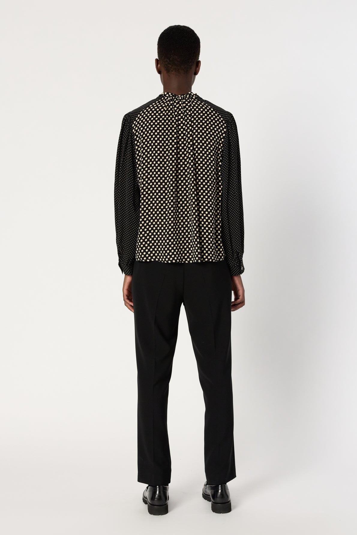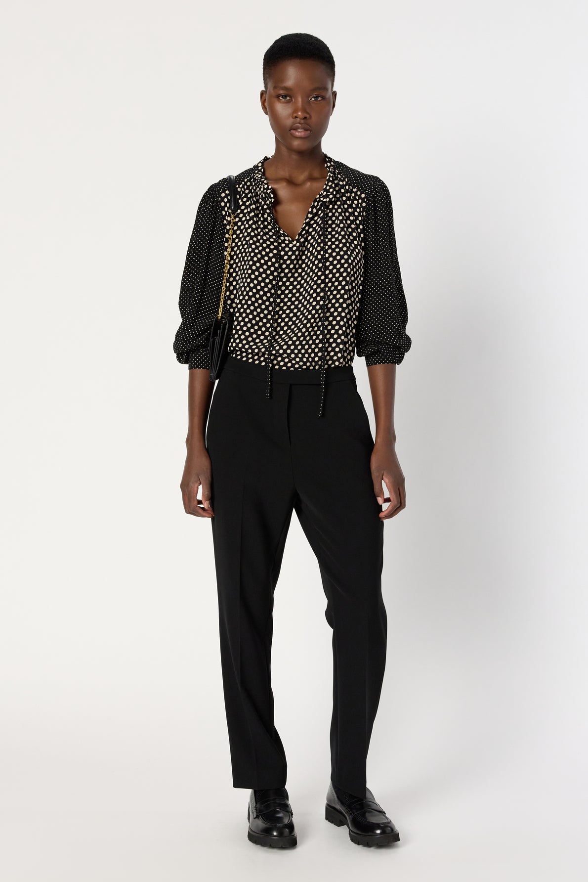 COUTURE STYLE, SOFT BLOUSE IN HABOUTAI VISCOSE, A SOFT, FLOWING FABRIC, WITH A MIX OF MEDIUM AND SMALL POLKA-DOT PATTERNS. A TIE ALLOWS YOU TO ADJUST THE OPENING OF THE COLLAR AS YOU WISH.