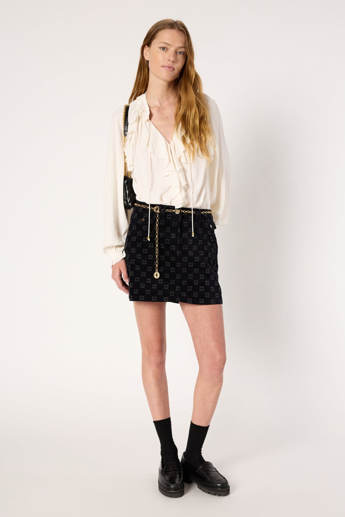 ELEGANT, FEMININE NAVY BLUE SATIN SHIRT WITH RUFFLED COLLAR AND NECK TIE. MIX OF RUFFLES, PLEATS AND GATHERS TO MAKE EVEN THE SIMPLEST OR MORE SOPHISTICATED OUTFIT PERFECT.