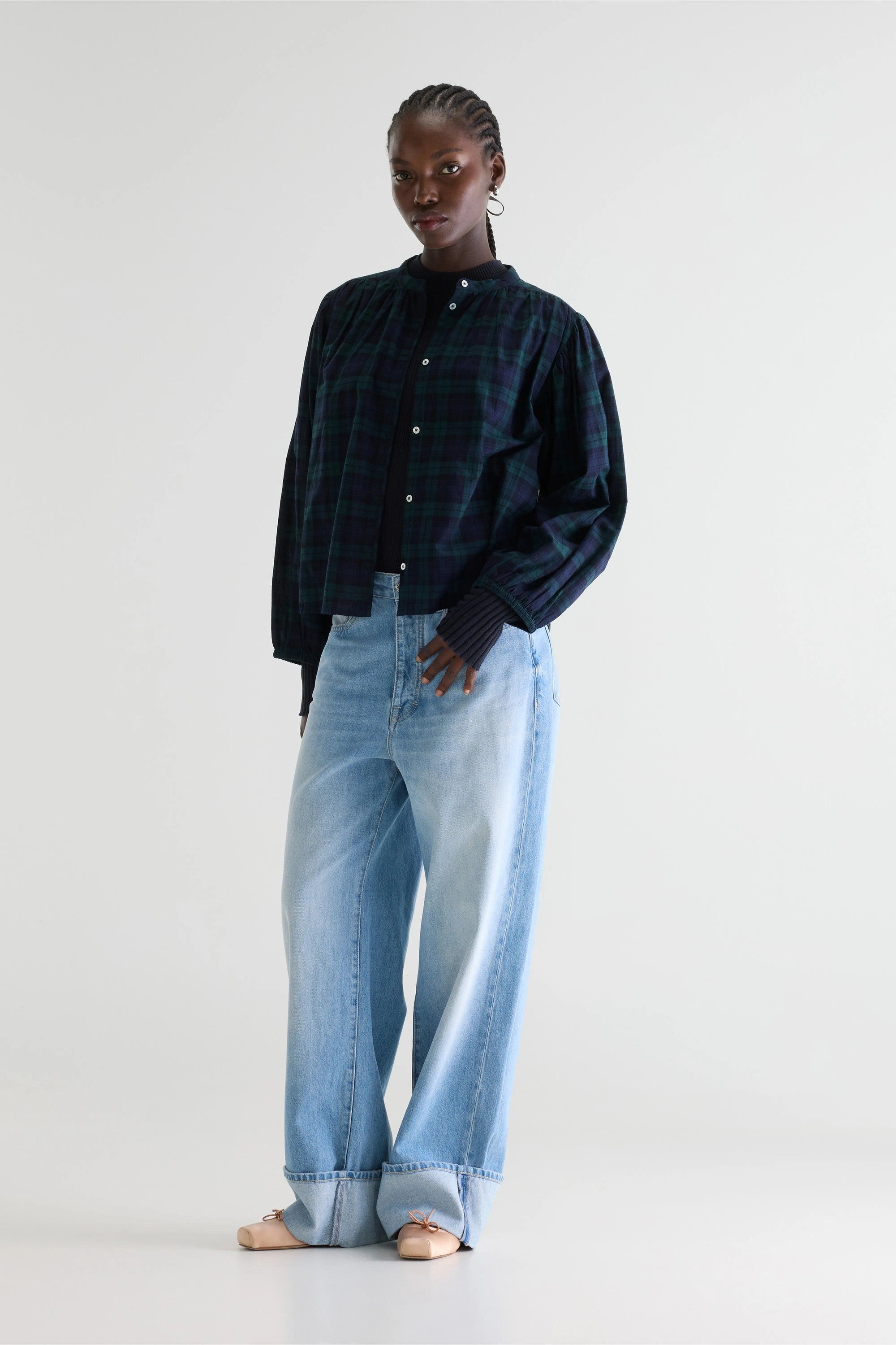 Relaxed blouse in black and green plaid with gathered shoulders and long puffed sleeves with elasticated cuffs.
