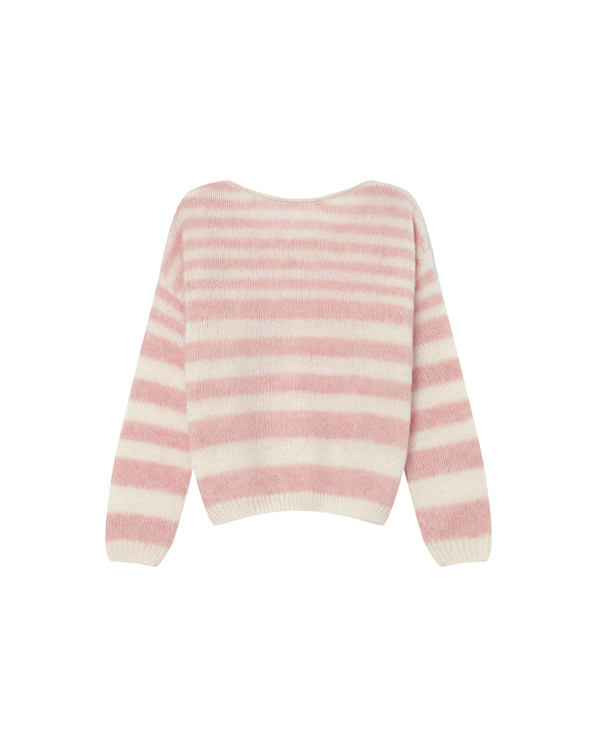 Knitted in a mixed wire of wool and alpaca, the Sand striped sweater is a hot and soft piece from the collection.The long sleeves and the boat neckline draw an effortless and relaxed look.The classic cut of the Sand wool sweater is sublimated by stripes and a heart -shaped embroidery on the front.