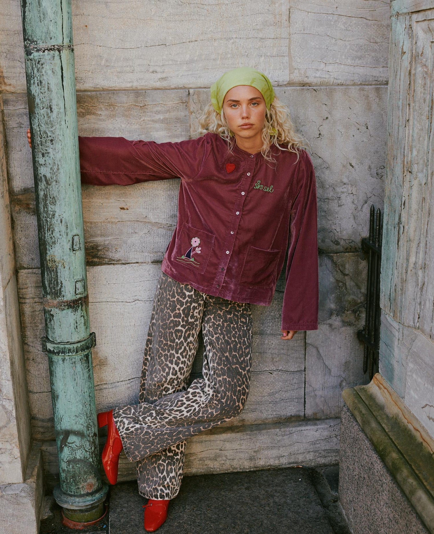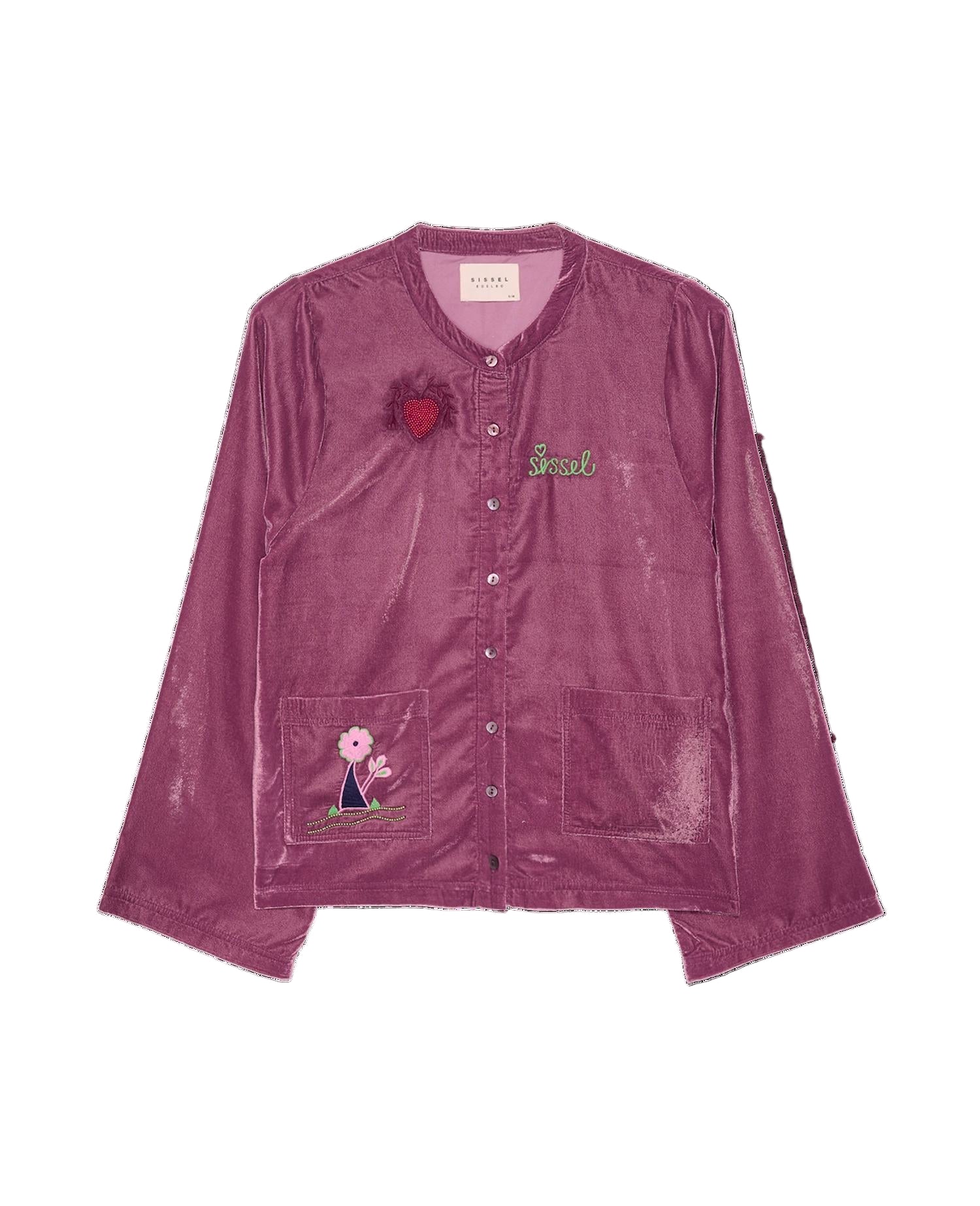 Hope Shirt is a feminine piece made in leftover polyester velvet. It features long, straight sleeves and front pockets. The shirt has an O-neck and a placket with light mother-of-pearl buttons at the front. It is decorated with delicate motifs, such as a small flower, a heart, and our 'Sissel' signature, created with embroidery and beads.