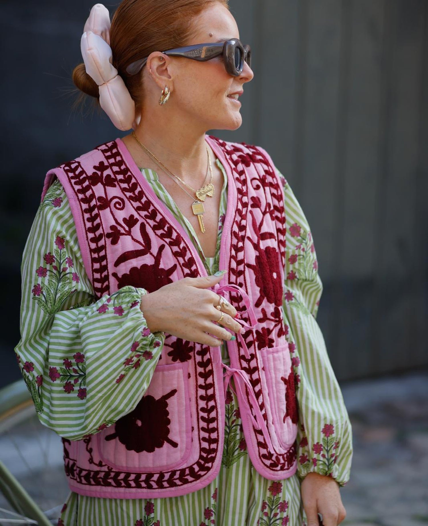 Honey Vest is a cute cotton vest decorated with bold and bright suzani floral embroidery. The vest has two front pockets, which are also decorated with the suzani floral embroidery. The vest is open at the front and can be closed with three sets of bows. All edges are covered with matching cotton tapes, and the vest is fully lined with striped cotton lining.