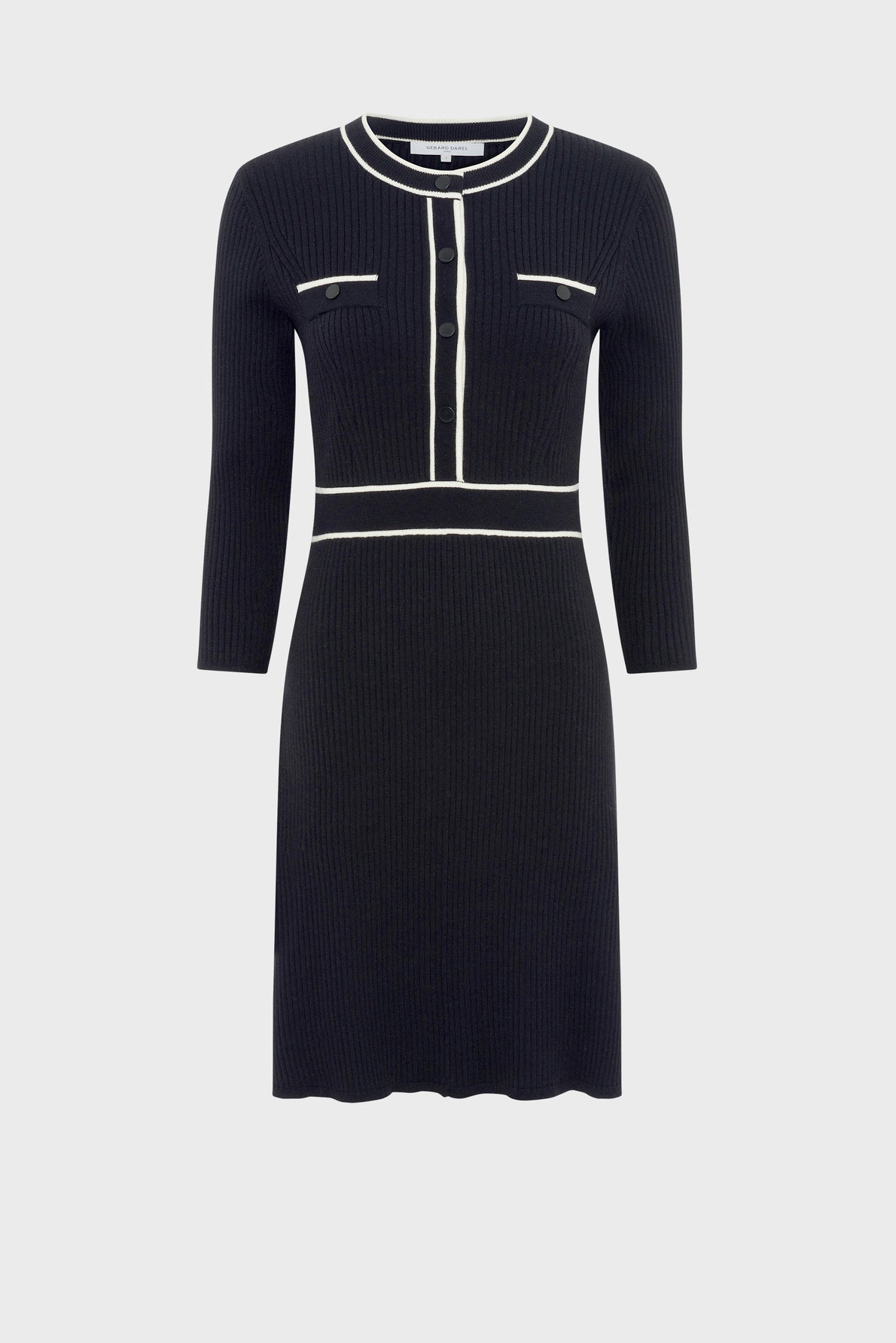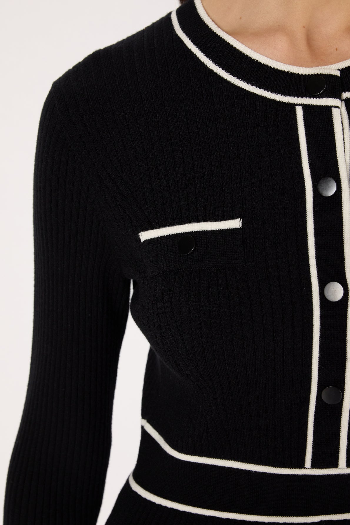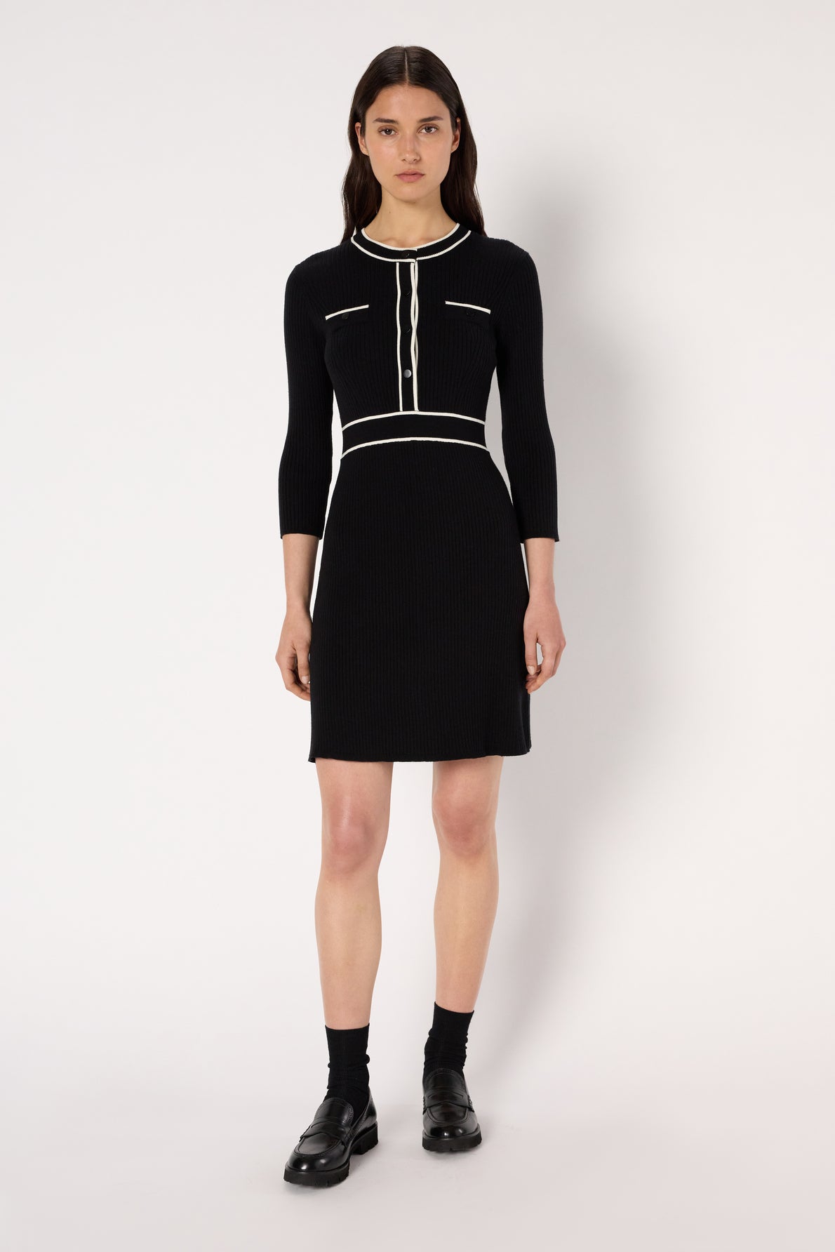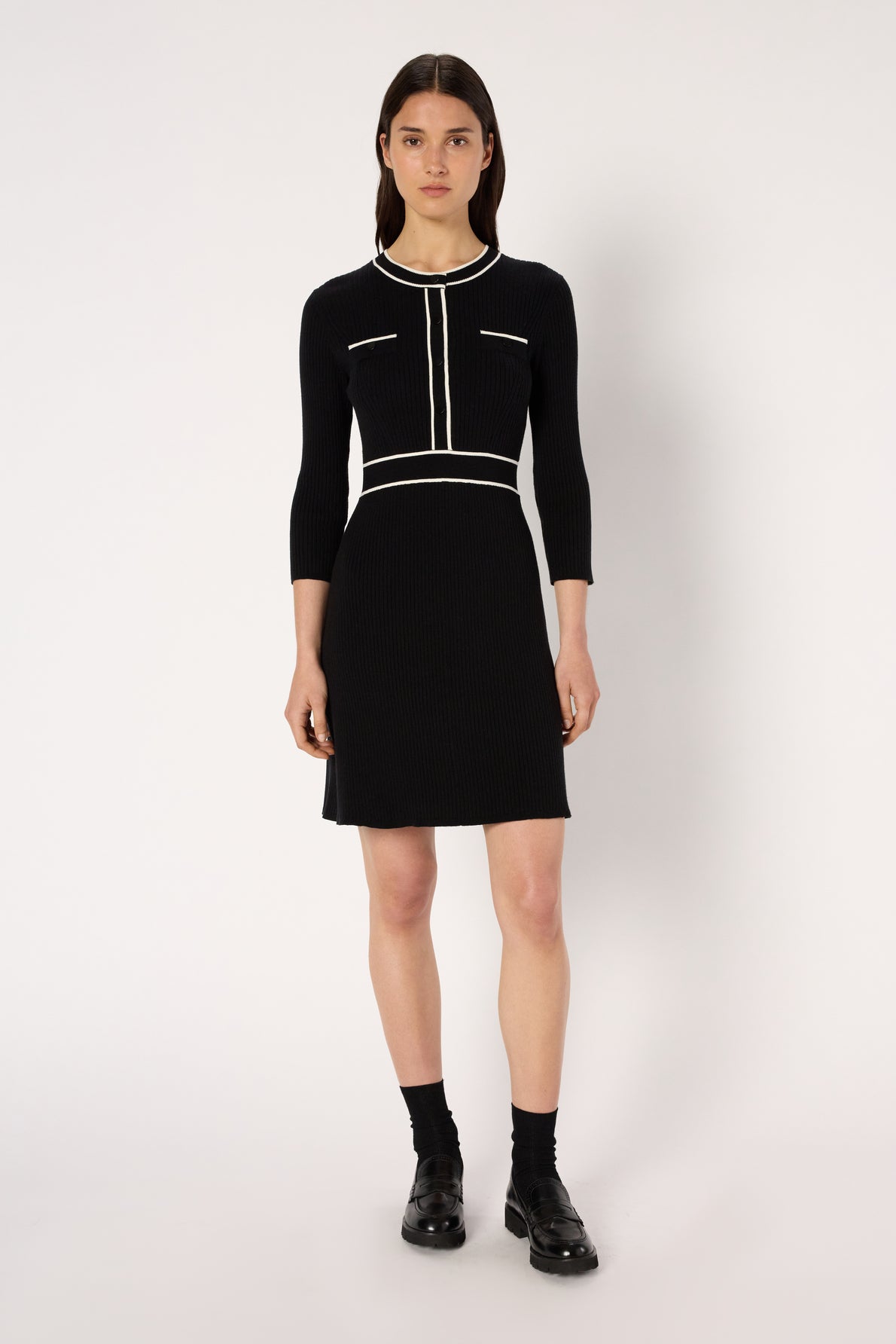 CRAFTED FROM STRETCH KNIT, THE LANI DRESS HUGS THE SILHOUETTE WITH ITS FITTED TOP AND FLARED BOTTOM. WITH ITS RIBBED DESIGN, WHITE TRIM ON A BLACK BACKGROUND, AND ROUND BUTTONS, IT STANDS OUT WITH ITS COUTURE SPIRIT.