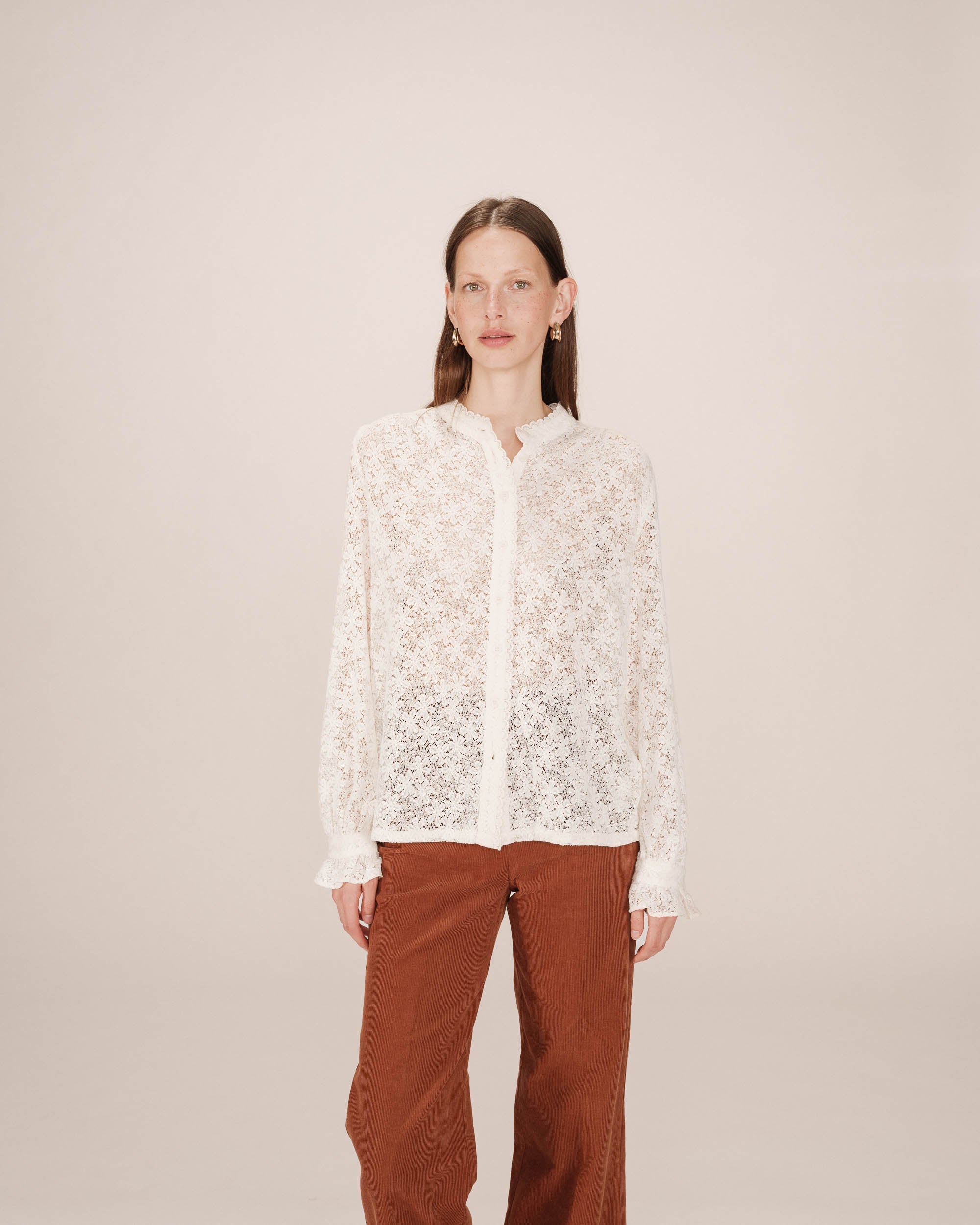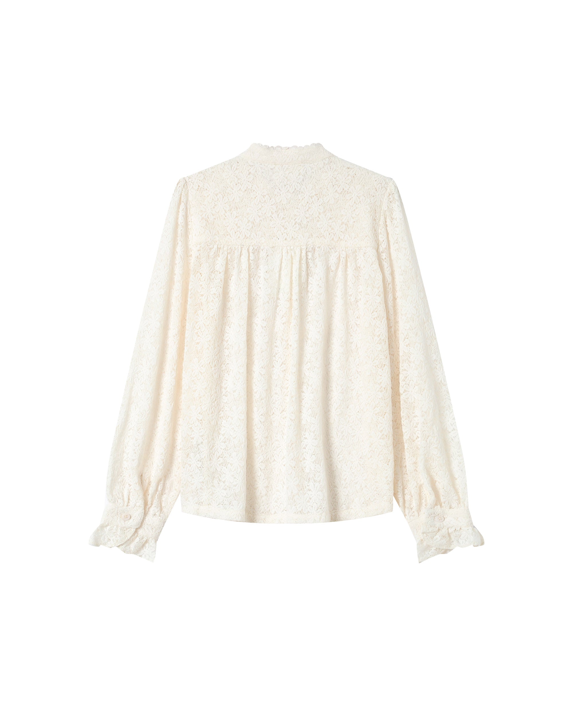 The swing lace blouse, with a vintage and romantic spirit, is a piece with assertive femininity.The blouse has ruffled wrists and a lace border with the neckline that offer a classic and elegant silhouette.The straight cut and long buttoned sleeves of the Swing round neck blouse make it a chic and timeless model.