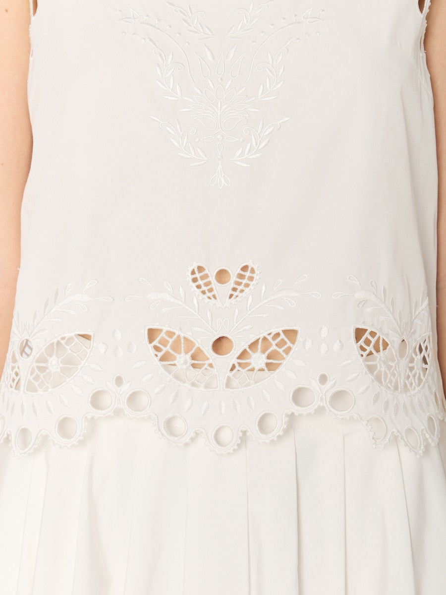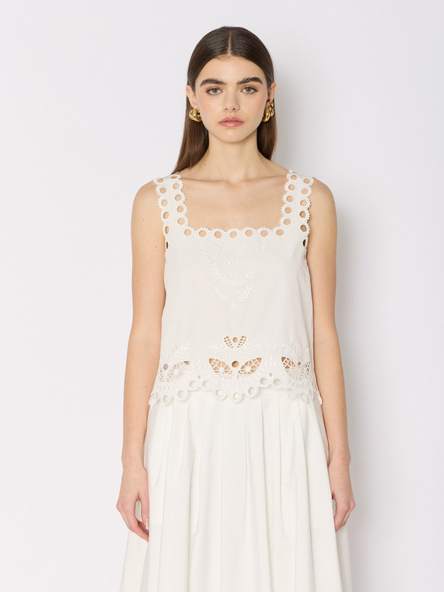 The TISTA top is a must-have for those seeking both style and comfort. This cropped top features broderie anglaise embroidery creating refined patterns that add a textured dimension to the ensemble, while subtly revealing the skin. The square collar adds a touch of sophistication to this casual model, ideal for sunny days.