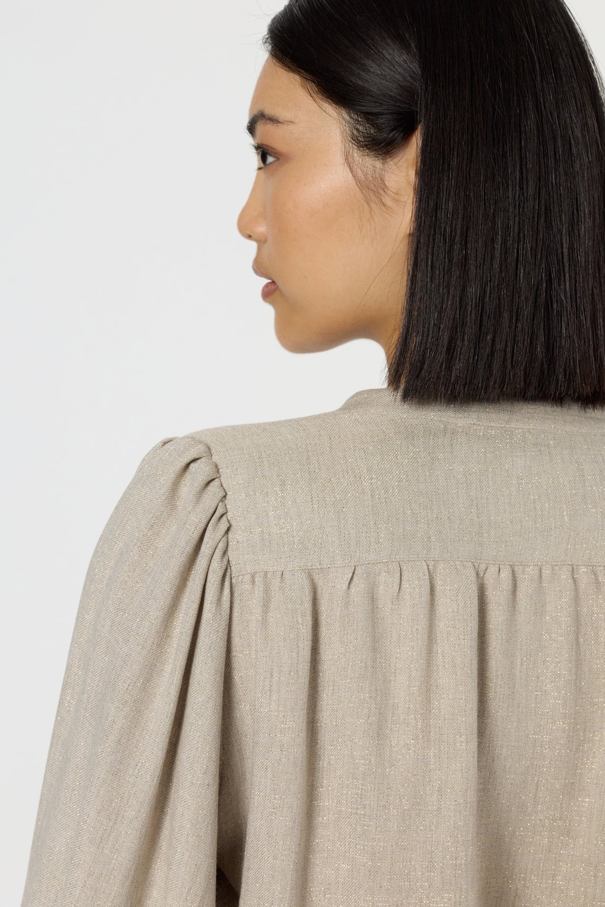 THE ALANA SHIRT WILL CAPTIVATE WITH ITS ROUND COLLAR, GATHERED SHOULDERS, AND BEIGE COLOR ADORNED WITH GOLDEN LUREX. IT IS CRAFTED FROM A FINE YET STRUCTURED FABRIC.