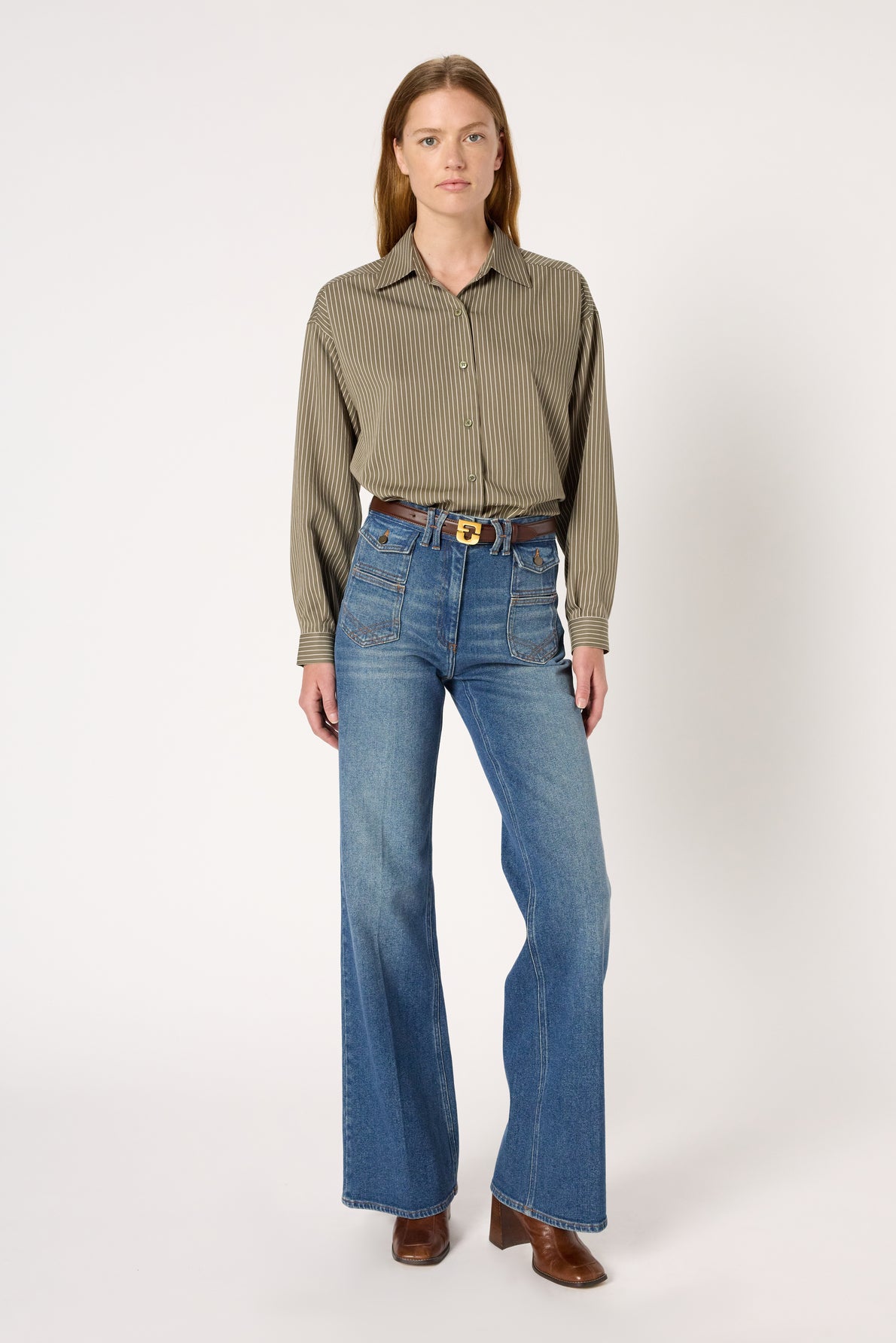 SHIRT WITH FINE WHITE STRIPES ON A KHAKI BACKGROUND FOR A CHIC, TRENDY LOOK. MADE FROM SOFT FABRIC THAT HOLDS ITS SHAPE.