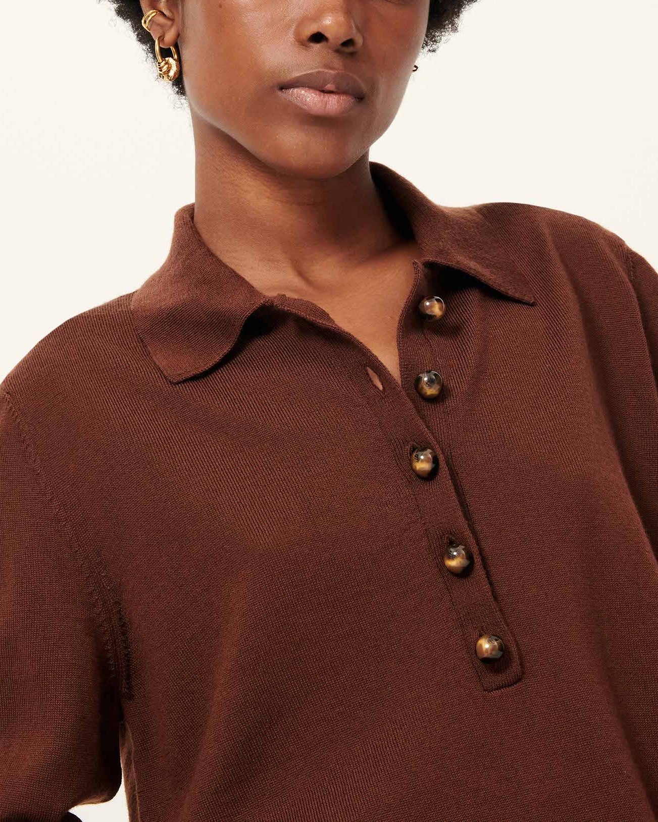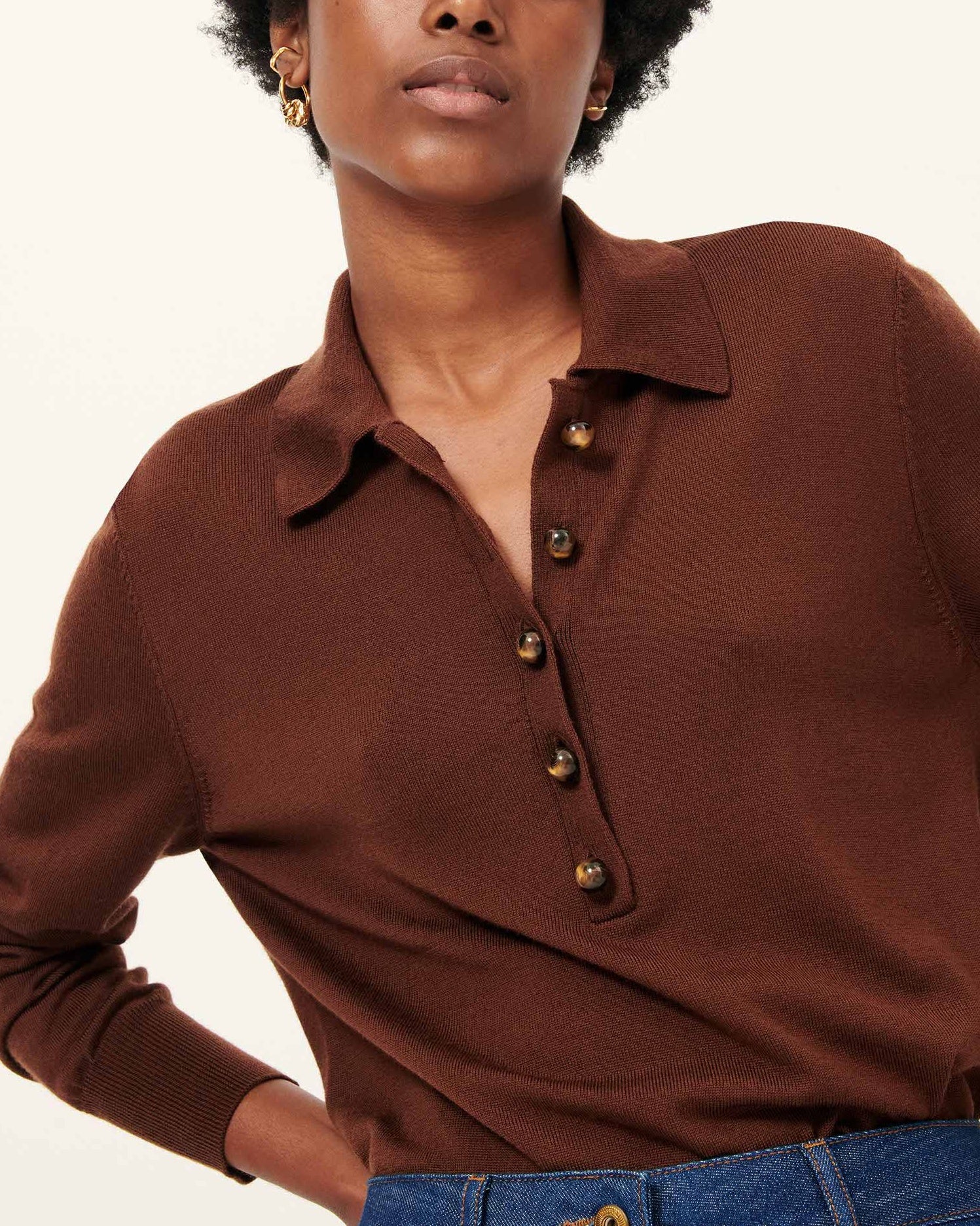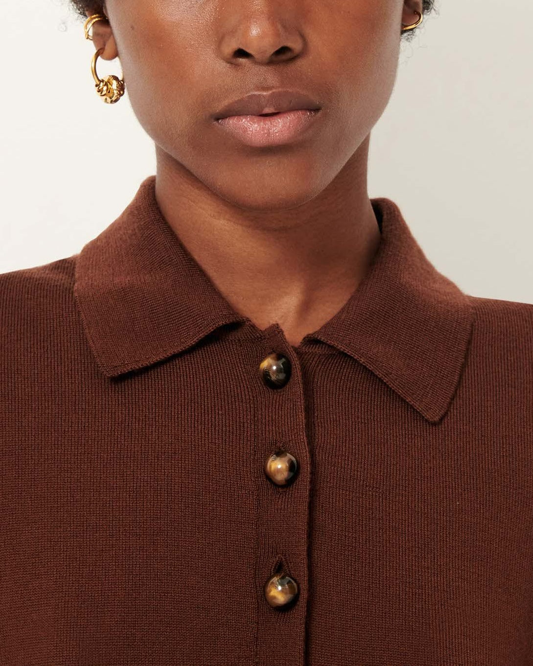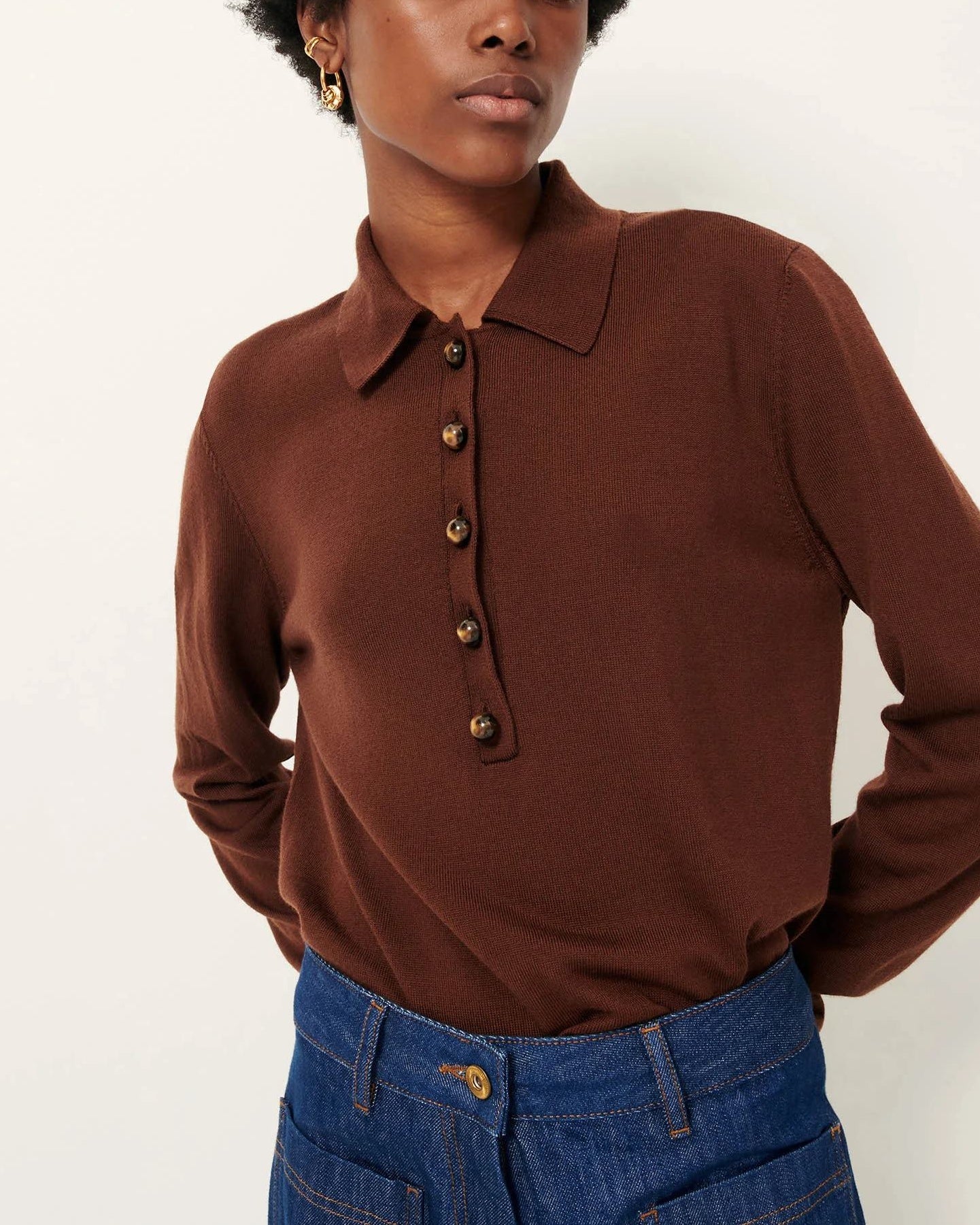 Long-sleeve polo-style jumper in fine merino wool knit with jewel buttons.