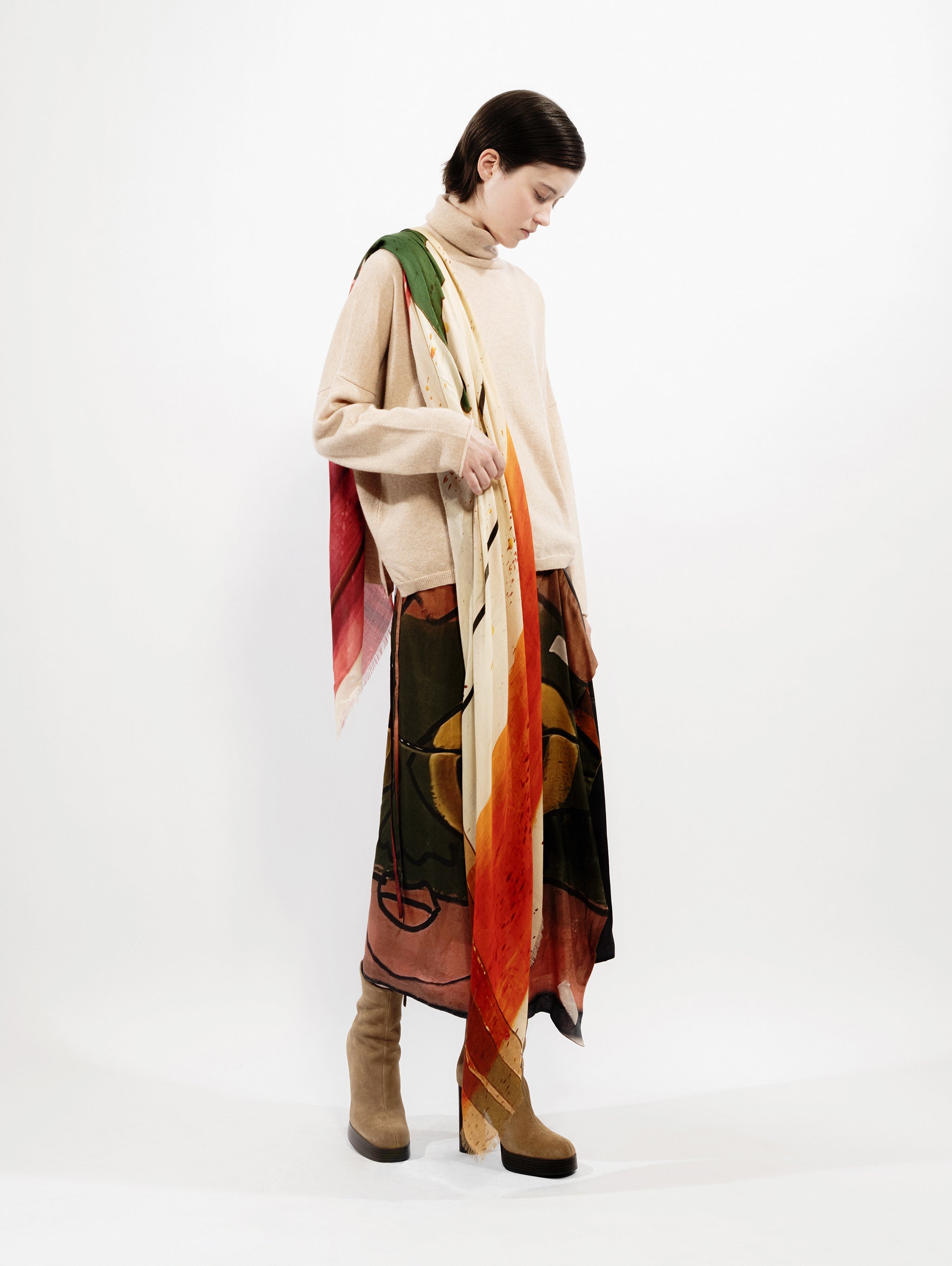Single face, square shaped scarf, made of a soft, fluid silk/modal fabric with an all-over, high-resolution printed, authentic visual.