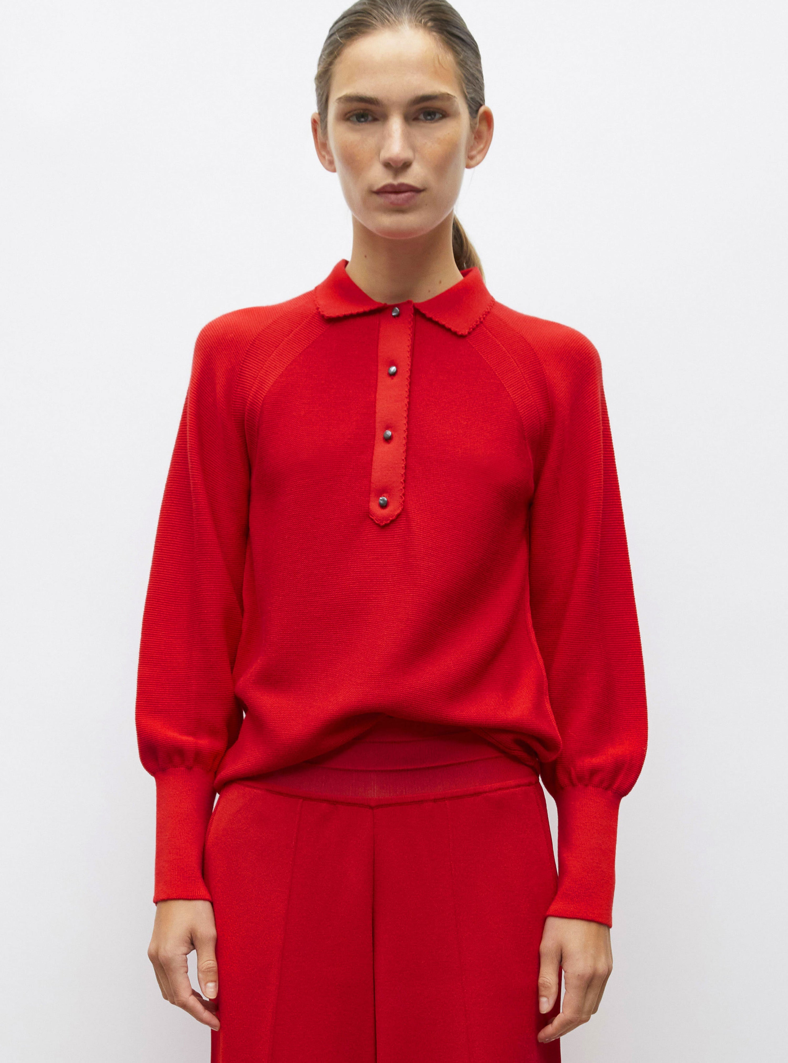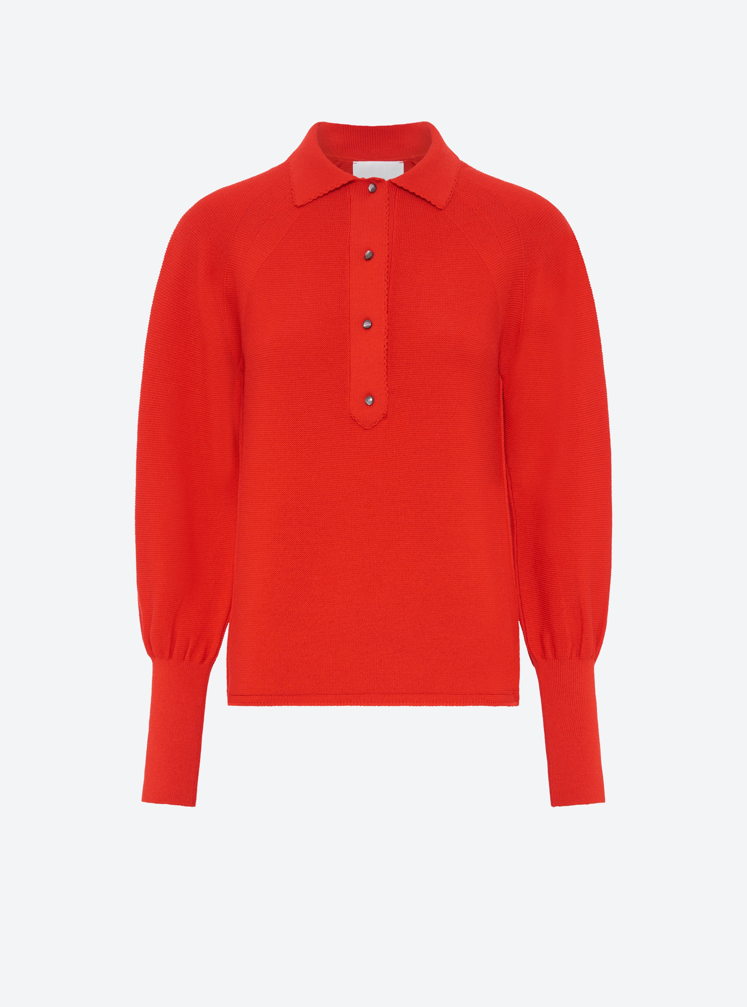 Made in Italy, Molli's garter-stitch knit top is extremely comfortable thanks to its extra-soft pure wool and raglan sleeves that are defined in the knitting. Its wide ribbed cuffs give it a lovely blousy look while the picot-edged polo collar and buttoned placket embellished with mother-of-pearl buttons all offer elegant finishing touches.