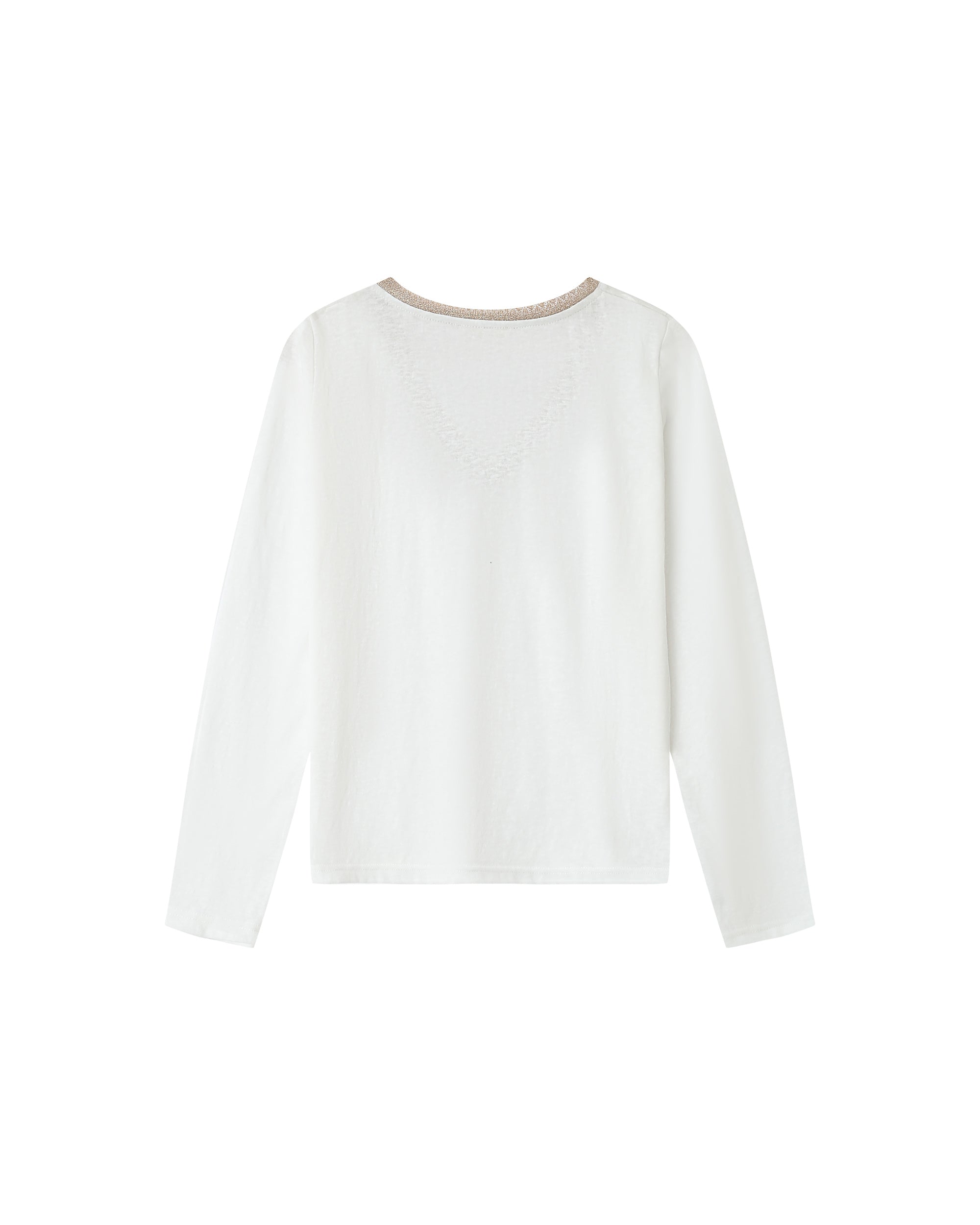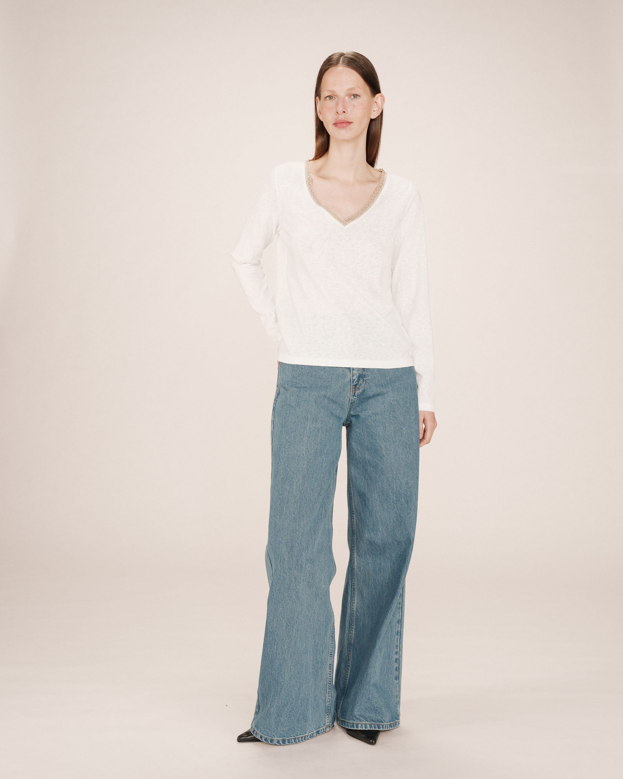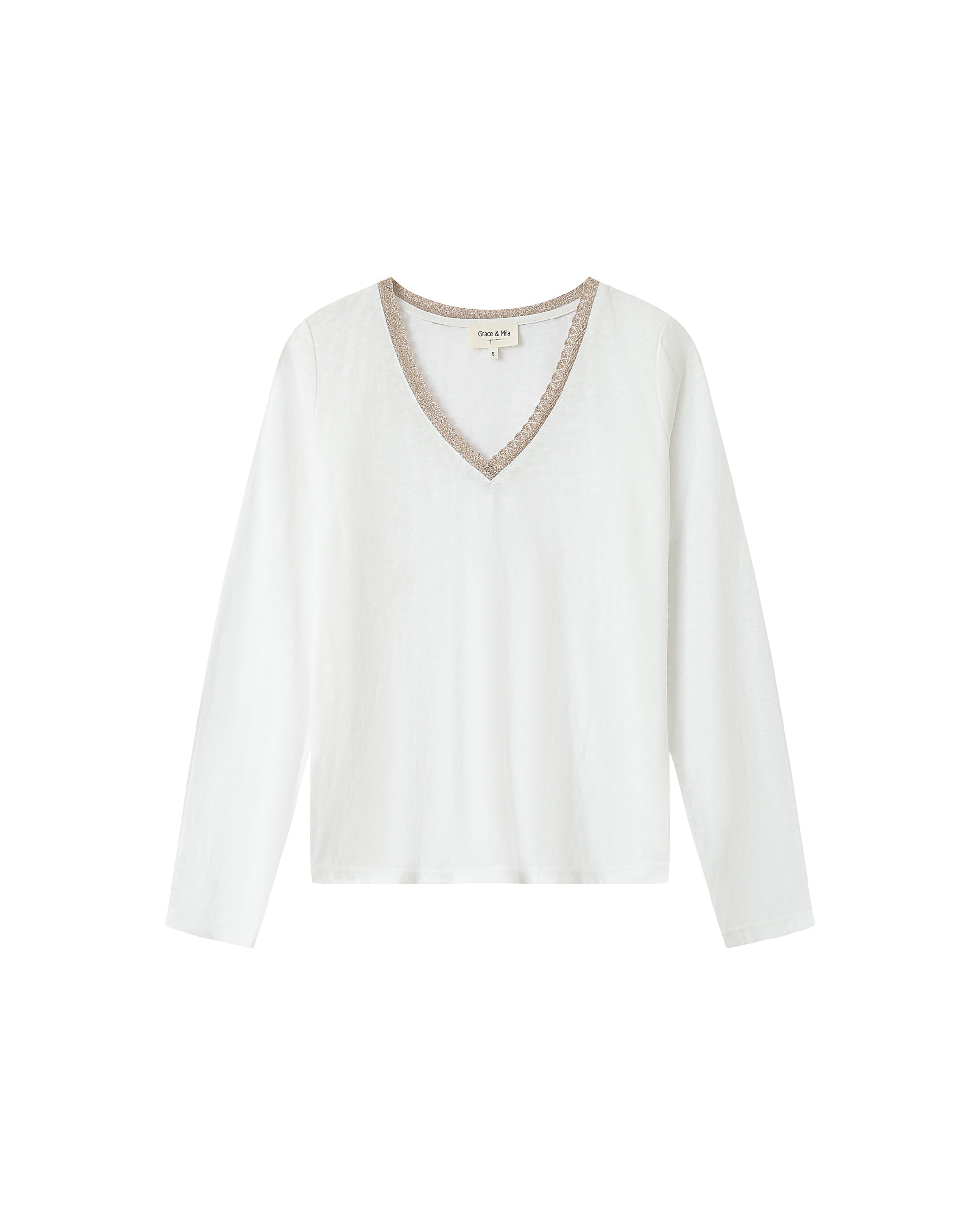 The Top with long sleeves Selton has a Lurex border in the V neckline, which elegantly underlines the neckline.The Top neckline V Selton is a basic of the Grace & Mila collection, easy to wear and associate.Bright and shiny, this long -sleeved model is invited in the locker room of each season.