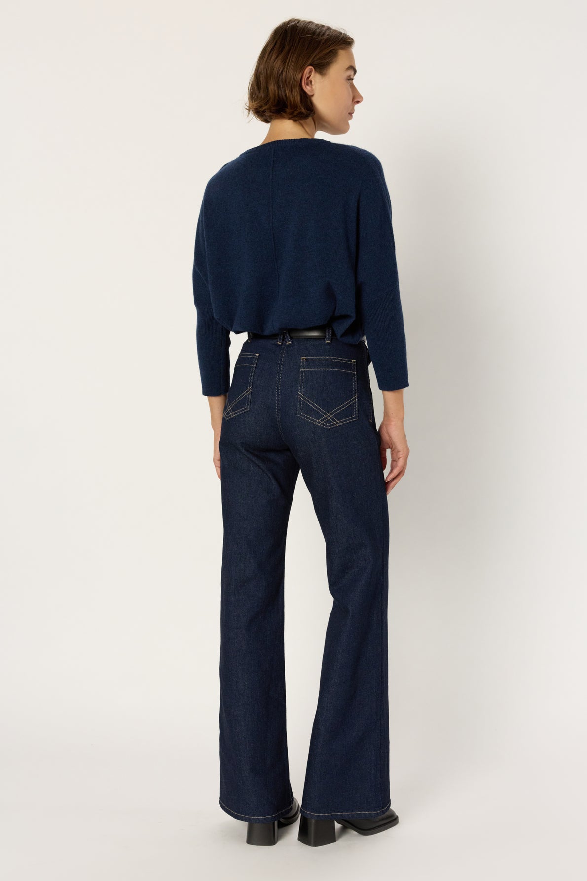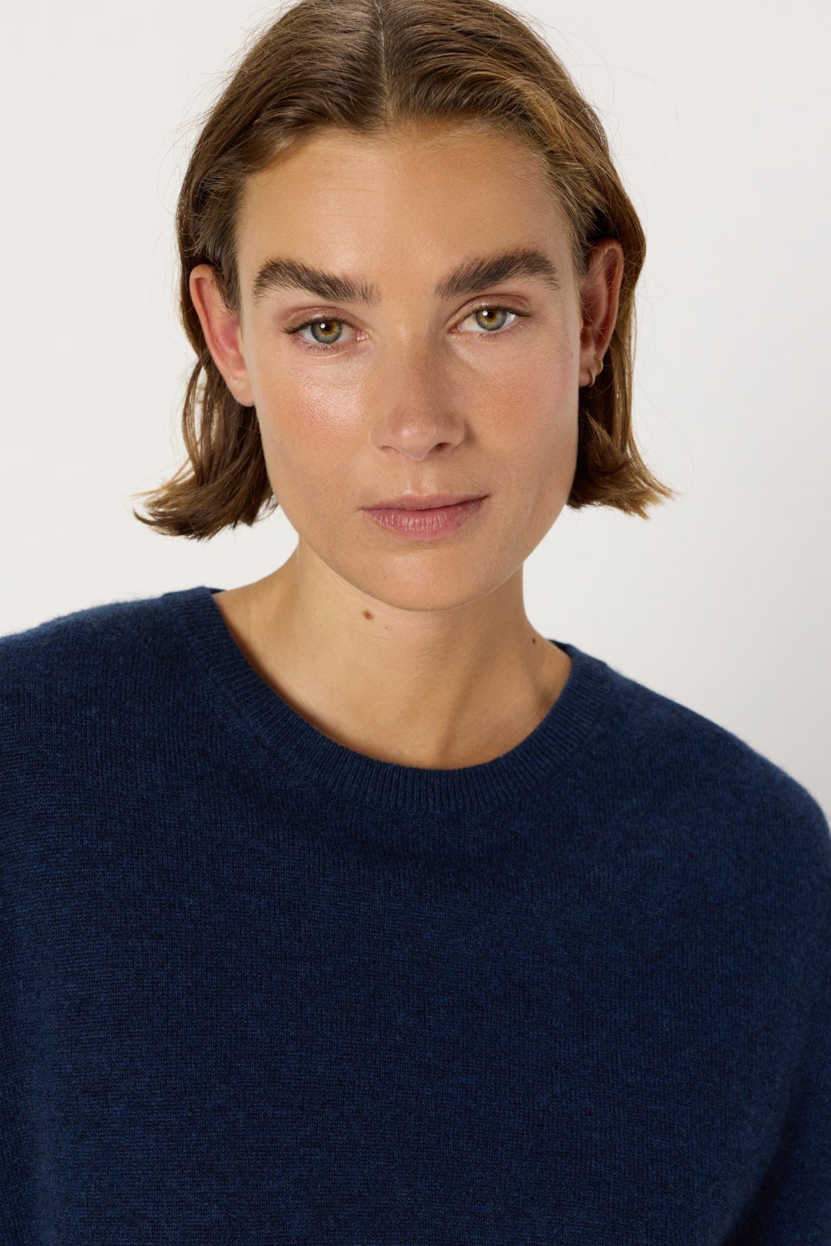 100% CASHMERE LOOSE-FITTING SWEATER FOR A SENSUAL, MODERN TOUCH AND ABSOLUTE COMFORT. AVAILABLE HERE IN INK COLOR, IT CAN BE WORN WITH A BLAZER FOR A DRESSY LOOK OR FOR A MORE CASUAL LOOK.