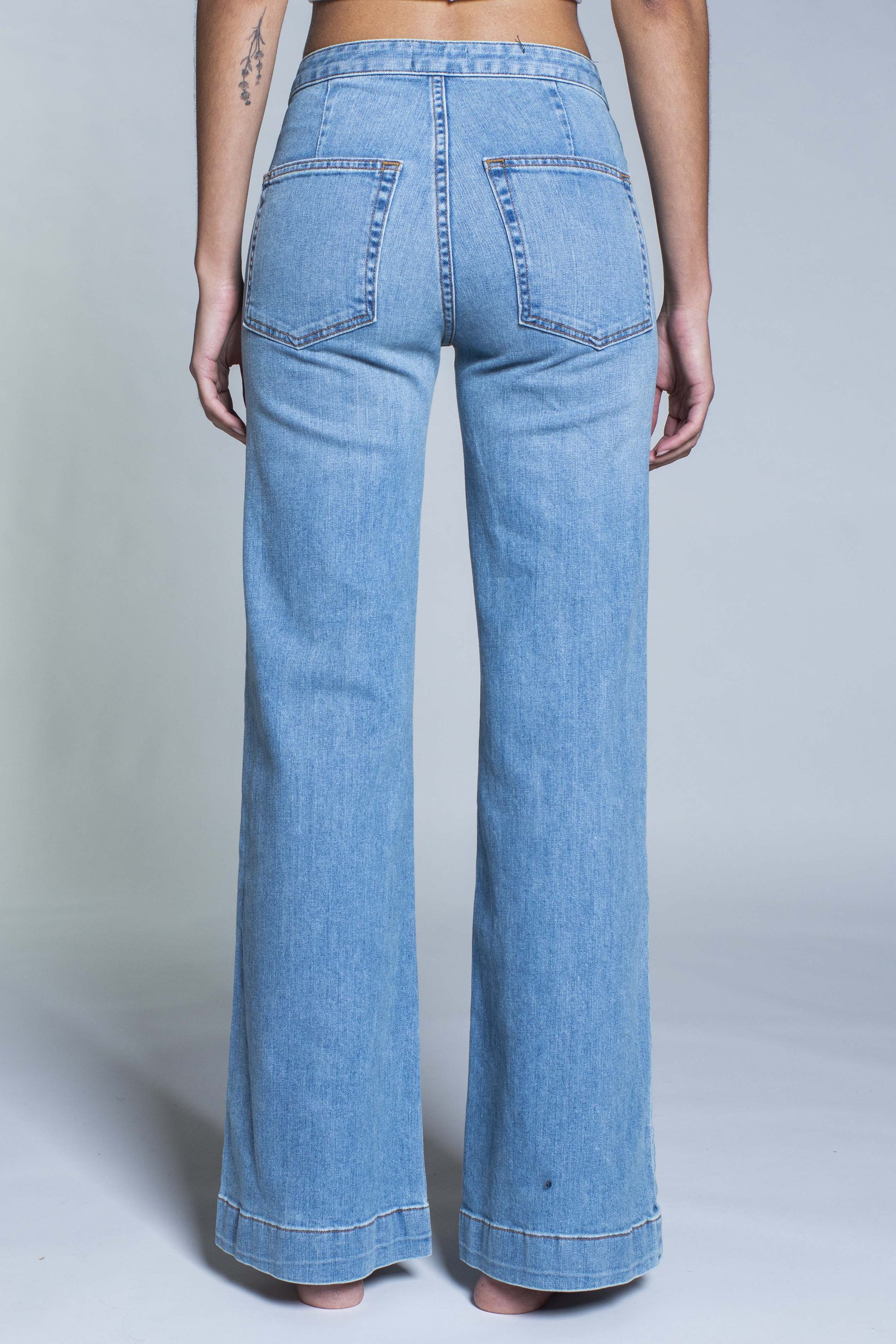 A true throwback silhouette with a modern edge. The Brick House Wide Leg sits high on the waist and falls into a dramatic wide leg with vintage-inspired panel seaming with horn buttons and hem detail. Made from soft Japanese indigo denim with a hint of stretch for comfort and structure in our Harbor wash.