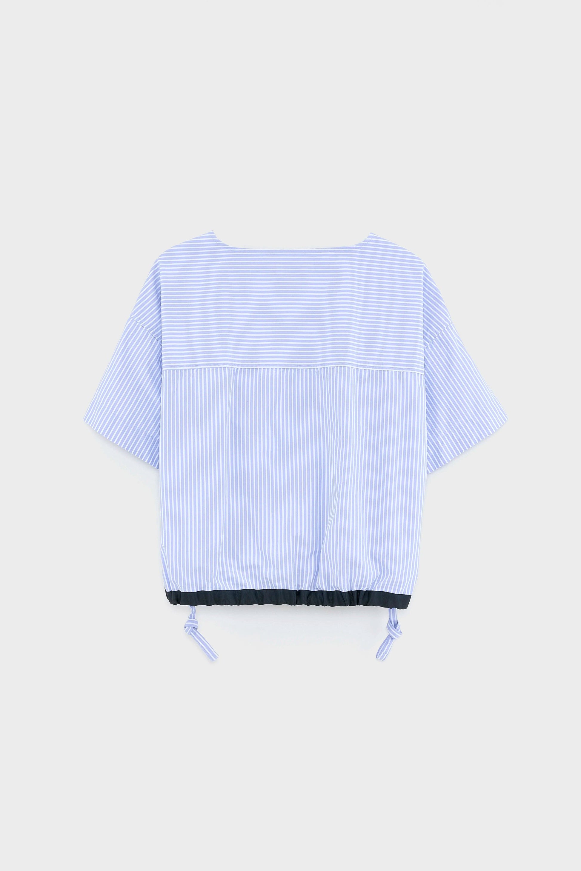 Relaxed short-sleeve blouse in lightweight cotton with light blue and white stripes, featuring a boxy cut, adjustable drawstring hem, and contrast trim.