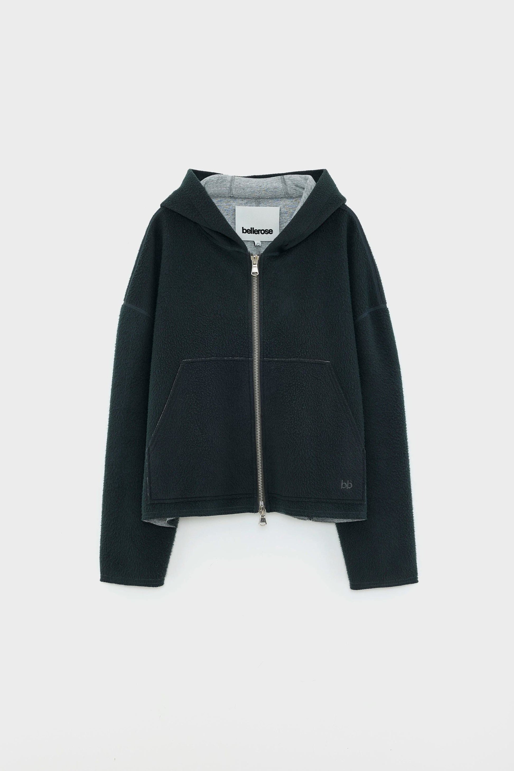 Oversized zip-up hoodie in light beige brushed fleece with kangaroo pockets and a raw edge hem.