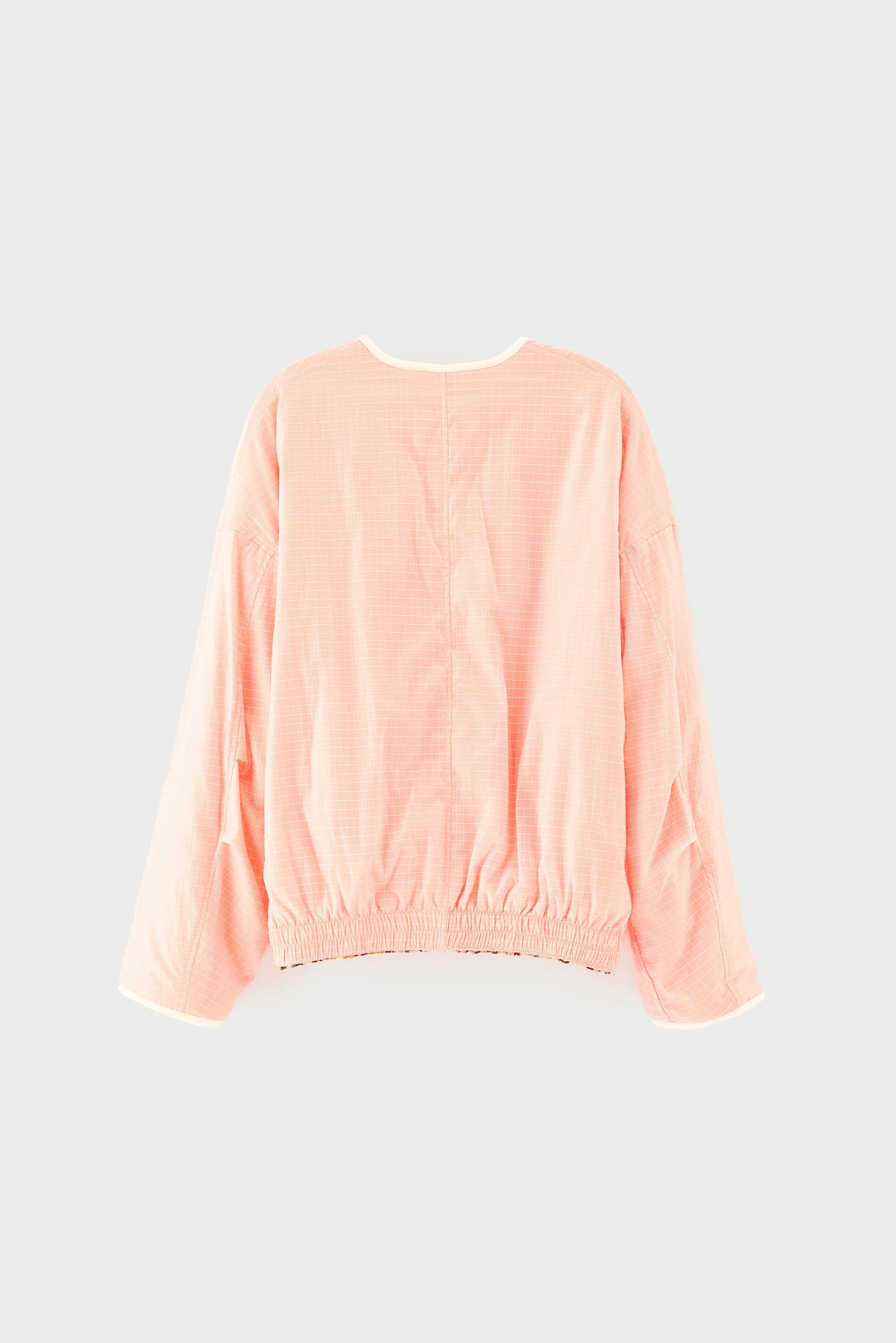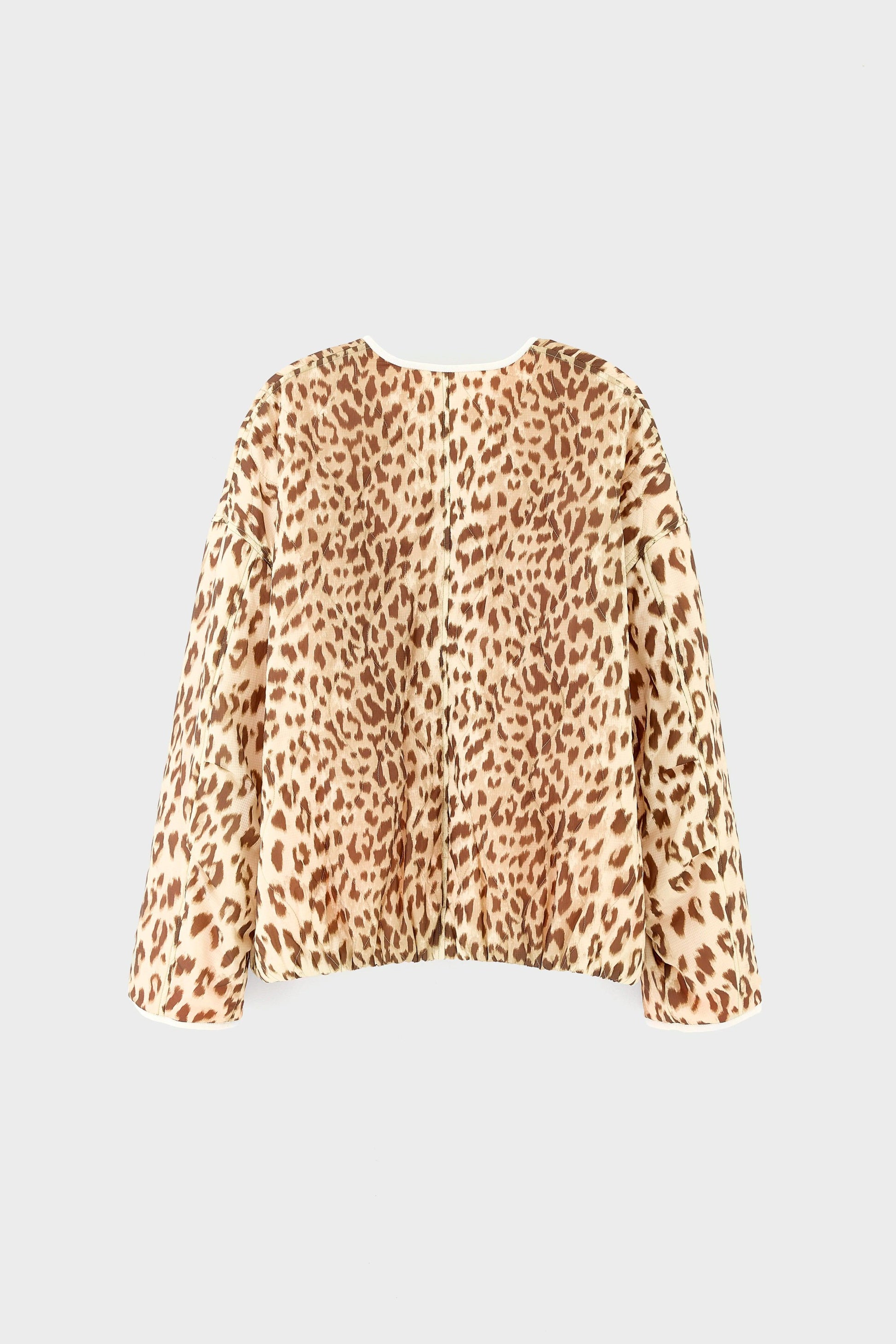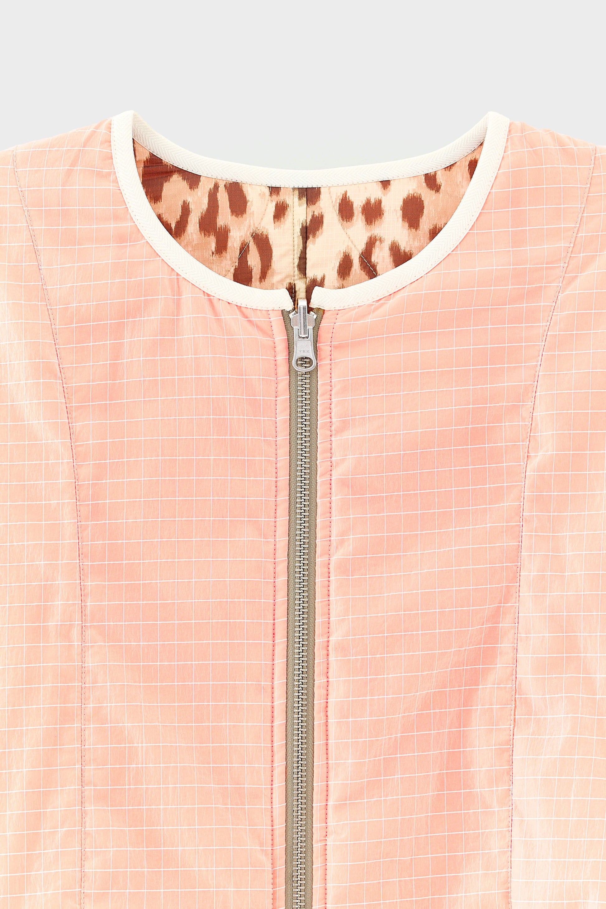 Reversible relaxed jacket with bold leopard print on one side and neon coral grid lining on the other, finished with an elasticated hem.