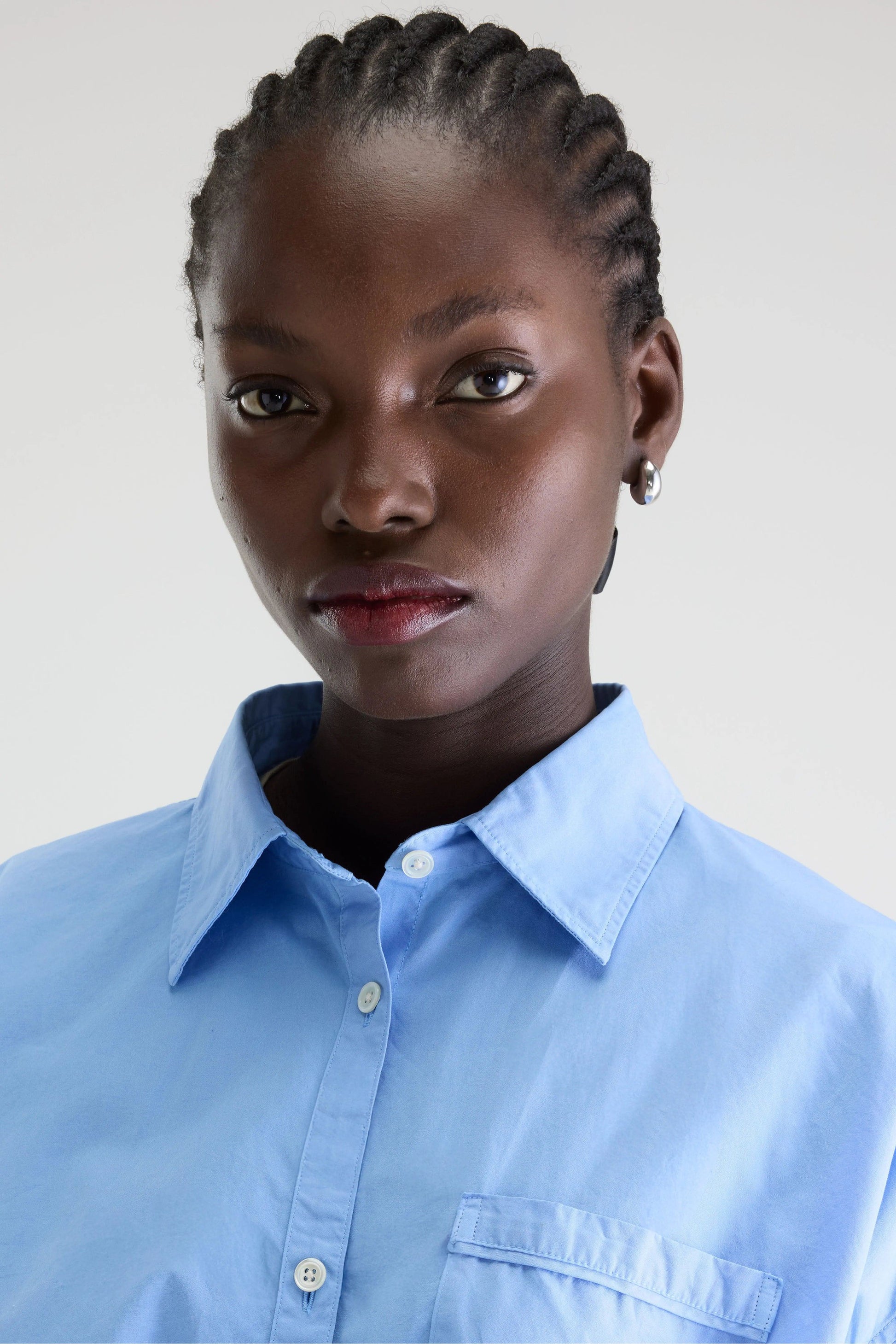 Relaxed long-sleeve cropped shirt in blue poplin cotton with an elasticated hem.