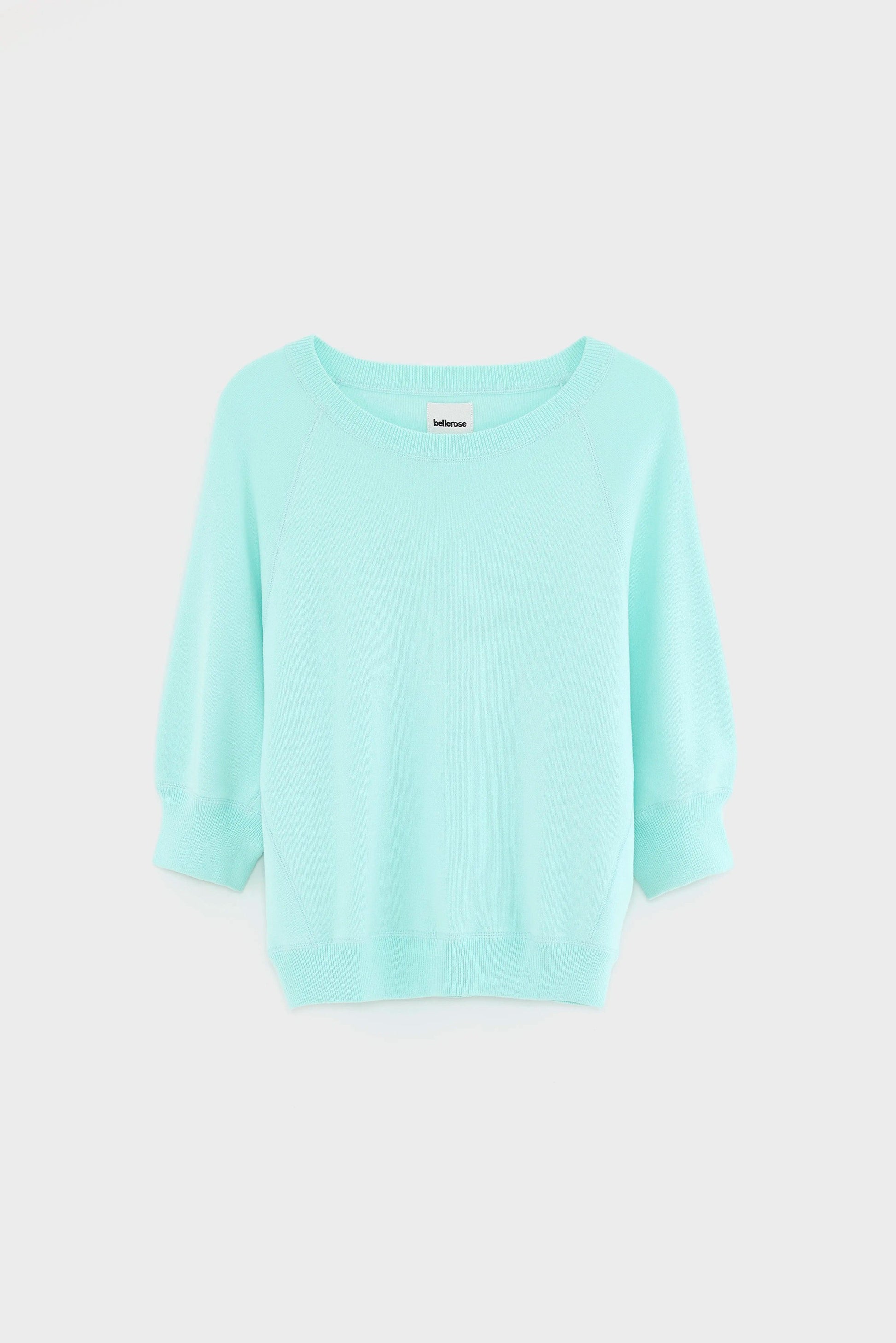 - Double rib trims at hem, cuffs, and neckline to hold shape