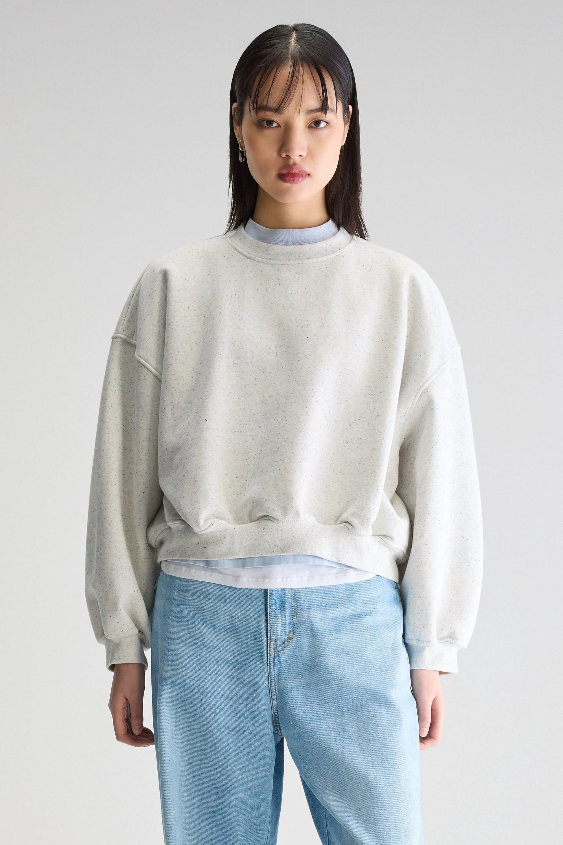 Relaxed cropped sweatshirt with dropped shoulders and long voluminous sleeves made from grey cotton jersey with blue neps.