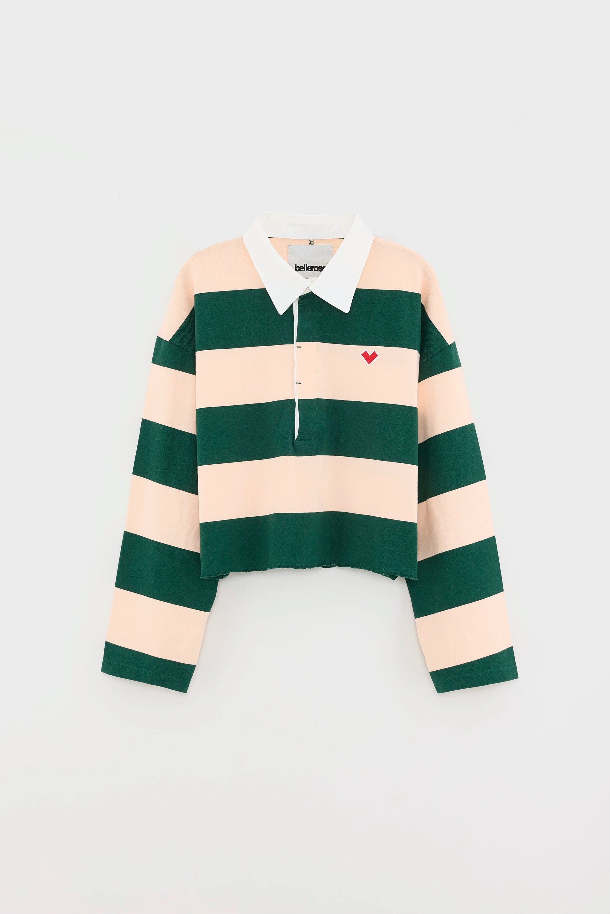 Cropped oversized rugby t-shirt in bottle green and light pink stripes with a white contrast collar, button placket, long sleeves, embroidered chest detail, and raw-edge hem.