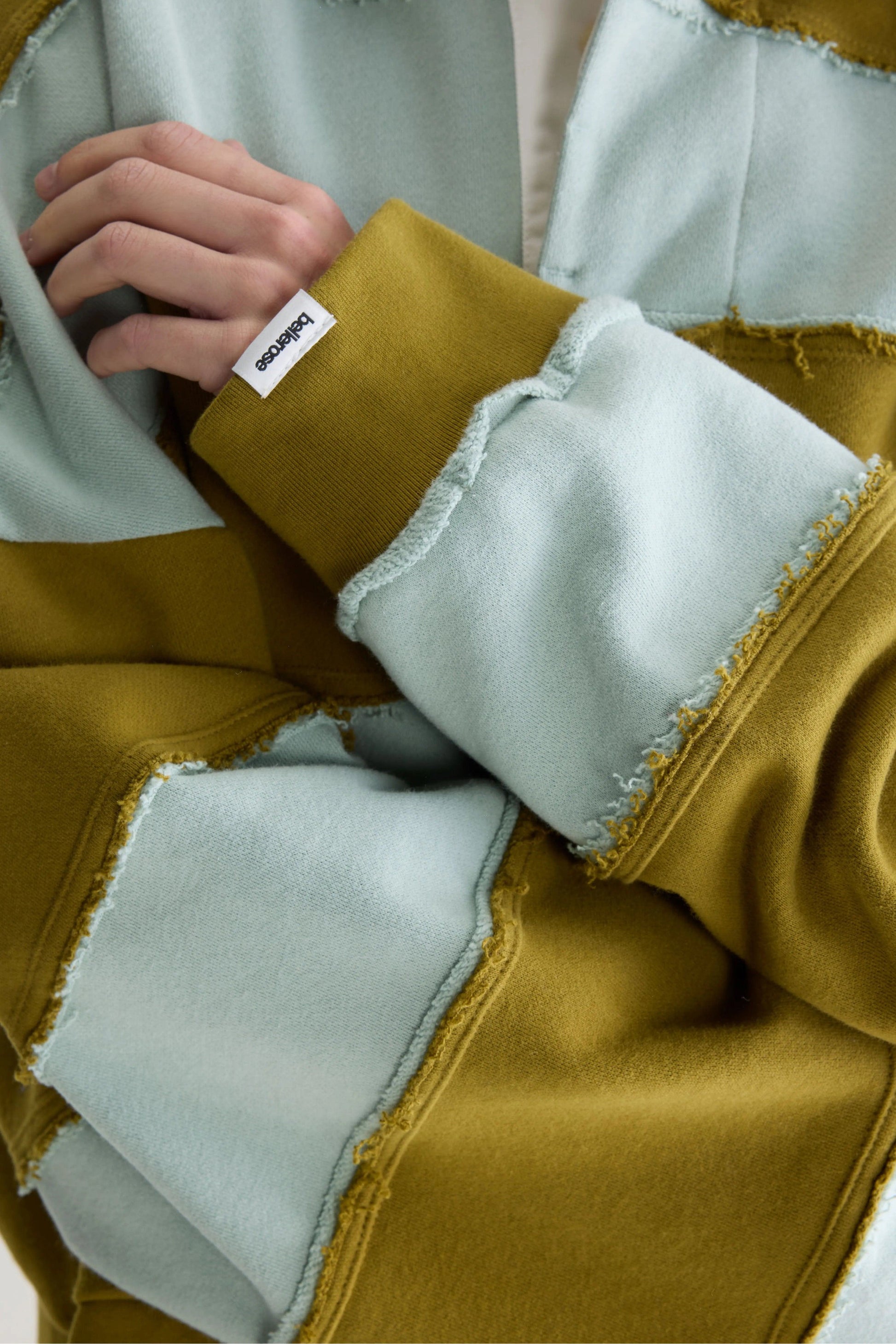 Imagine slipping into a garment that feels soft against the skin yet presents a refined silhouette. The cotton knit embraces movement with an oversized, relaxed shape, perfect for layering over a tee or under a structured jacket. The bold khaki and pale mint stripes sweep across the body and sleeves, while a white poplin collar with a hidden placket adds a touch of tailored finesse. Subtle touches—like raw inseam detailing where the stripes meet—give texture and a handcrafted feel that elevates everyday outfits from simple to statement.