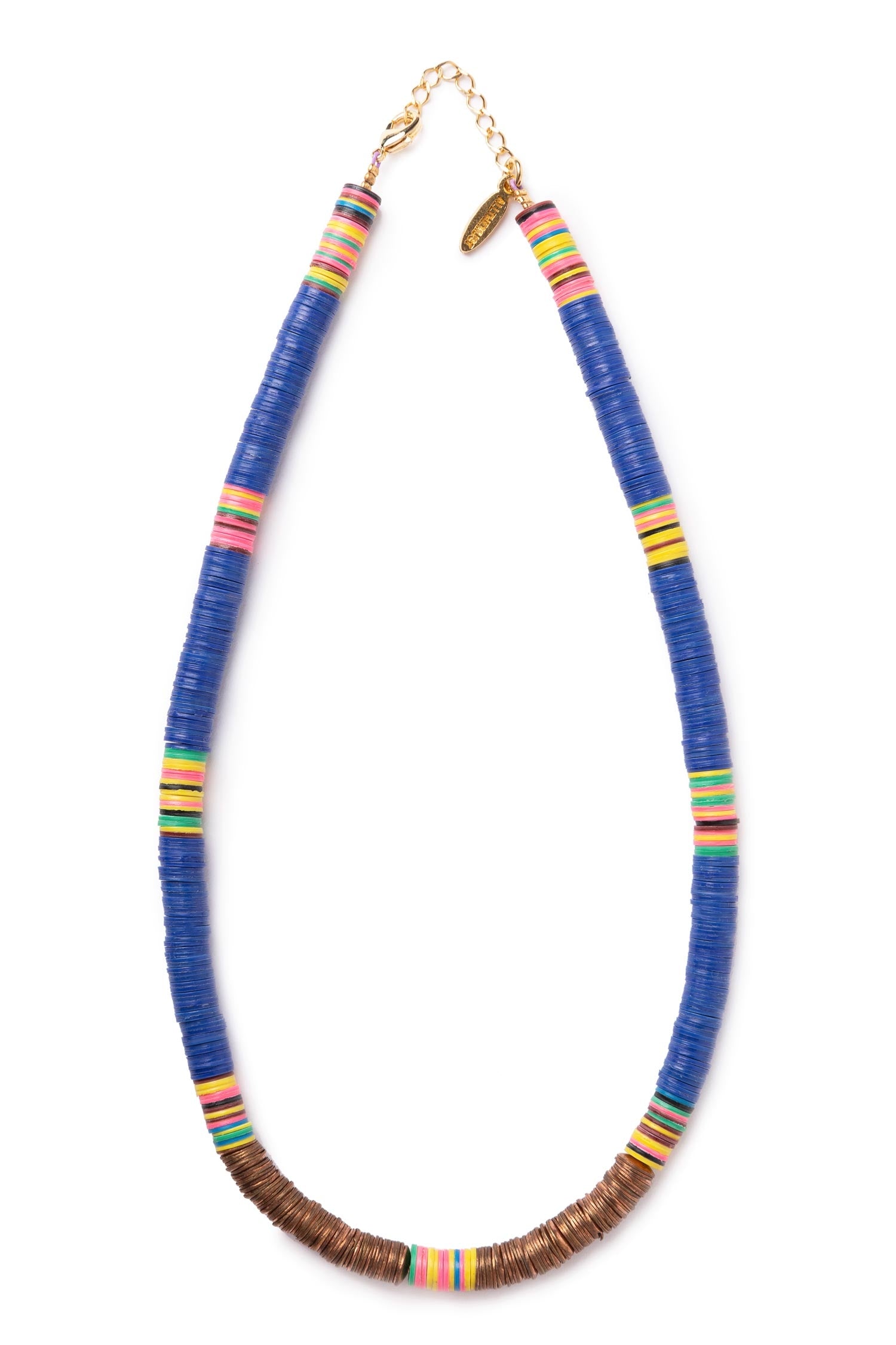 Opt for an elegant mix of jewel hues with this Brass Necklace from ALL THE MUST. The design made of the recycled vinyl disc, copper, shell. Style with a dark-coloured turtle neck top for a chic silhouette.