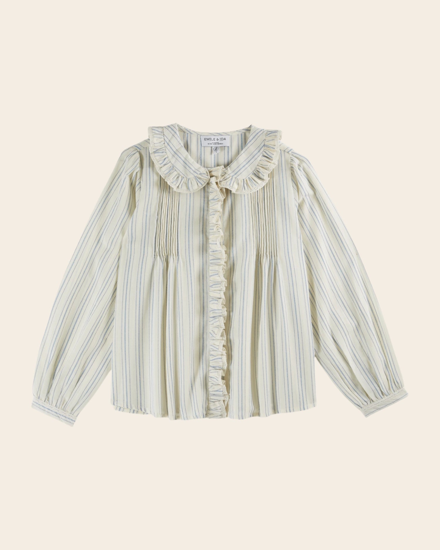Off-white cotton blouse woven with blue threads forming lines and dotted lines.