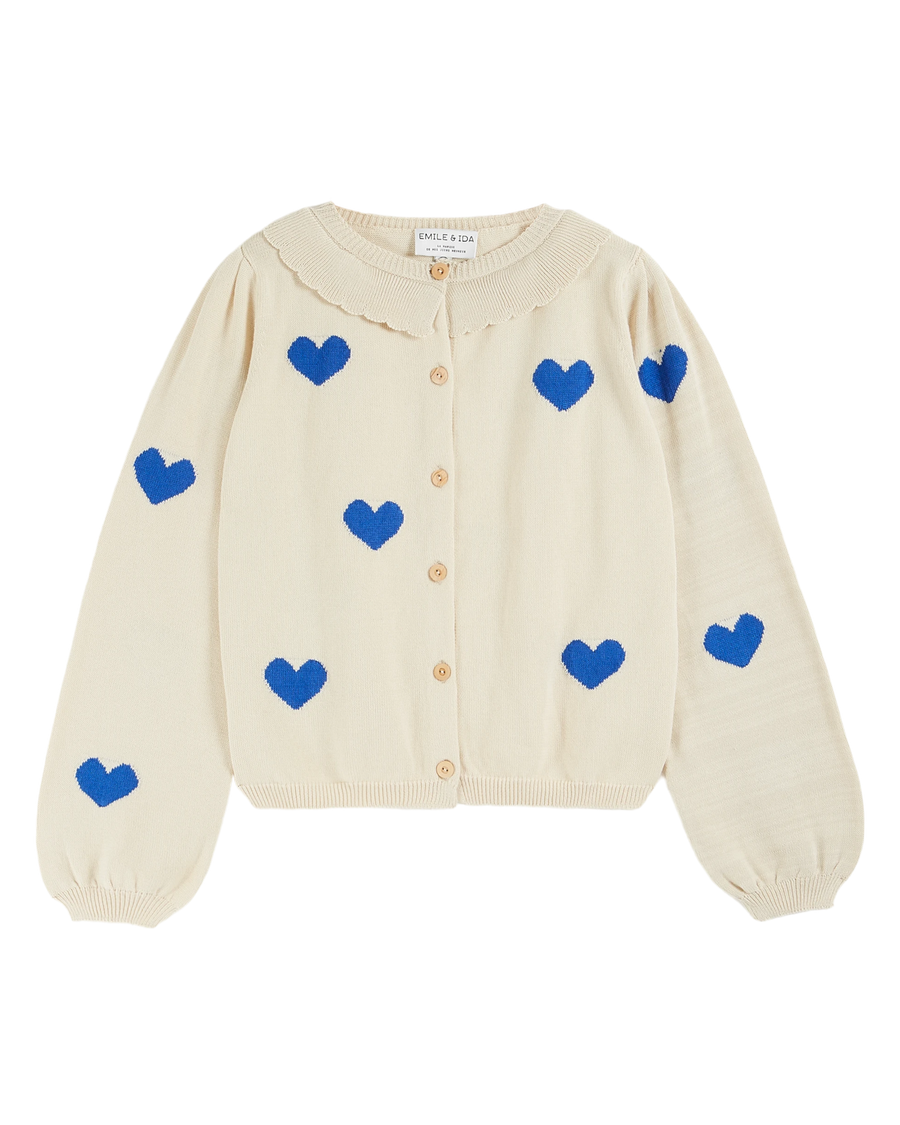 Intarsia jacquard cardigan in ecru organic cotton punctuated by blue hearts.