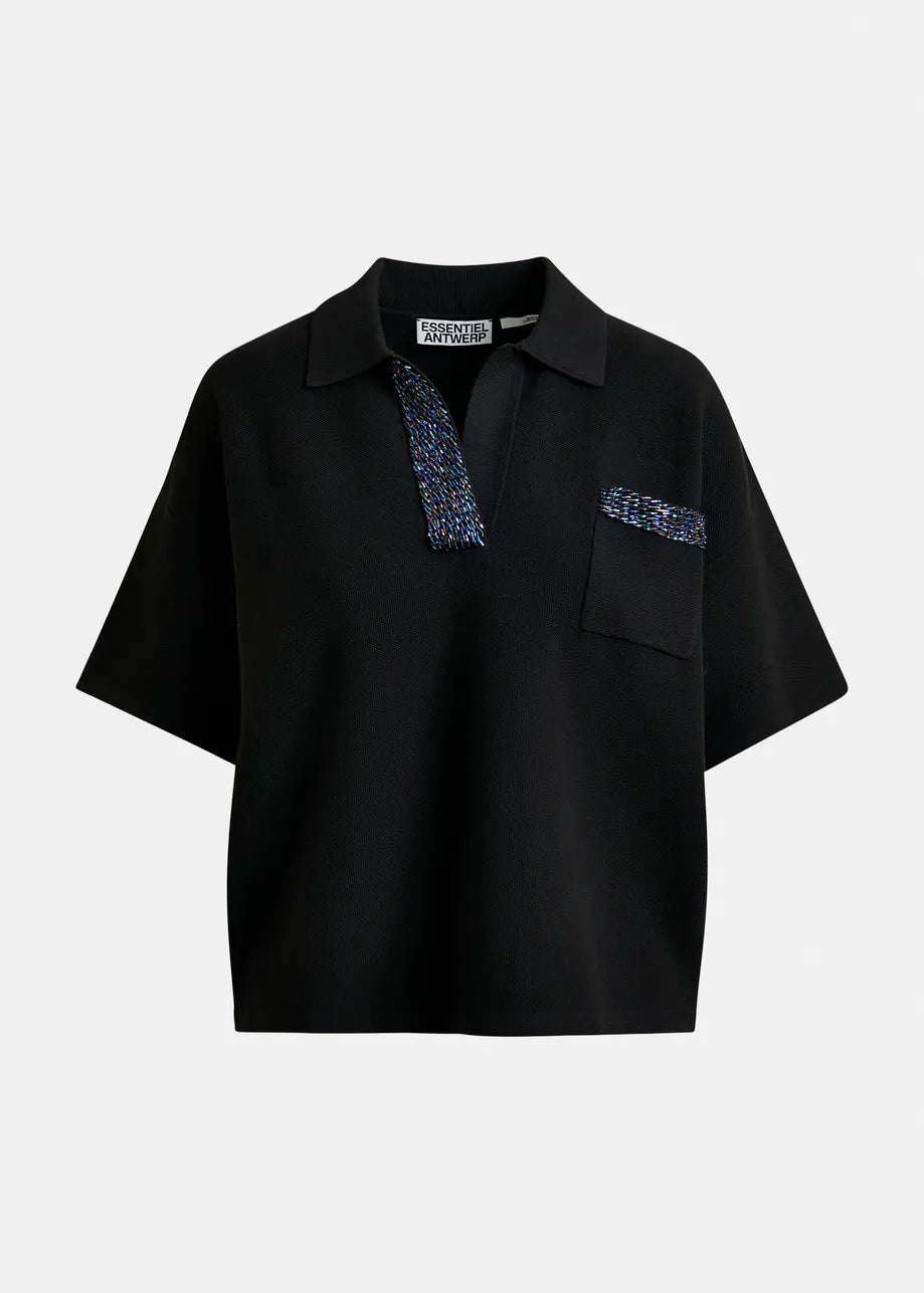 Finely knitted top is designed with a chic polo-style collar in a contrasting color, adding a touch of elegance. It features a relaxed fit and a chest pocket. The collar is adorned with delicate beaded embellishments.