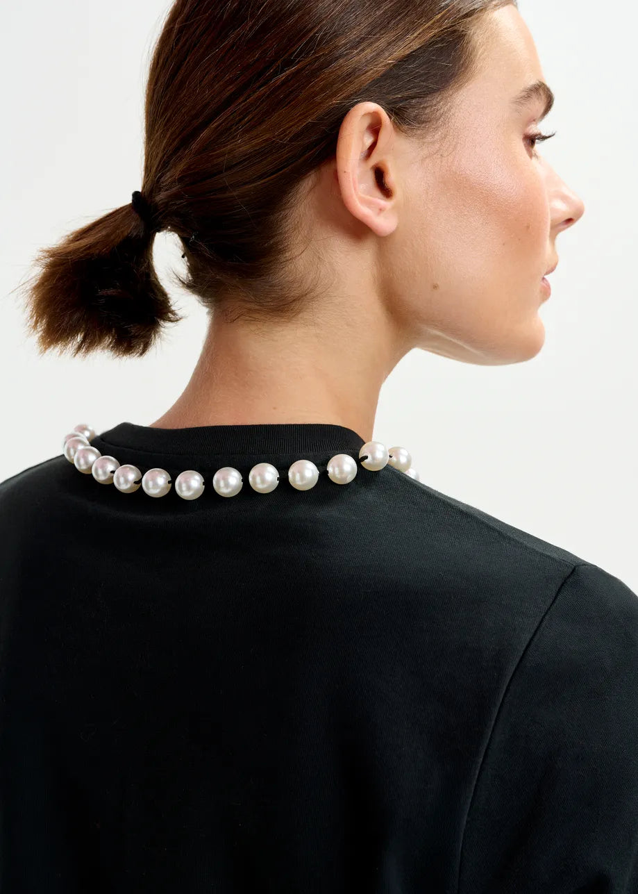 Relaxed fit T-shirt is cut from 100% cotton. The vertically printed HUH? across the front introduces an irreverent edge, while bead embellishments at the neckline add a subtle touch of shine. Perfect for city strolls or layered under outerwear, its a statement-making piece with a nonchalant attitude.